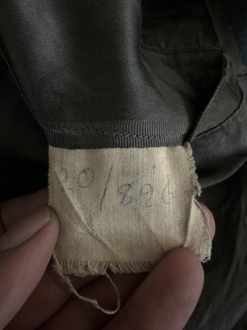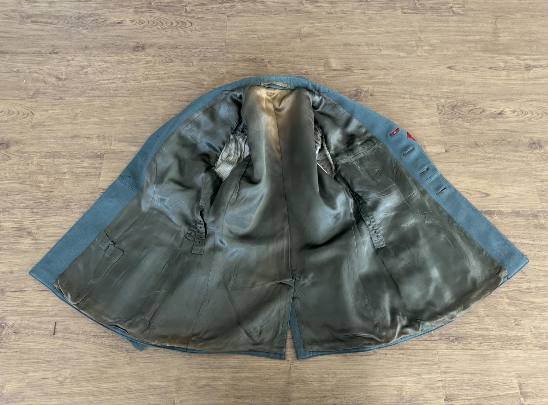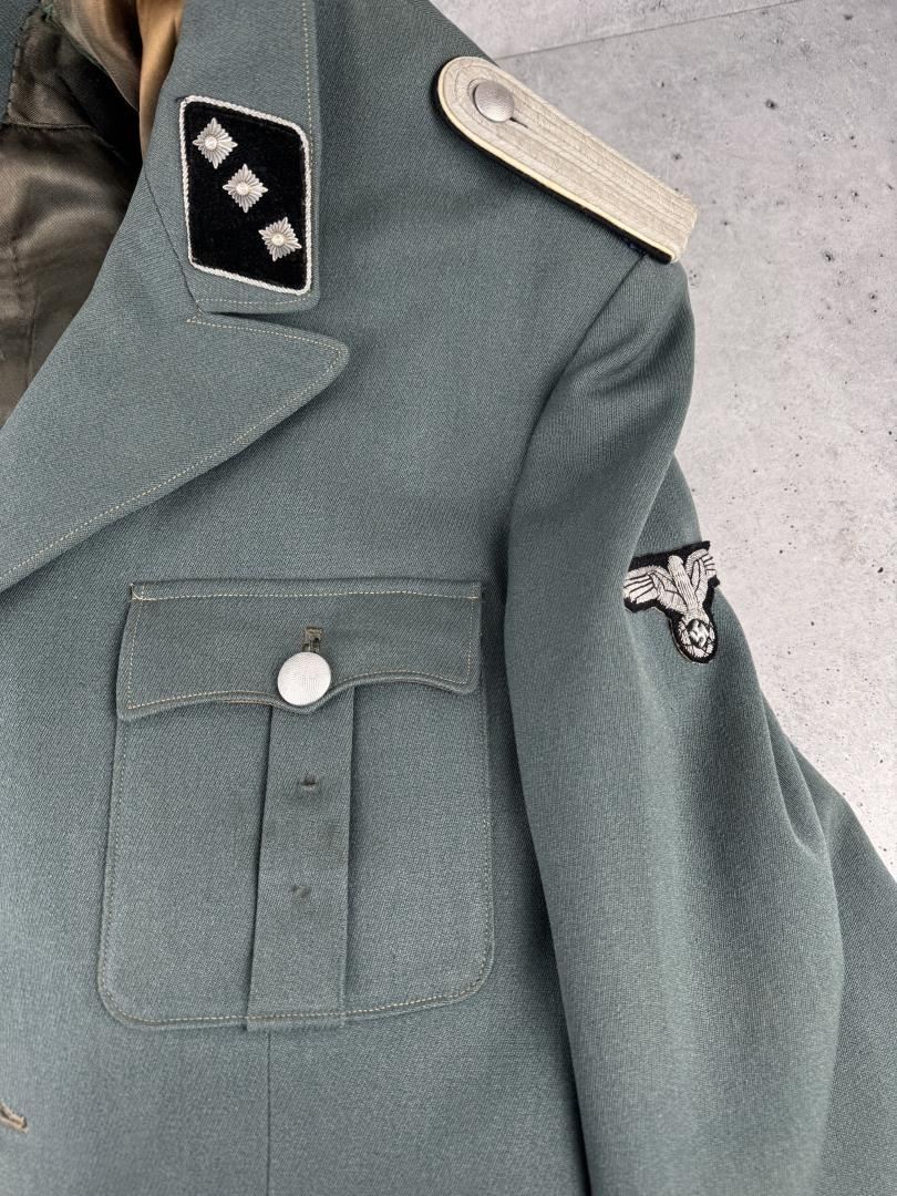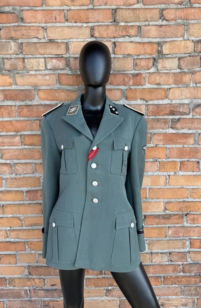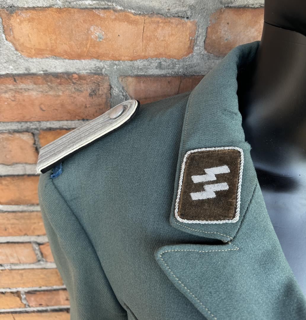 The uniform is not named. Custom tailored private purchase tunic. The eagle on the sleeve may have been added at a later date (the underthread of the swastika fluoresces under black light). Original and period Adolf Hitler SS Division cuff title. Collar tabs are also original- SS tab is faded from sun exposure. The rank tab is original, but added later than the SS tab. Shoulder board loops have been replaced at some point as the fabric fluoresces under black light. Silk lining as well as pocket backs and pocket rims. Sleeves are lined with blue and black silk. The Iron Cross is original silver with iron core, but is broken into several pieces. Interior holdout pocket possibly for a pistol. Left cuff has a repair. Overall a nice honest example of an SS dress uniform. 19 1/4" pit to pit by 32" long.