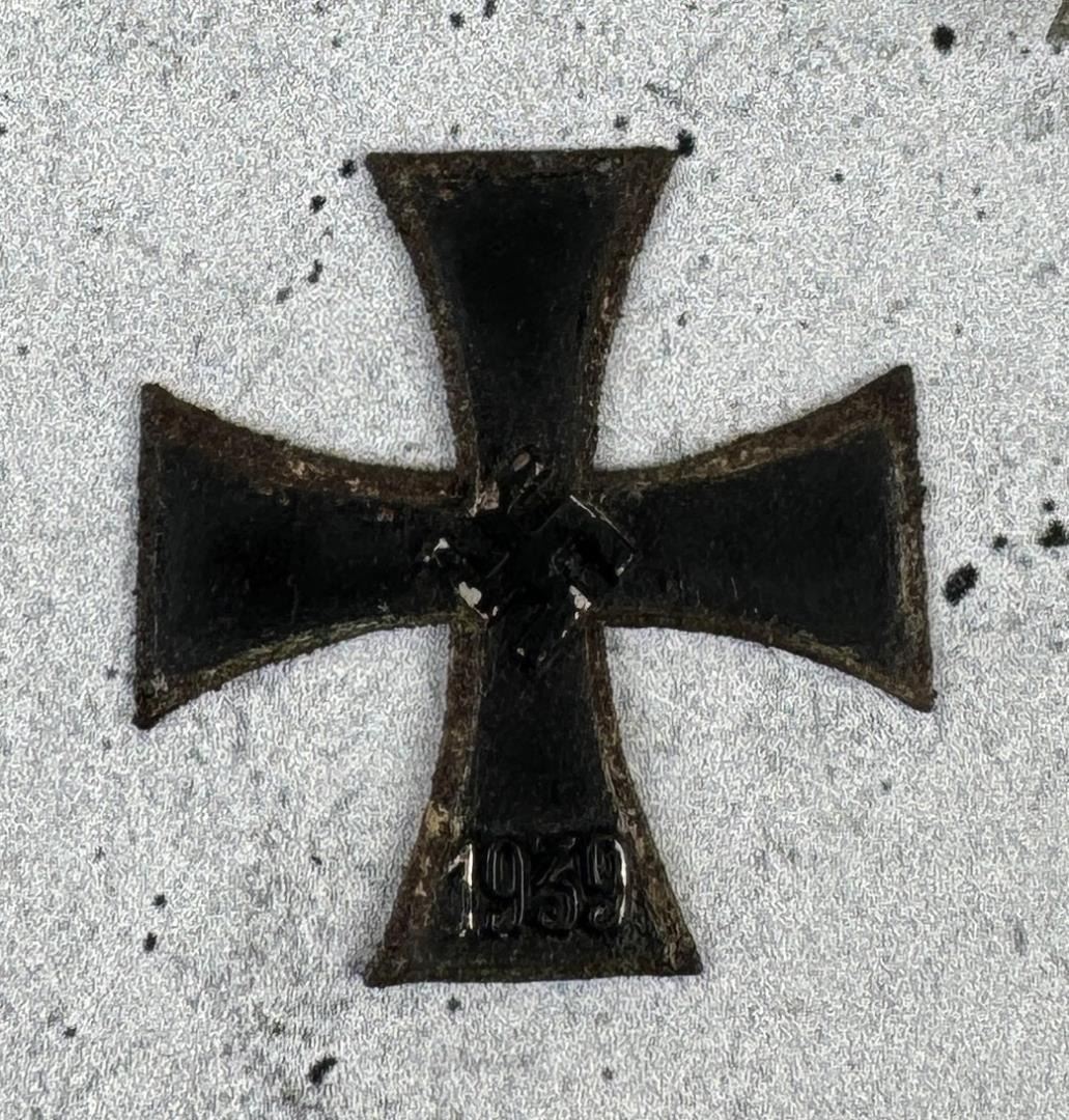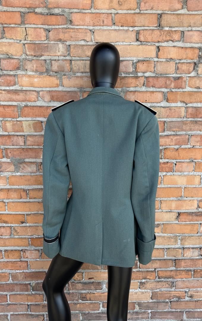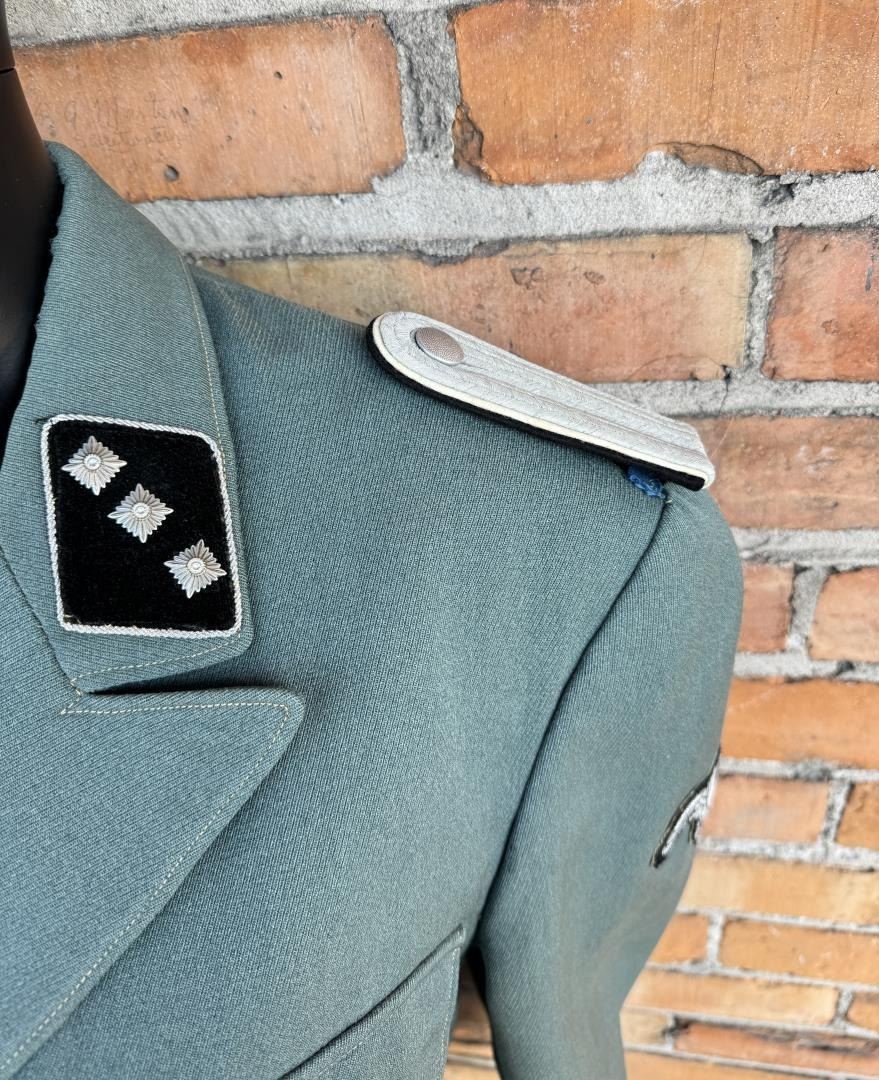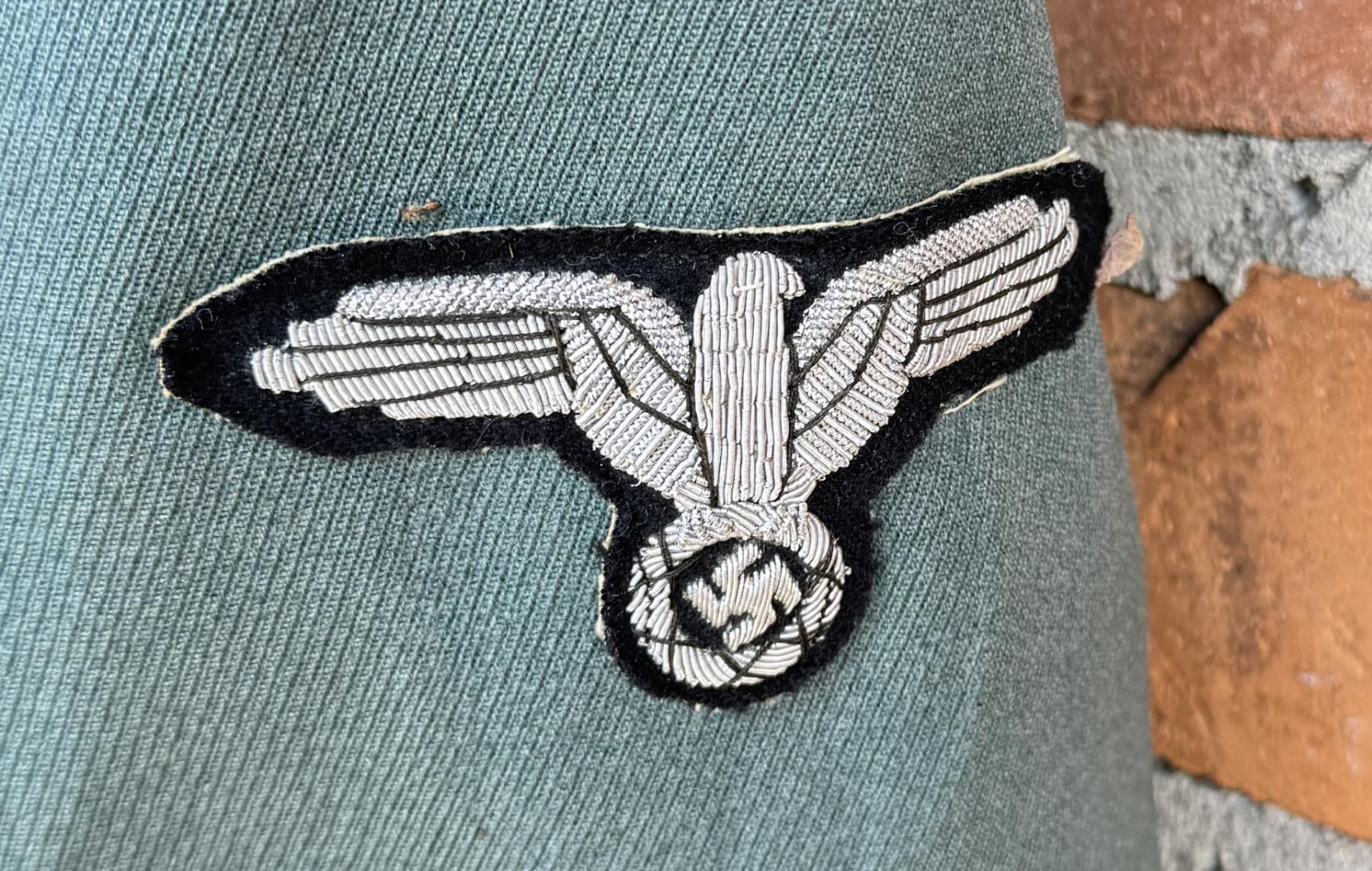 The uniform is not named. Custom tailored private purchase tunic. The eagle on the sleeve may have been added at a later date (the underthread of the swastika fluoresces under black light). Original and period Adolf Hitler SS Division cuff title. Collar tabs are also original- SS tab is faded from sun exposure. The rank tab is original, but added later than the SS tab. Shoulder board loops have been replaced at some point as the fabric fluoresces under black light. Silk lining as well as pocket backs and pocket rims. Sleeves are lined with blue and black silk. The Iron Cross is original silver with iron core, but is broken into several pieces. Interior holdout pocket possibly for a pistol. Left cuff has a repair. Overall a nice honest example of an SS dress uniform. 19 1/4" pit to pit by 32" long.