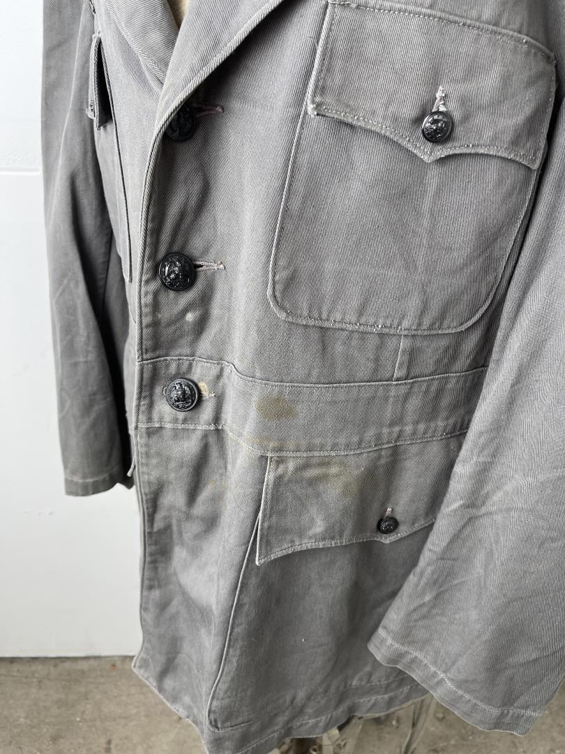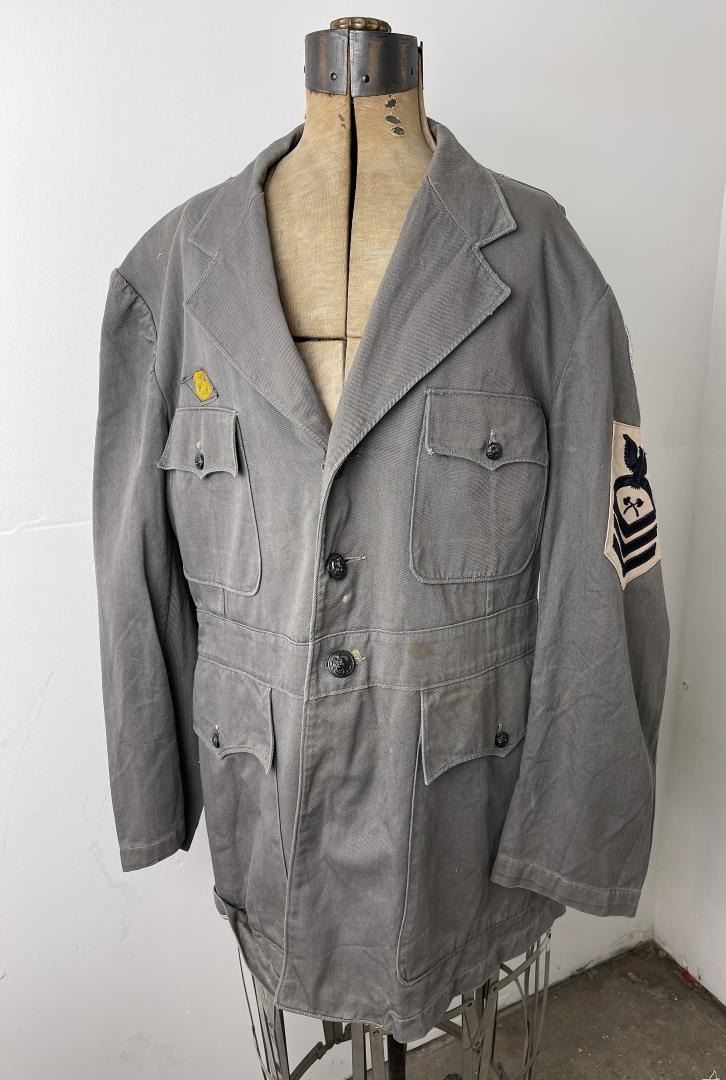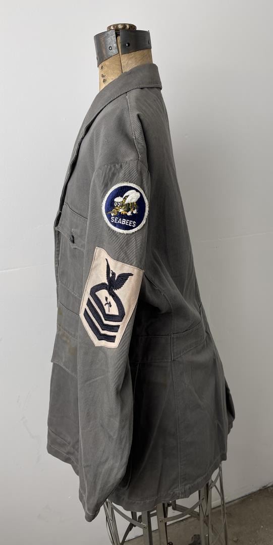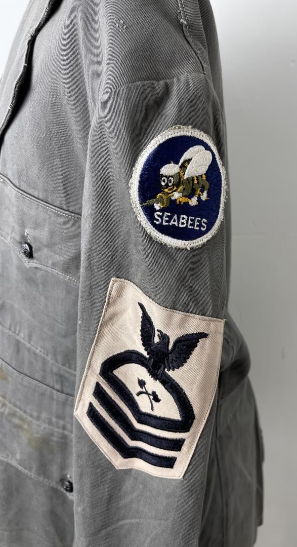 Nice uniform. Patches on sleeves indicates that the uniform was used by the Seabees, the specialty being carpenters mate.