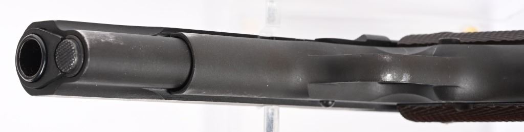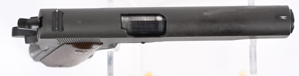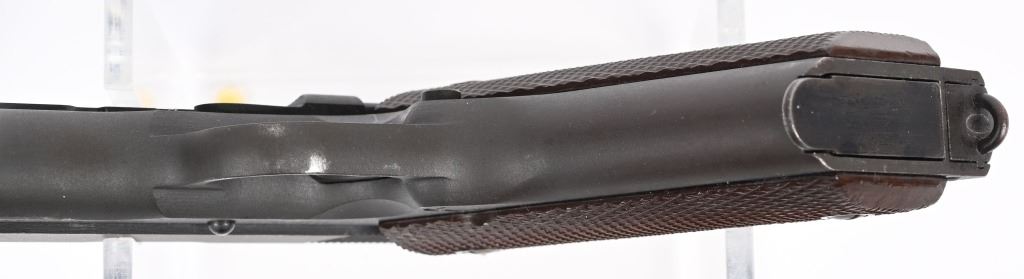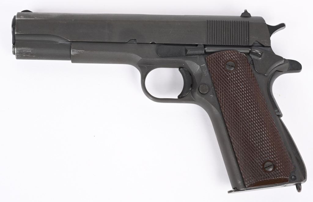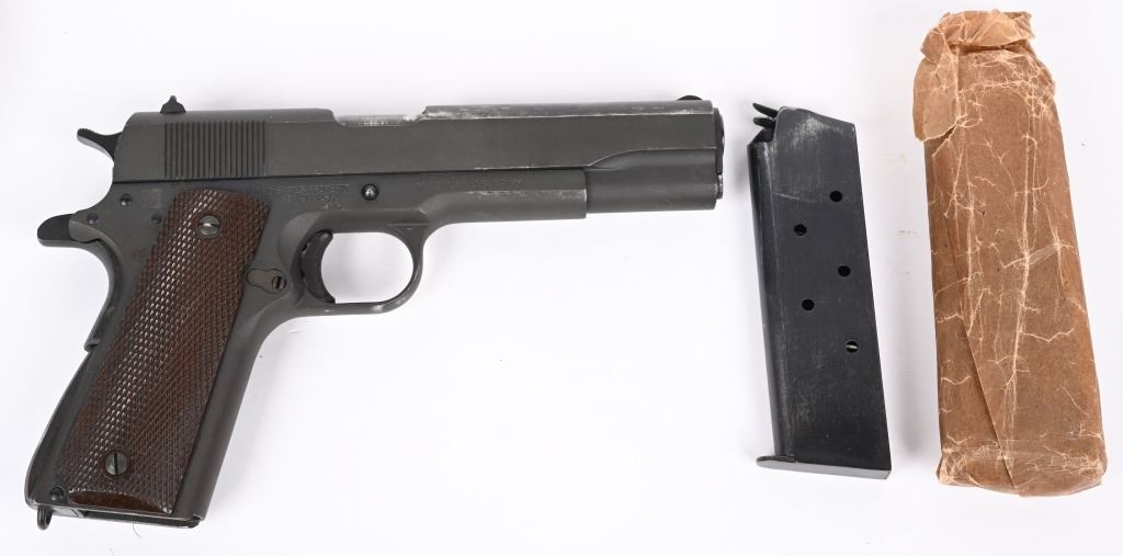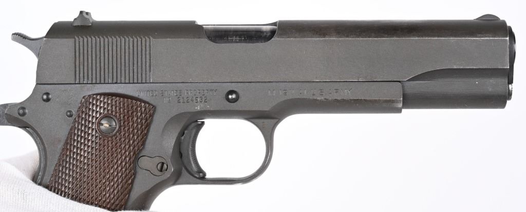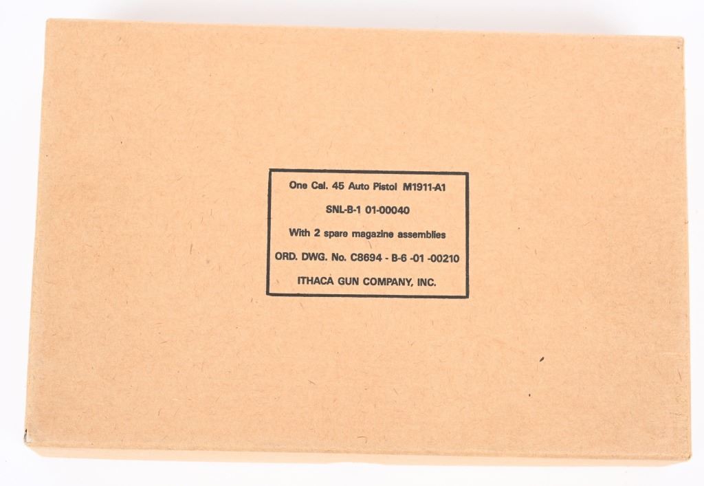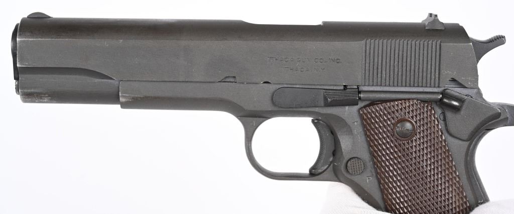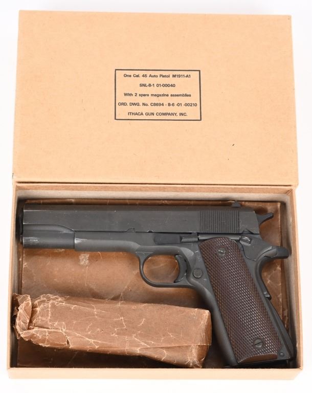 SERIAL NUMBER 2124532 BARREL 5" CALIBER .45 ACP MANUFACTURED 1945. Produced by Ithaca in 1945 with parkerized finish with blue finished barrel marked "H.S.". Brown checkered plastic Keys pattern grips with blue finished magazine marked "L" on lip. Frame is inspected FJA" on left side with "P" proof below magazine release. Slide has traditional 2 line Ithaca markings on left side "P" proof on top forward of rear sight and has Ordnance wheel inspection on right rear of frame. Equipped with narrow grooved hammer and stamped short 11-A1 trigger. Long spur 11-A1 grip safety and grooved arched mainspring housing. Both safety and slide stop are grooved. CONDITION, Very fine with frame retaining over 97% parkerized finish with slight edge wear from holster use. Slide retains 90% parkerized finish with holster and edge wear. Bore is fair with frosted grooves. Magazine retains most blue finish. Action operates properly. Pistol is housed in contemporary kraft box with spare "L" marked blue finished magazine. C&R