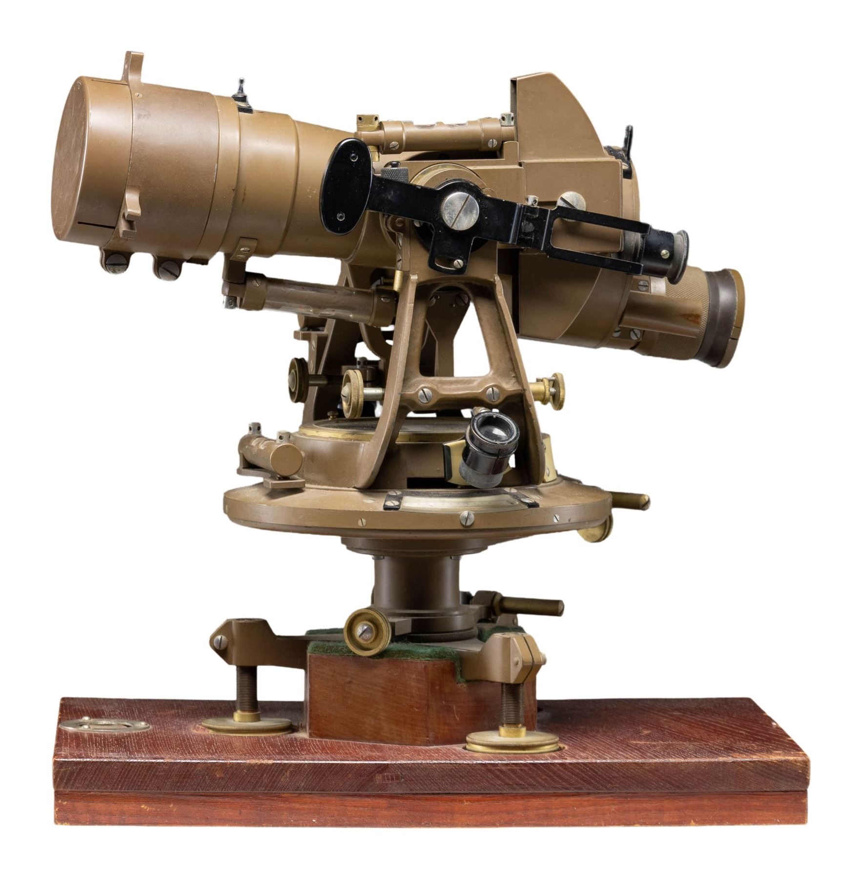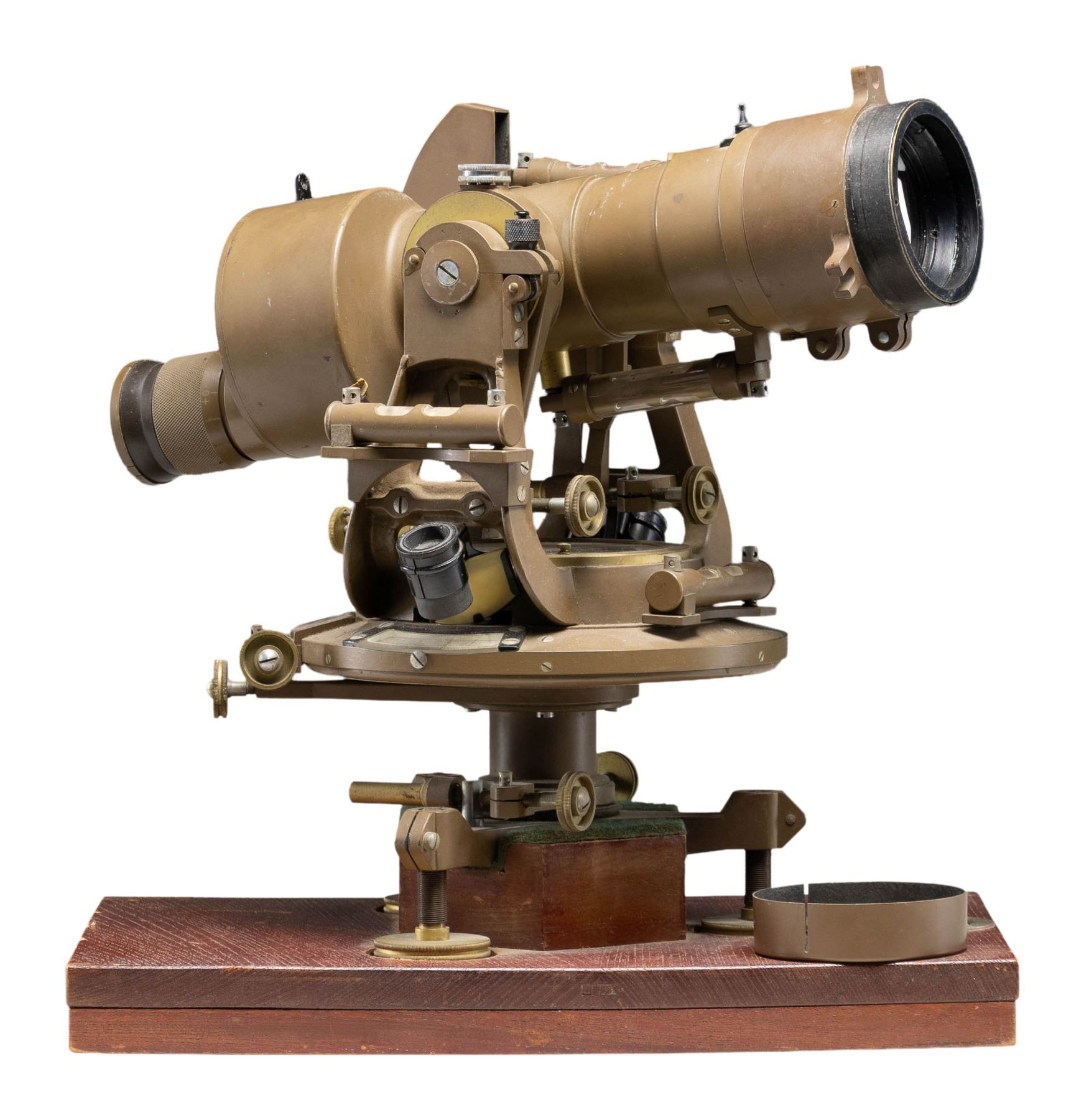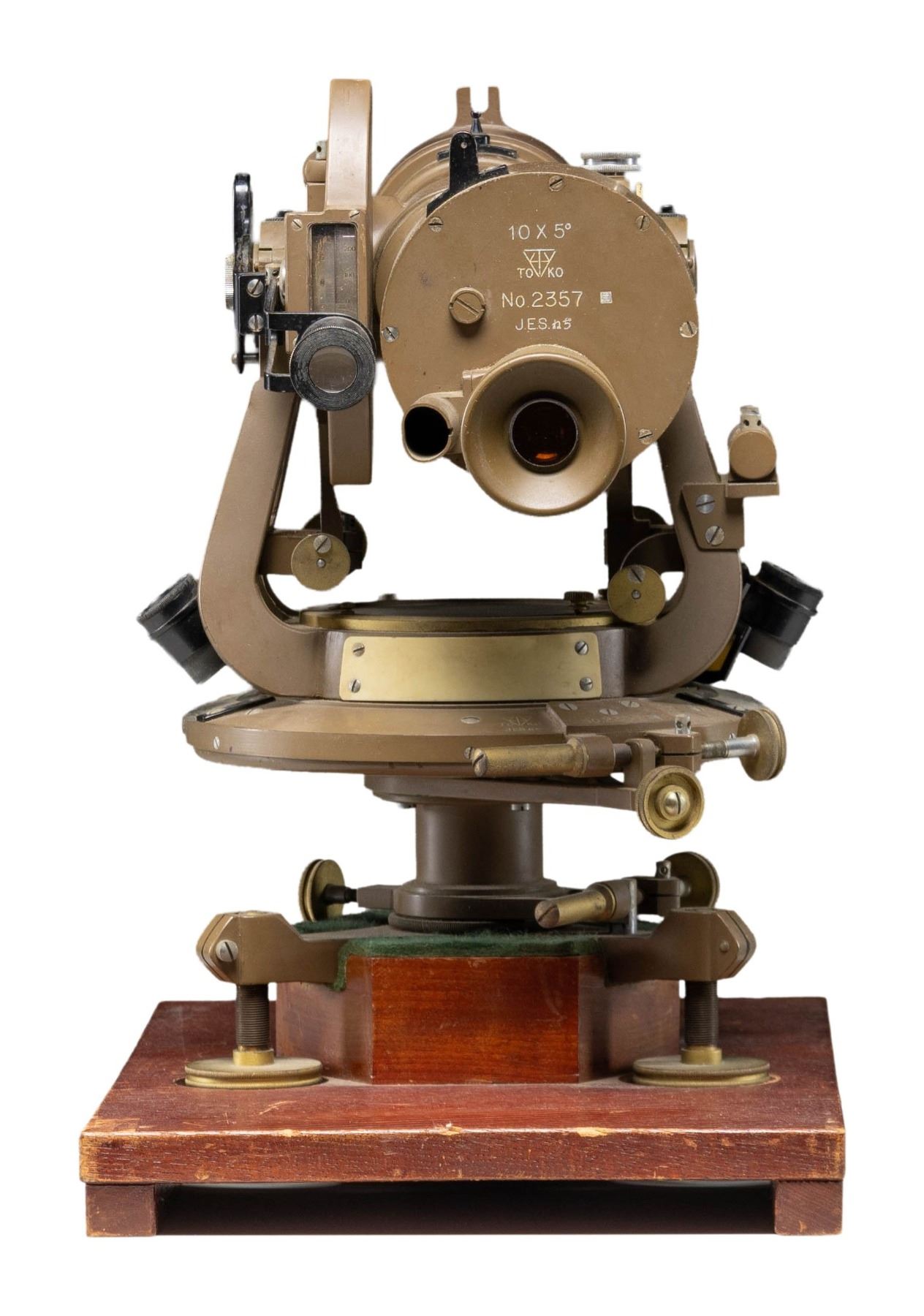 WW2 Japanese 10x optic mounted on swivel mount. Both mount & scope are maker marked Toko & numbered "2357". Swivel has compass & is mounted on a wooden base. Green painted metal. CONDITION: wooden base shows some flaking & scuffing. Metal shows scattered scuffing, light flaking & oxidation. Optics appear good (02-25137/MJC). NON-GUN. $400-600.