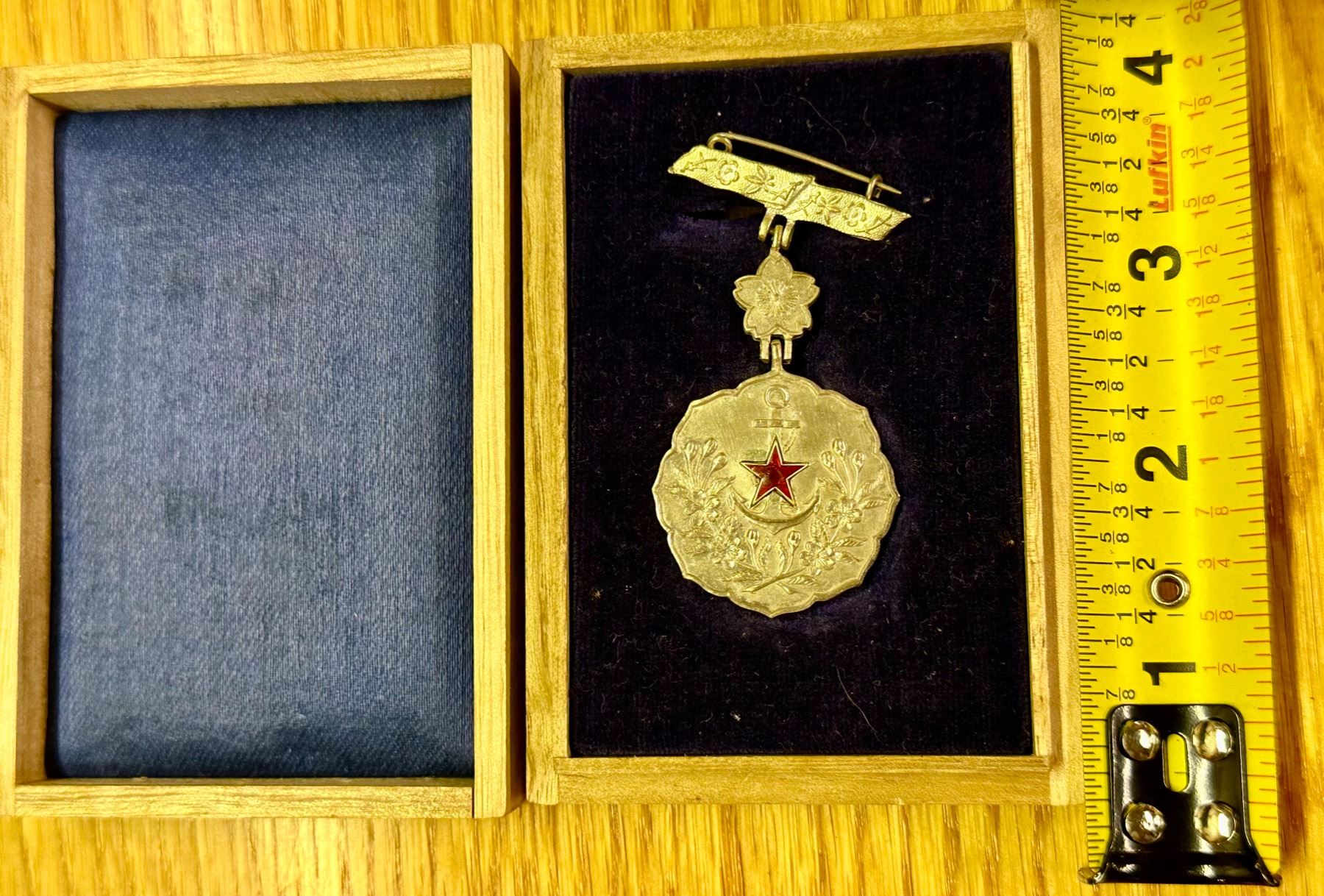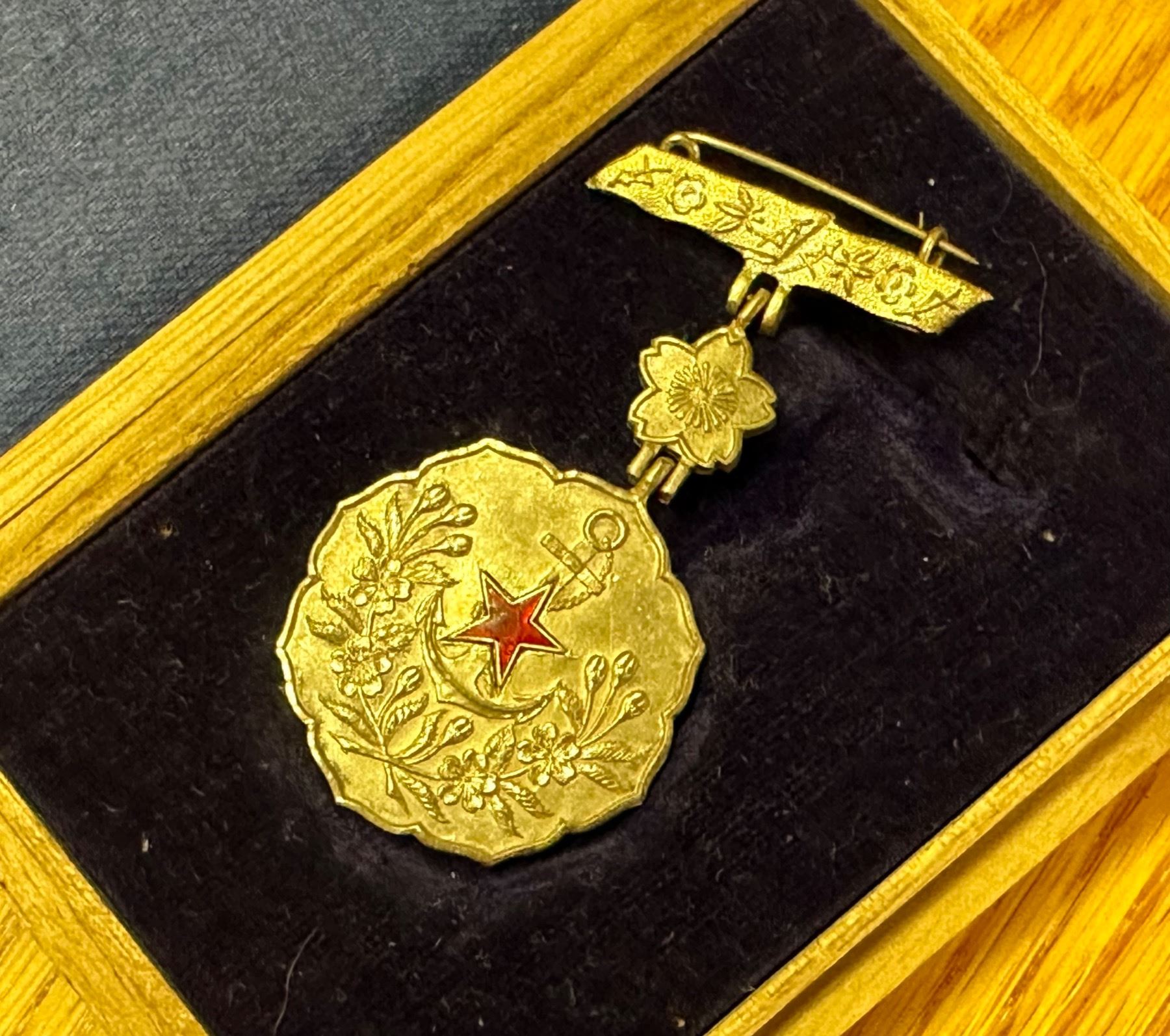 WW2 JAPANESE NAVY ANCHOR MEDAL WITH ORIG. BOX. A RARE FIND. IT IS IN MINT OVERALL SHAPE AND CONDITION WITH A BEAUTIFUL OVERALL PATINA. A GREAT FIND AND AN EXCELLENT ADDITION TO YOUR COLLECTION. A VERY SCARCE FIND.