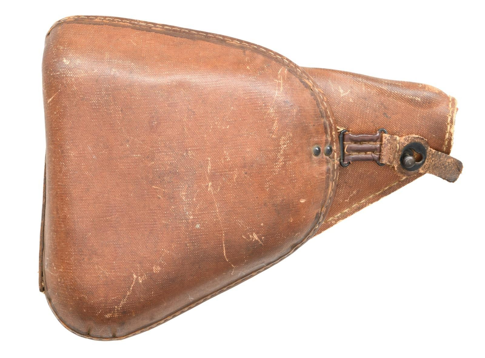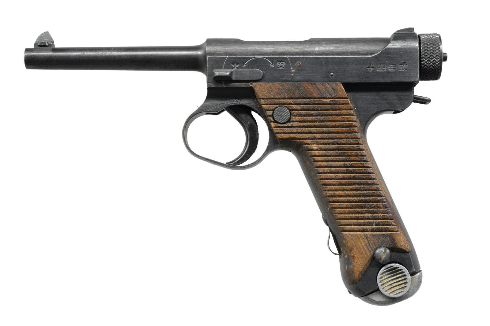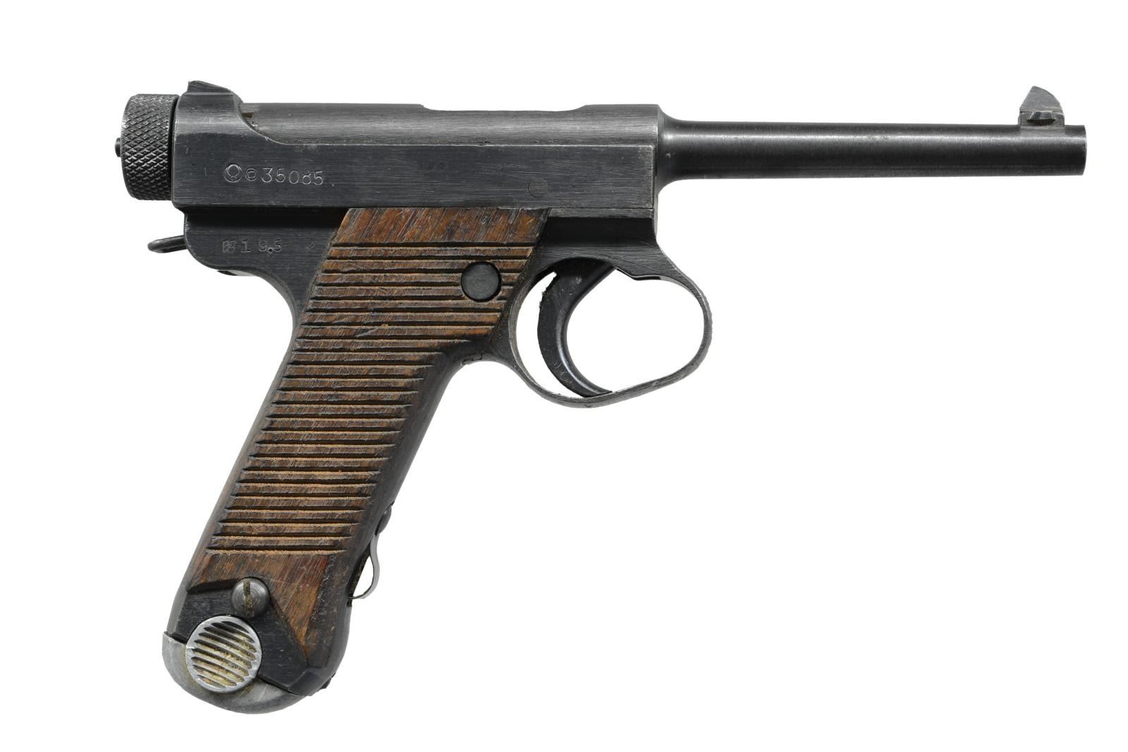 Cal. 8mm Nambu. S# 35085. Bbl. 4 3/4". Fixed rear sight. Blade front sight. Mfg. May 1944 (19.5 date). Right side of slide has Nagoya & 2nd series markings. Matching numbers on bolt, cocking piece, grips & mag. Firing pin & firing pin extension appear unnumbered. Bolt & mag release operation are stiff. Grooved hardwood grips. MAGS: 1-8 rd. UNATTACHED ACCESSORIES: rubberized canvas holster in good condition. CONDITION: grips show scattered handling wear & some flaking. Metal retains 85% original blue w/ scattered oxidation spots, edge wear & light dings. Good bore that will likely clean up better. PROVENANCE: From the estate collection of Thomas J. Mulligan. (23-2207/MJC). CURIO.