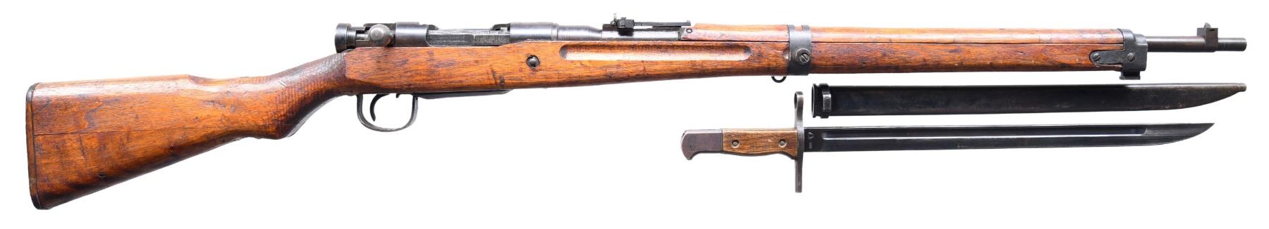 ACTION RIFLE. Cal. 7.7 Jap. S# 50189. Bbl. 25 1/2". Blade front sight without protective ears. Ladder aperture rear sight graduated to 1500m without AA wings. Bolt parts are mismatched & bayonet lug is unnumbered. Receiver top has fully intact mum. Left side of receiver has 37th series marking, serial number, Kokura & Tokyo Juki Kogyo markings. Dull blue finish. Asian hardwood stock set with two piece butt, wooden buttplate, left side sling swivels & no hole for cleaning rod. Wrist has distinctive chatter on both sides & underside of butt has strong Kanji markings. UNATTACHED ACCESSORIES: Type 30 bayonet made by National Denki under Kokura supervision with scabbard. Bayonet has straight crossguard with blued blade & is in good to very good condition. CONDITION: stock set shows a few chips, scattered dings & handling marks. Left side of buttplate shows a notable chip. Metal retains 70% original blue with scattered edge wear, light oxidation & fading. Action functions properly when hand cycled. Bright near excellent bore. (25-486/MJC). CURIO. $300-500.