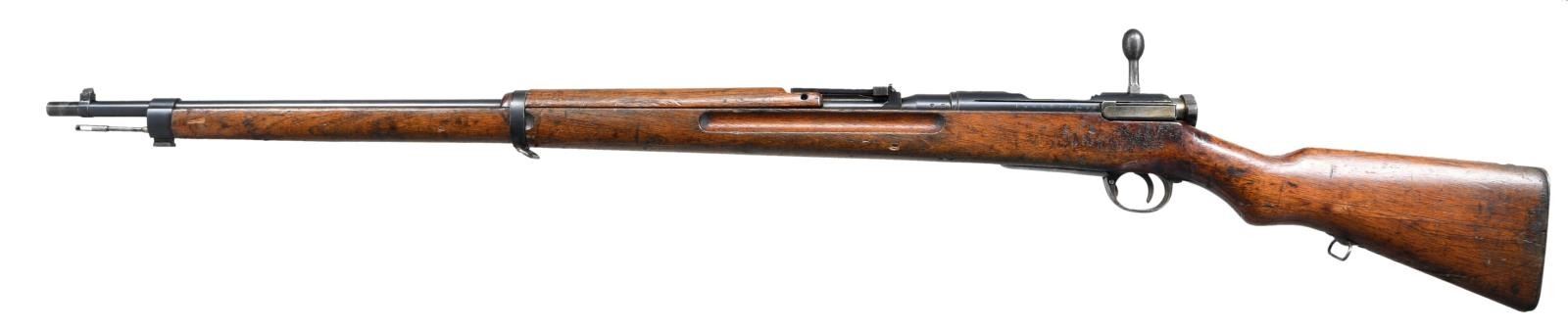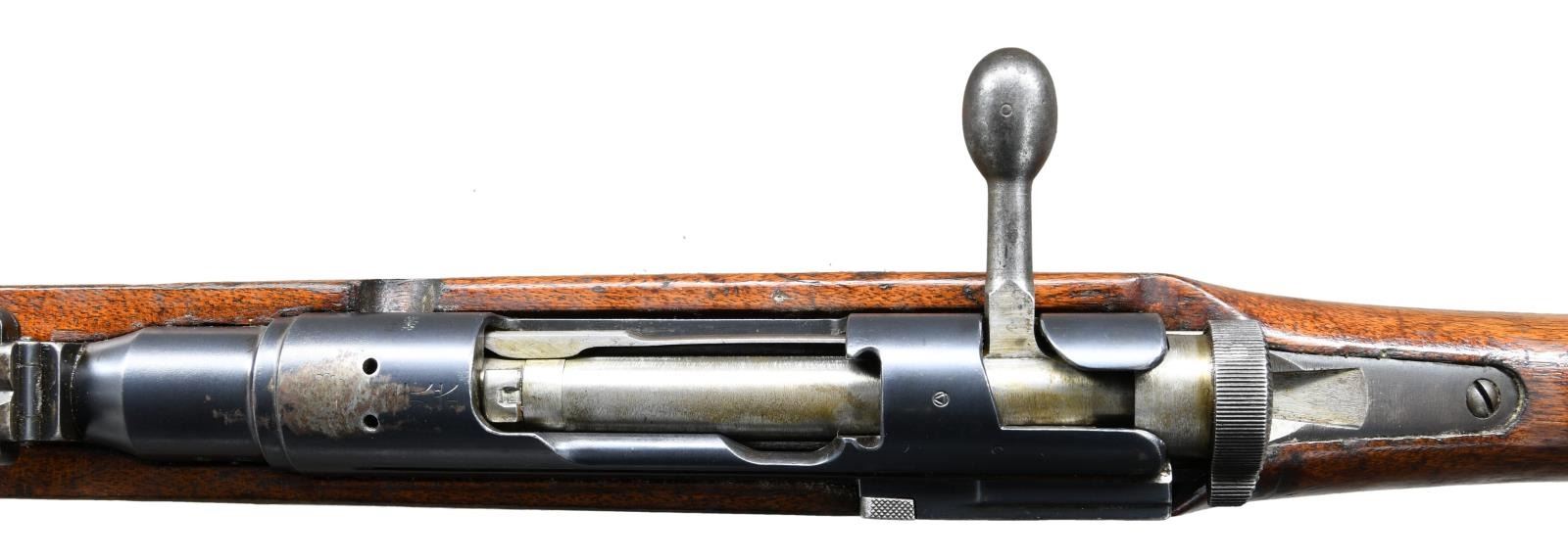 Cal. 6.5 Jap. S# 1569277. Bbl. 31 1/2". Receiver top has ground mum & Type 38 markings. Left side of receiver has Tokyo arsenal markings, serial & small inspection stamps. WW2 arsenal rework w/ matching serials on bolt body & floorplate. As originally made parts would've matched by assembly number. Other parts unnumbered or mismatched. Ladder rear sight graduated to 2400m. Blade front sight. Asian two-piece stock w/ bottom mounted sling swivels. Bottom of butt has strong Kanji markings. Cleaning rod present. CONDITION: stock set retains much original Urushi finish w/ an 8" crack on left side above butt, a 4" crack on handguard ahead of rear sight, some insect damage near bolt stop, scattered dings, moderate abrasions & handling marks. Bolt stop & rear sight base retains strong amounts of straw finish w/ some oxidation staining. Balance of metal retains 70% arsenal rework blue w/ floorplate turning gray, scattered oxidation staining & thinning. Worn bore w/ scattered oxidation. (23-1791/MJC). CURIO. $300-400.