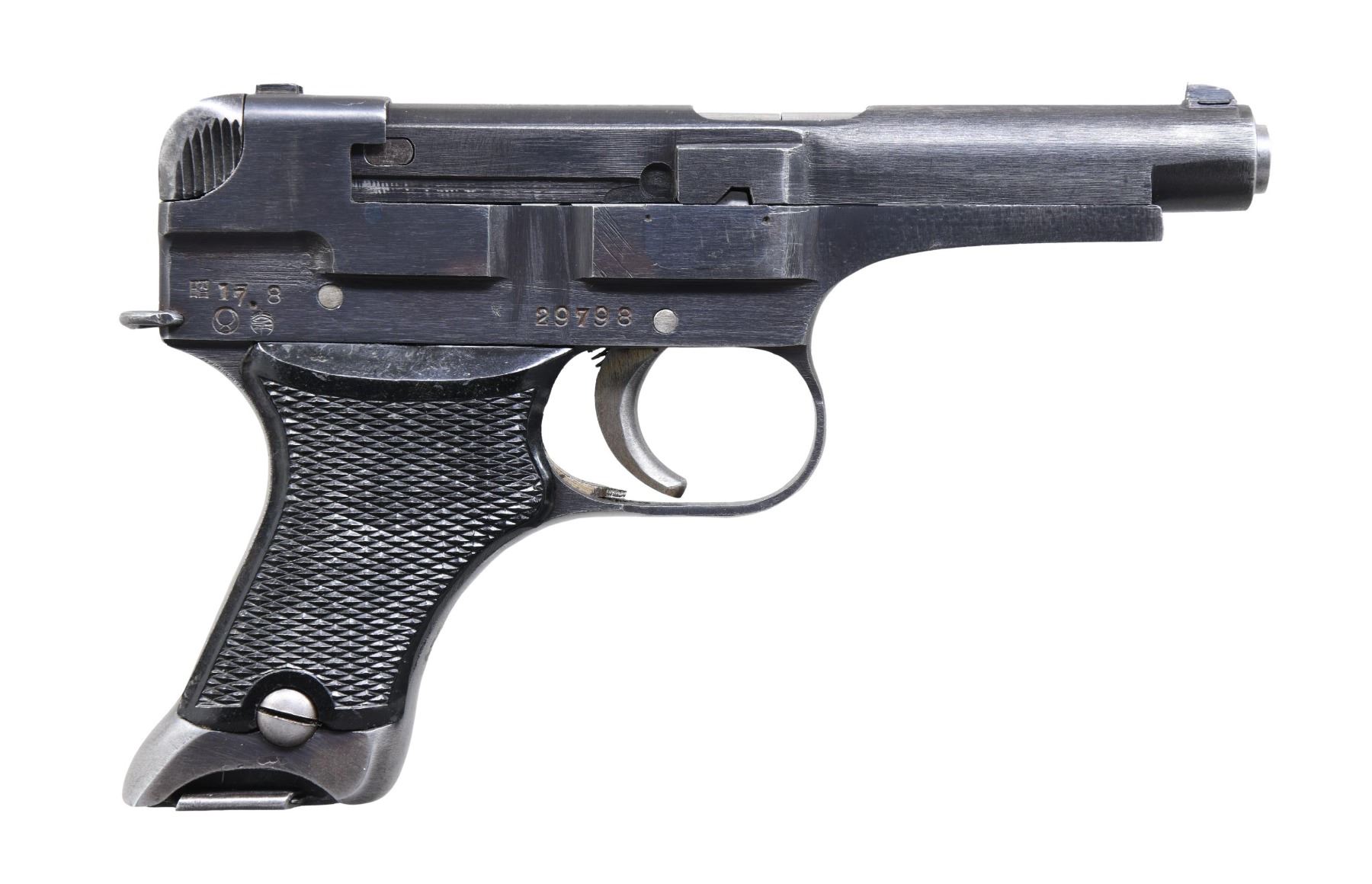 Cal. 8mm Nambu. S# 29798. Bbl. 3 3/4". Blade front sight. Square notch rear sight. Rear left fo frame has "17.8" Showa date for August, 1942, Nagoya & Chuo Kogyo symbols. Blued finish with strawed trigger. Checkered black grips. left panel is missing its screw & is loose. MAGS: 2-6 rd. One mag is matching & other numbered "795". CONDITION: grips show scattered dings & handling marks. Metal retains 70% original blue with both grip straps having a silvery-gray appearance, scattered edge wear & light oxidation. Action functions properly when hand cycled. Good bore with some light oxidation. (25-493/MJC). CURIO. $300-500.