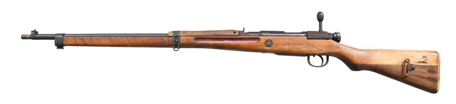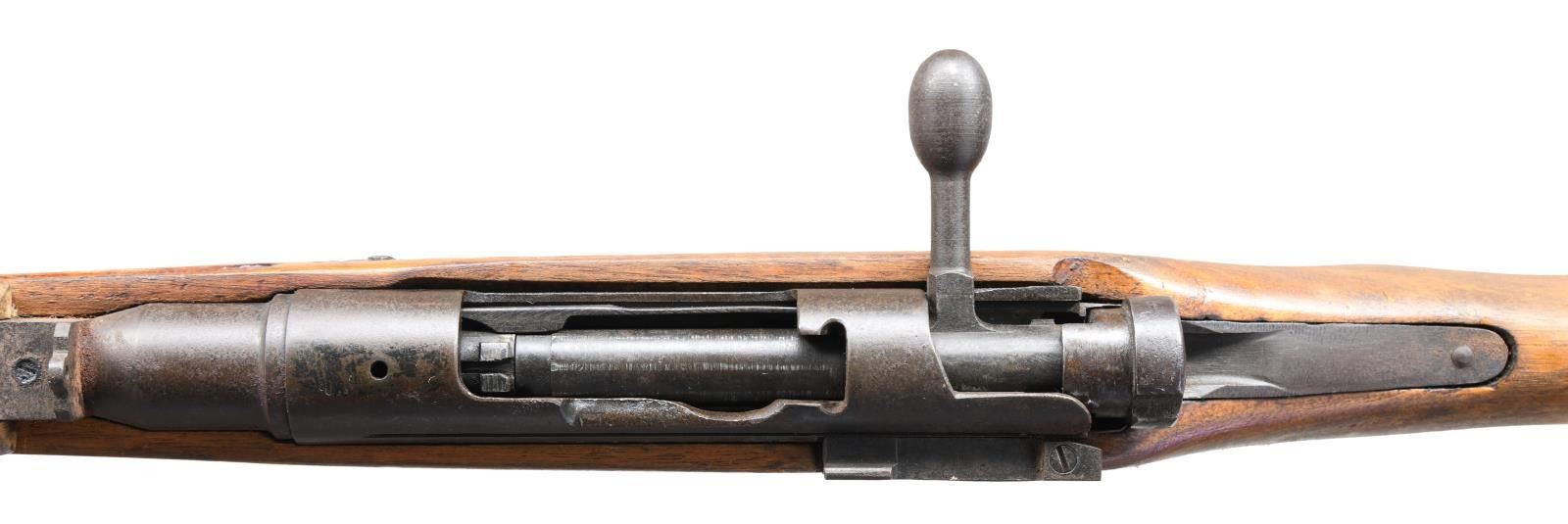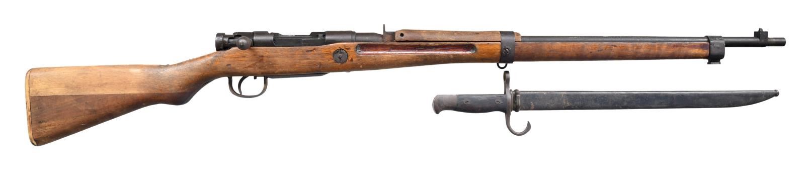 N RIFLE. S# 62649. Bbl. 25 1/2". Matching numbers on bolt handle & extractor. Other parts mismatched or unnumbered. Extractor is loose & may require attention. Top of receiver has ground mum. Left side of receiver has 34th series marking, serial & Toyo Kogyo markings. Fixed aperture rear sight. Blade front sight w/o protective ears. Two piece Asian hardwood stock w/ separate forend & left side sling swivels. CONDITION: Type 30 bayonet mfg. by Tokyo arsenal w/ hooked quillon & scabbard in fair condition w/ scattered oxidation & light pitting. CONDITION: stock set has been cleaned of original finish w/ a large chip at right side of butt, a couple other chips on left side of butt, scattered dings & handling wear. Metal is a brown patina w/ scattered oxidation & traces of original blue. Good bore w/ some light pitting. (23-1992/MJC). CURIO. $200-300.