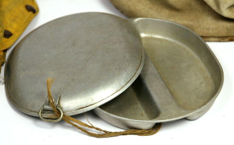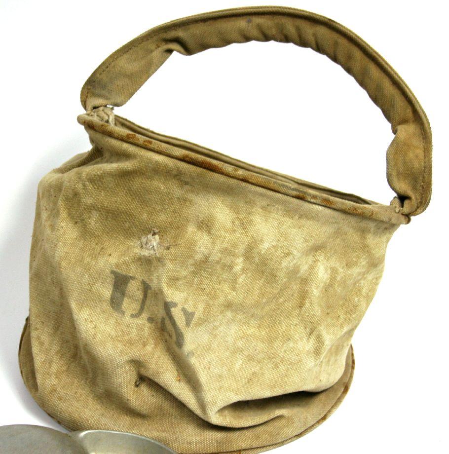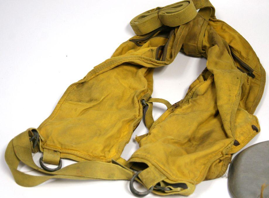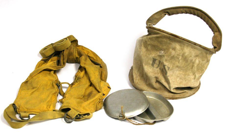 A 3 piece lot of militaria consisting of a WW2 Jeep bucket (bottom has holes) WW2 B4 life vest without inserts and a tear to the front, lastly a WW1 field mess kit.