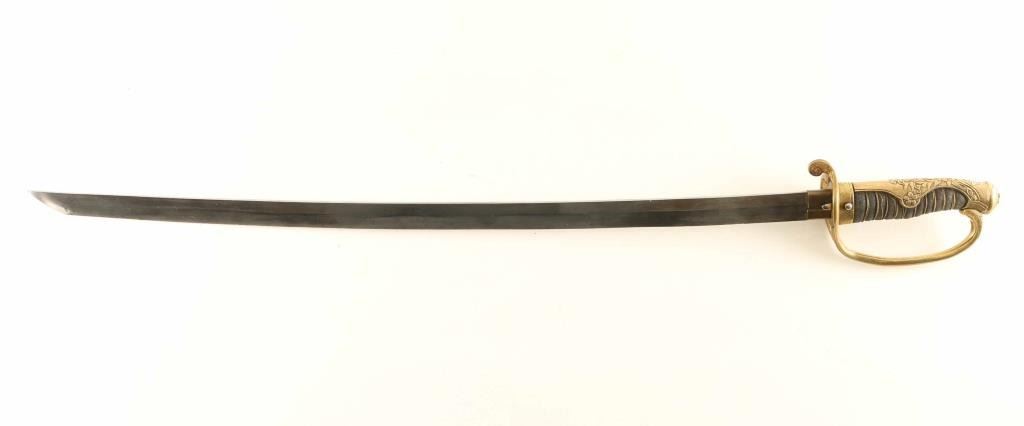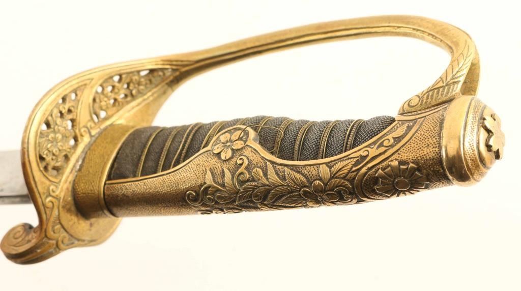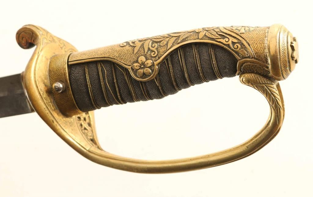 26" chrome plated blade. Brass D-hilt, wire wrapped grips. Ten petal cherry blossom mon on the backstrap of the brass hilt. No Scabbard. No Scabbard. Nice condition.