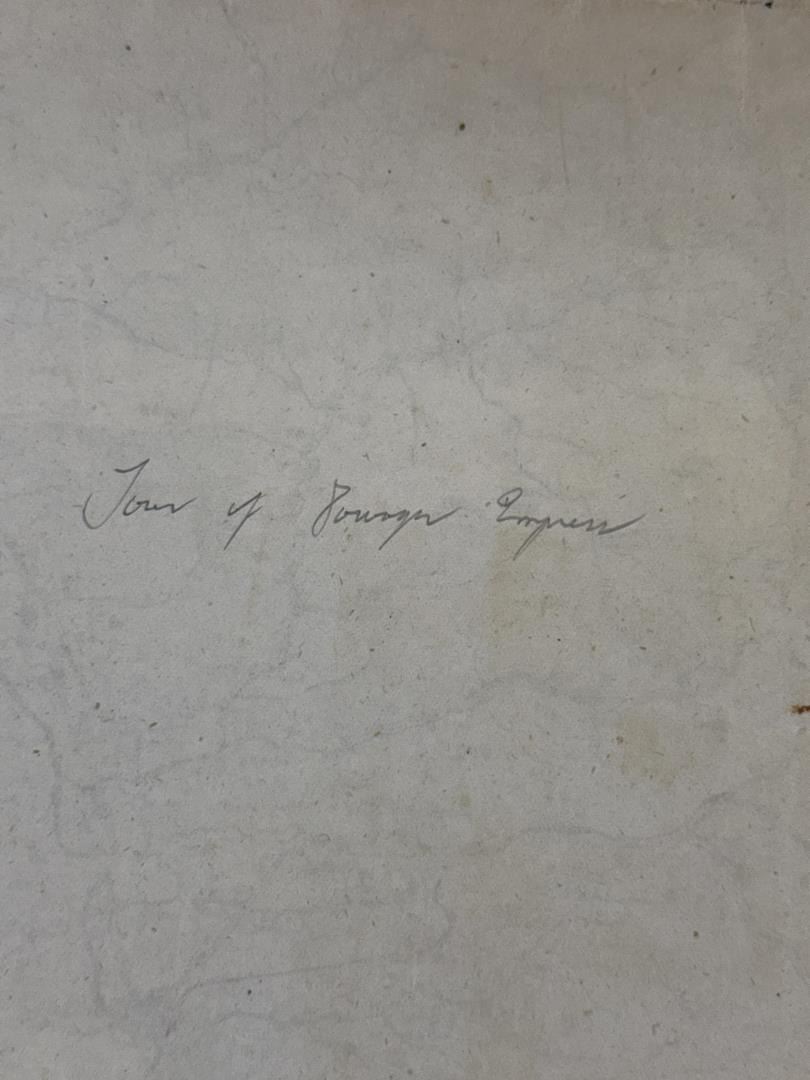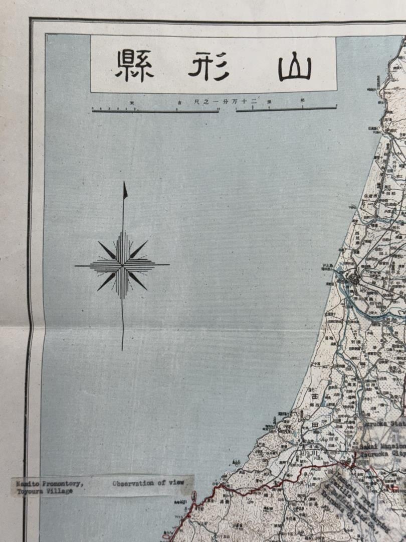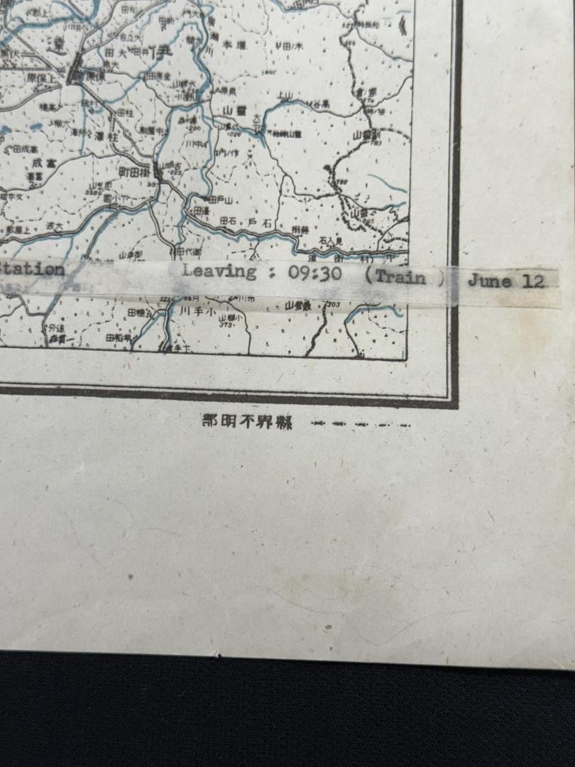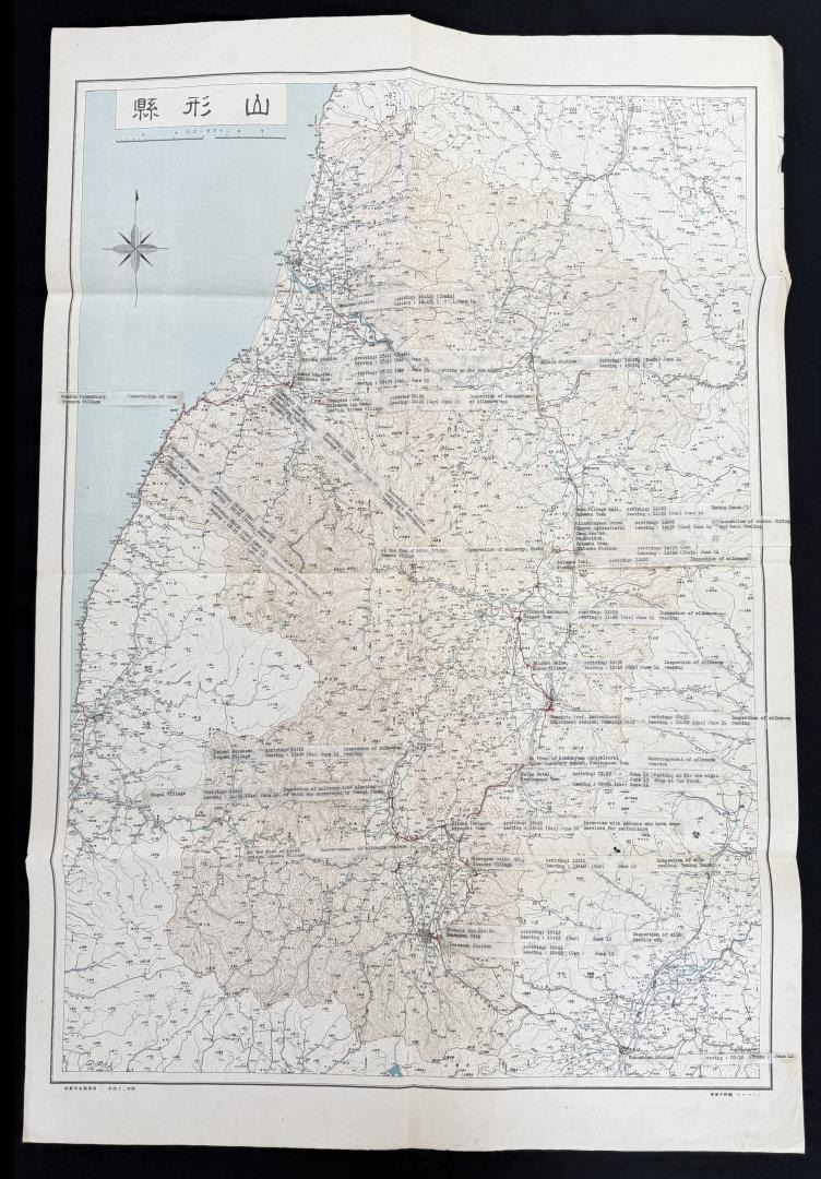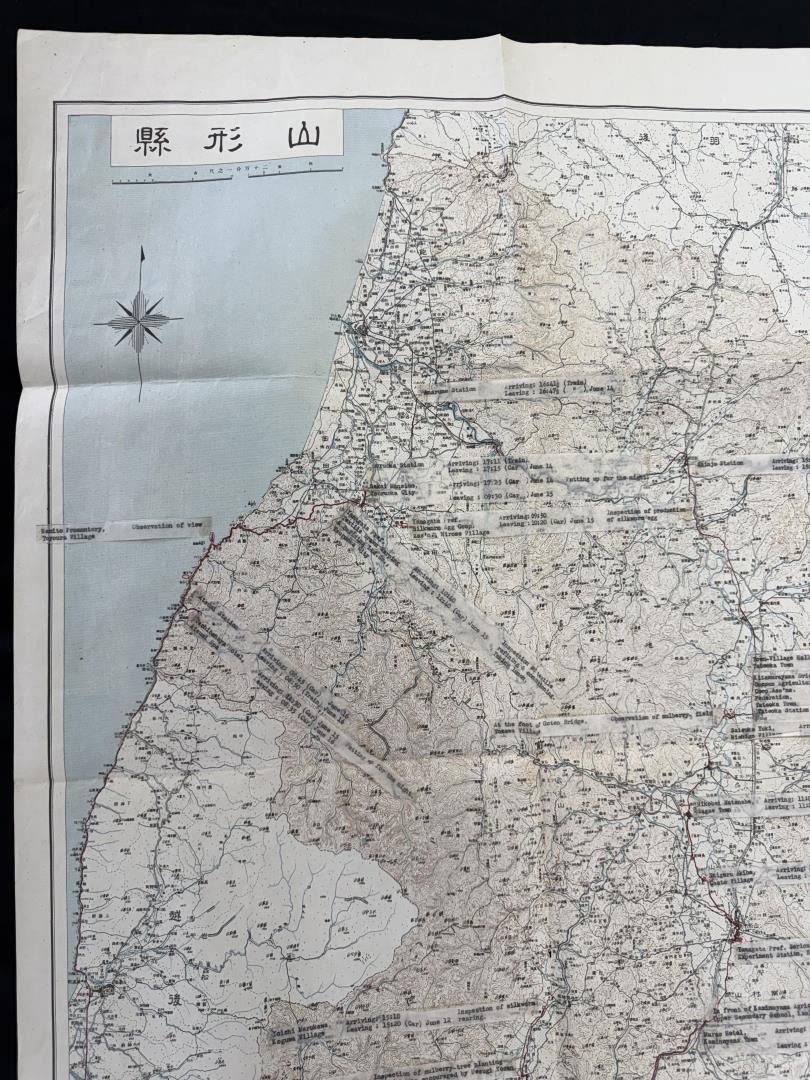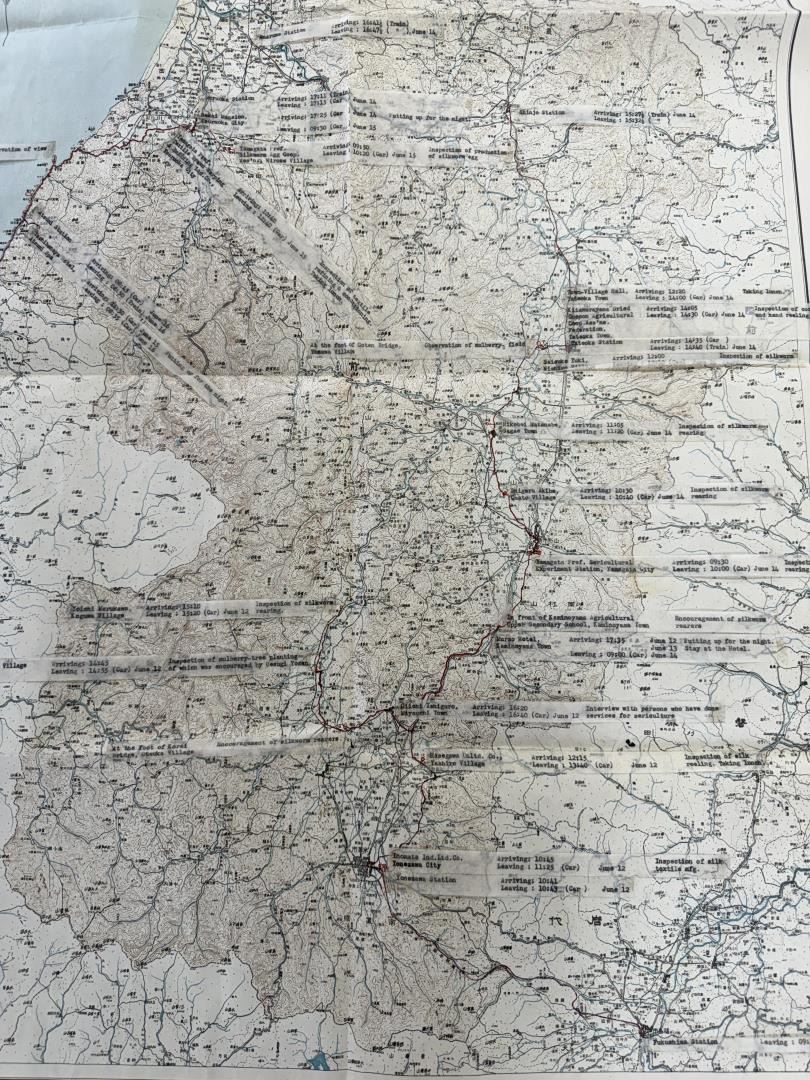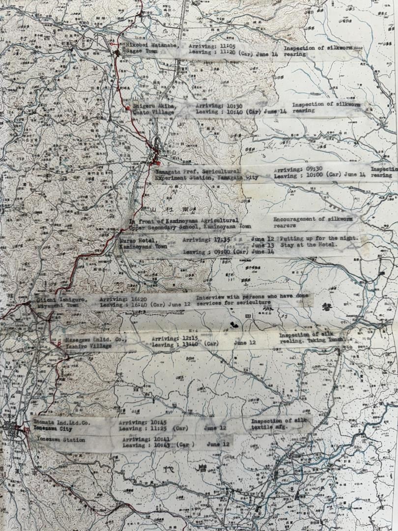 36" by 24 1/2". This map is annotated with a route, times and details from an individual visiting Silkworm Rearing Farms.