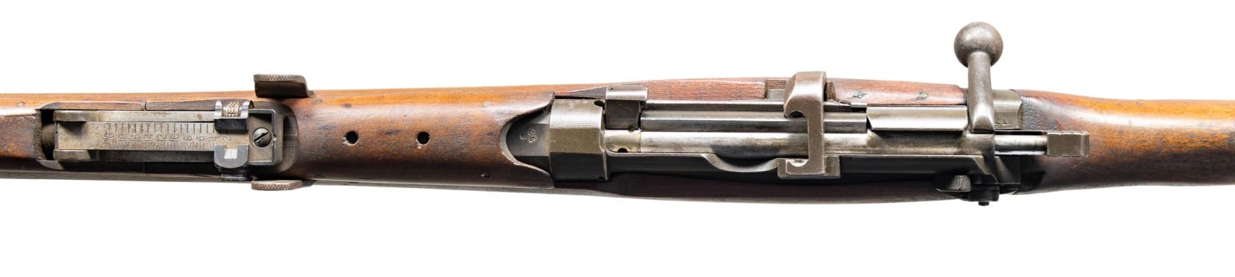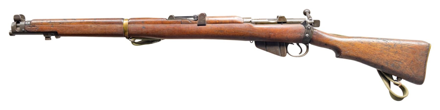 Cal. 303 Brit. S# E6611. Bbl. 25 1/5" dated 1944 & unnumbered. Blade front sight with protective ears. Tangent rear sight graduated to 2000m. Matching numbers on receiver, bolt handle, right side of butt & nosecap. Other parts appear unnumbered. Bolt has additional assembly number that matches socket. Right side of socket has Lithgow III* markings & 1942 date. No visible import markings. Arsenal parkerized finish. Hardwood stock set with bottom mounted sling swivels & canvas sling that appears newer. Brass buttplate & rear band. iRight side of butt has strong Lithgow markings & 1943 date. MAGS: 1-10 rd. marked "OA". CONDITION: stock set shows a few handguard cracks, a few gouges, scattered dings & handling marks. Metal retains 75% arsenal parkerized finish with scattered oxidation, some pitting on bottom of mag, & edge wear. Action functions properly when hand cycled. Bright near excellent bore. (25-3794/MJC). CURIO. $300-500.