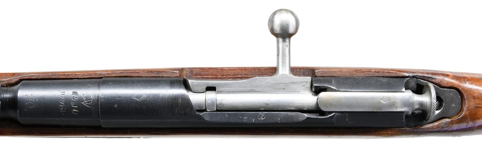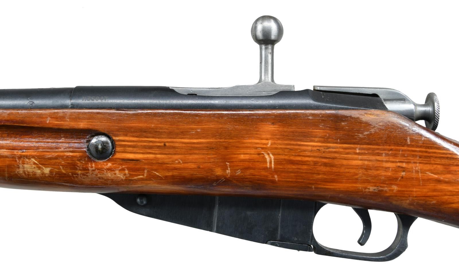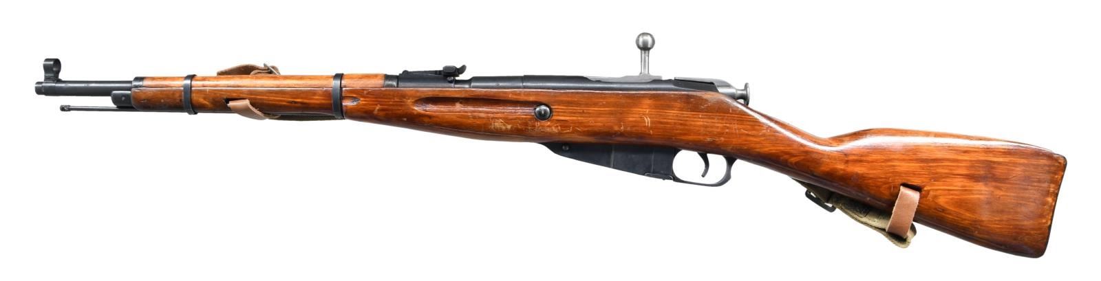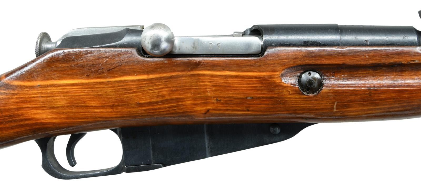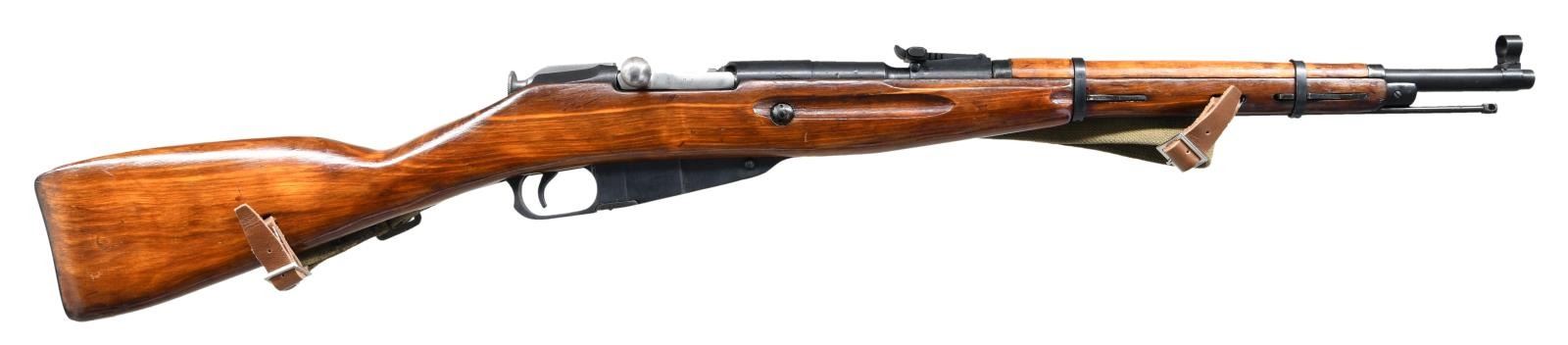 Cal. 7.62x54R. S# M35847. Bbl. 20 1/2" w/ import marking. All matching numbers as arsenal refurbished. Top of bbl. has 1944 date, arsenal overhaul marking, Izhevsk markings & serial. Left side of receiver has importer added serial. Tangent rear sight graduated to 1000m. Post front sight w/ hood. Wartime M44 stock w/ sling slots. Canvas Com-Bloc sling & cleaning rod present. CONDITION: arsenal reworked stock set shows scattered flaking & handling wear. Metal retains 95% arsenal rework blue. Fair bore w/ counterbore at muzzle, scattered frosting & light pitting. (23-1917/MJC). CURIO. $200-400.