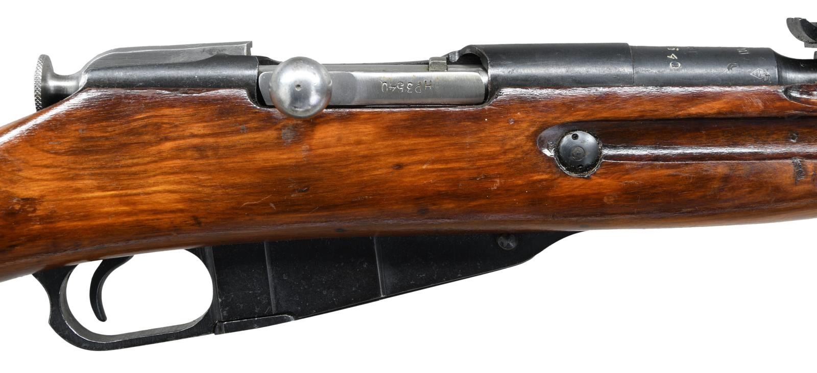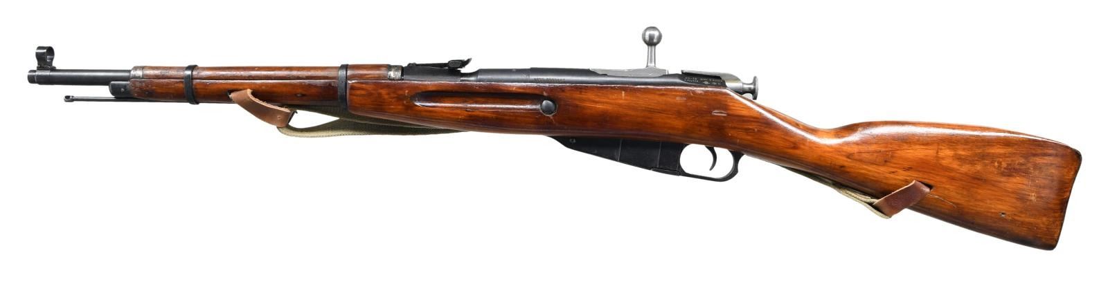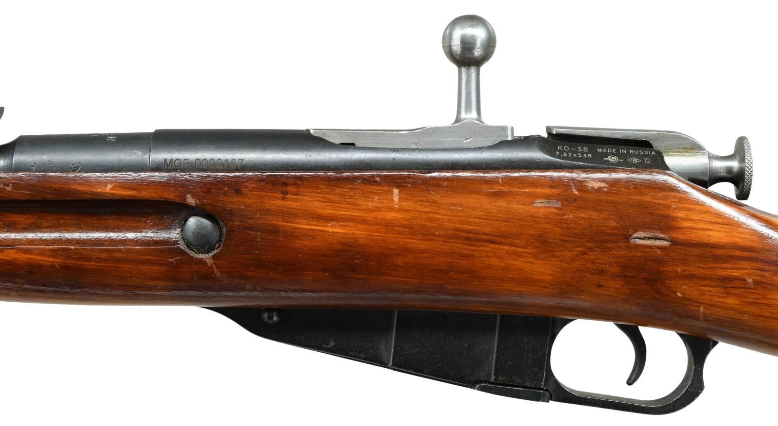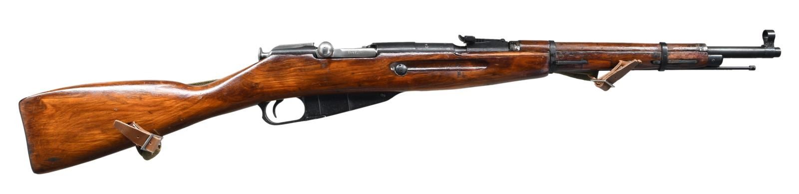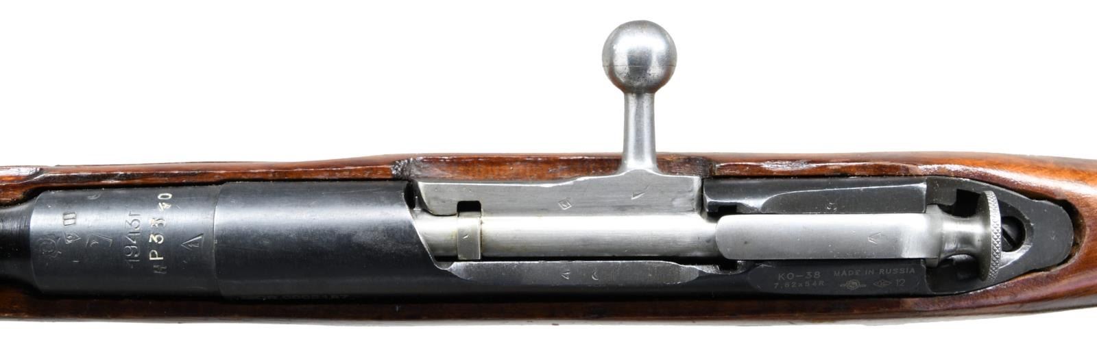 Cal. 7.62x54R. S# MOR0002187. Bbl. 20 1/2" w/ import marking. All matching numbers as arsenal refurbished. Top of bbl. has Izhevsk marking, arsenal refurb markings & 1943 date. Left side of receiver has importer added serial & Molot export markings. Tangent rear sight graduated to 1000m. Post front sight w/ hood. Wartime M44 stock w/ sling slots & Com-Bloc style sling. Cleaning rod present. CONDITION: arsenal reworked stock set has an armorer patch repair between bands, scattered dings, handling marks & flaking shellac. Metal retains 90% arsenal rework blue w/ spots of blued over pitting. Very good bore w/ some light pitting near muzzle. (23-2004/MJC). CURIO. $100-300.