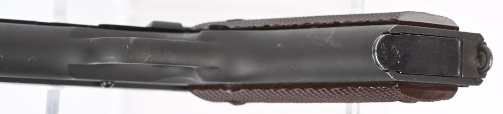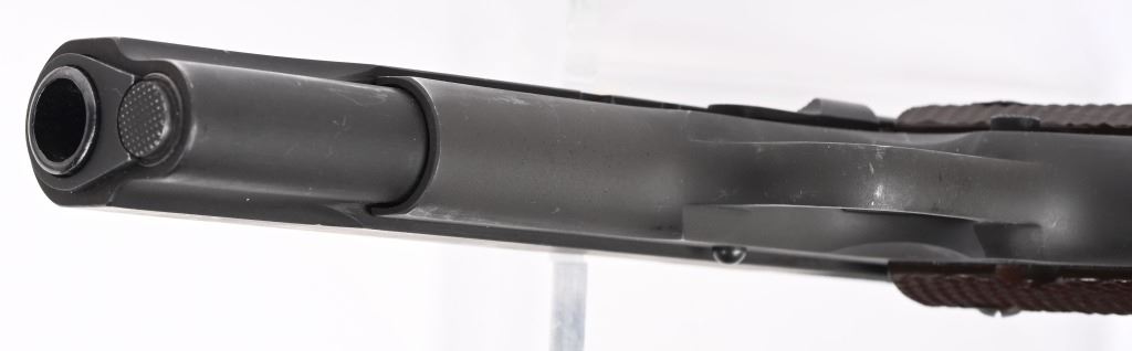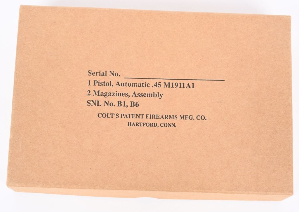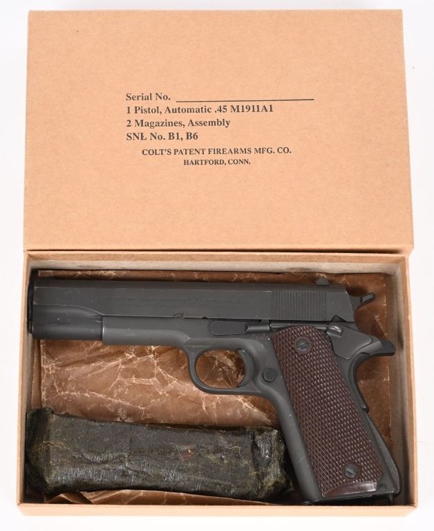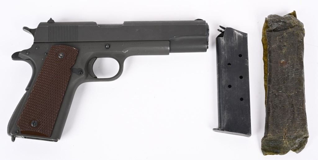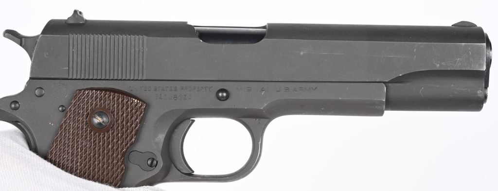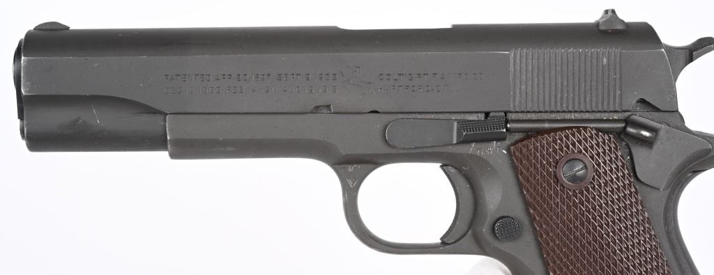 SERIAL NUMBER 1128616 BARREL 5" CALIBER 45 ACP MANUFACTURED 1943. Parkerized finish with brown checkered Keys pattern grips. Blue finished barrel marked "COLT 45 AUTO" on left lower side of chamber. Slide marked with standard 2 line Colt address with Rampant colt in center. Slide is serial numbered beneath firing pin retaining gate with matching number to frame. Frame is inspected "GHD" on left side and "P" proofed below magazine release. Right rear of frame has Ordnance wheel inspection. Short checkered milled trigger with checkered slide stop and safety. Short wide checkered Colt hammer with long 11-A1 grip safety and checkered ,arched mainspring housing. Slide is "P" proofed on top forward of rear sight. CONDITION, Exceptionally fine with pistol retaining 98% parkerized finish with excellent bright bore and crisp markings. Action operates properly and grips are very fine. Magazine is very fine marked "R: on lip for Risdon and pistol is housed in contemporary kraft box with spare unissued "S" marked magazine in preservative wrap. C&R
