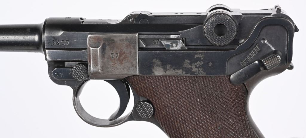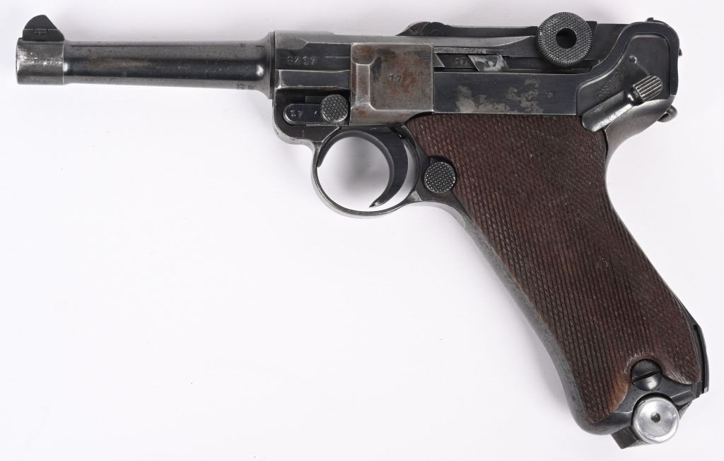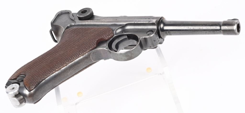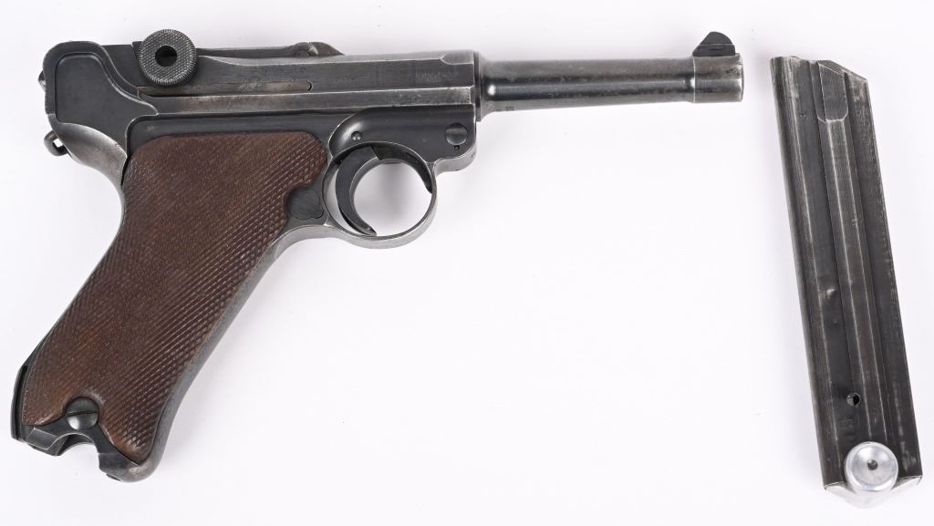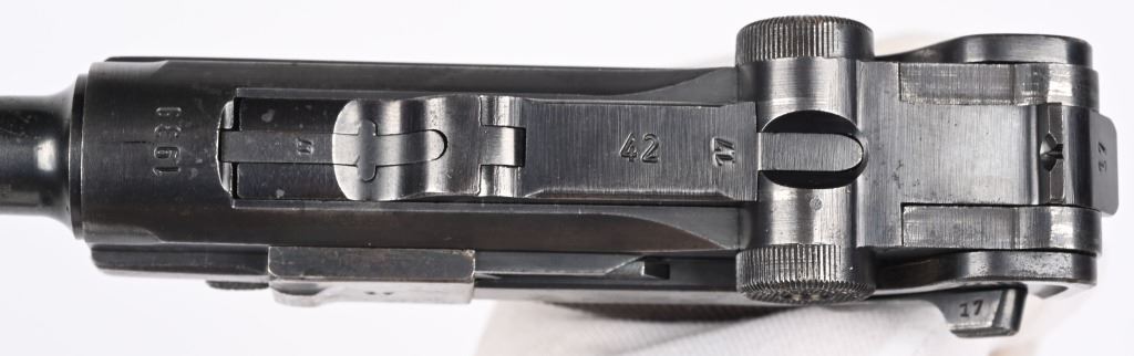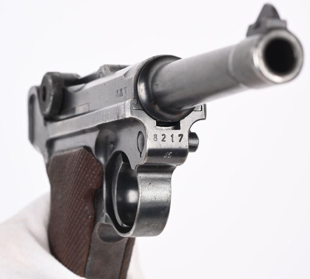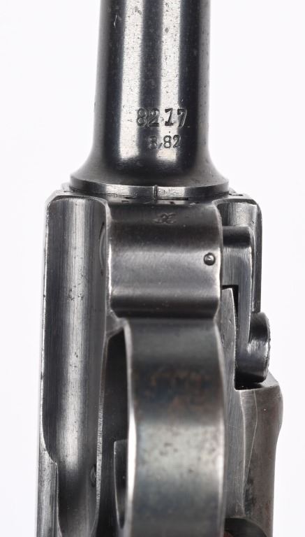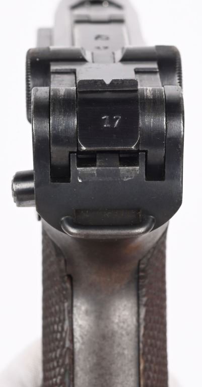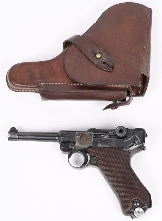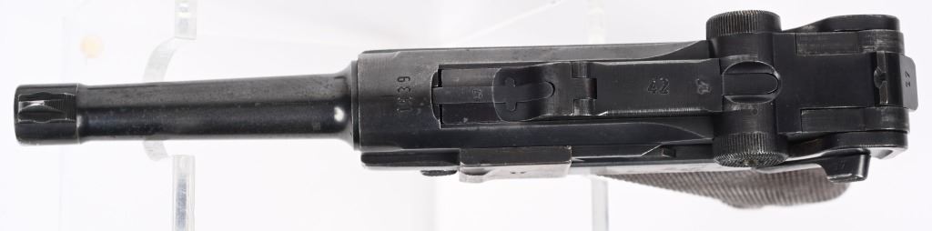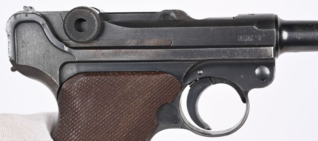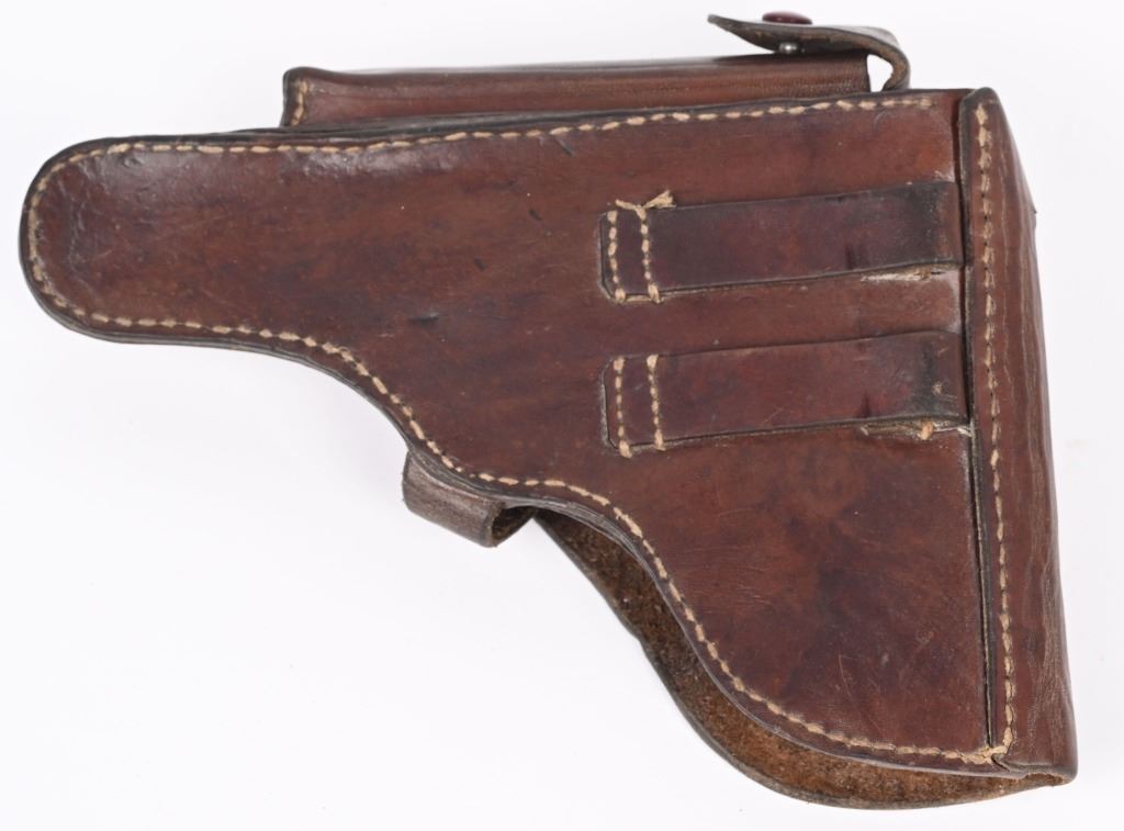SERIAL NUMBER 8217x BARREL 4" CALIBER 9MM PARA MANUFACTURED 1939. Produced by Mauser in 1939 using the German code "42" and manufactured with blue finish and checkered walnut grips and a blue finished code 122 Eagle 37 alloy based magazine. Pistol has all matching numbers with exception of bolt stop and magazine. Grips are unnumbered. Pistol is housed in a brown leather unmarked Bulgarian pattern holster with modified flap. CONDITION. Good overall with worn frosted bore. Pistol retains 60% blue finish with lightly worn full sized grips. Action operates properly. Stitching is solid and leather remains supple on holster C&R