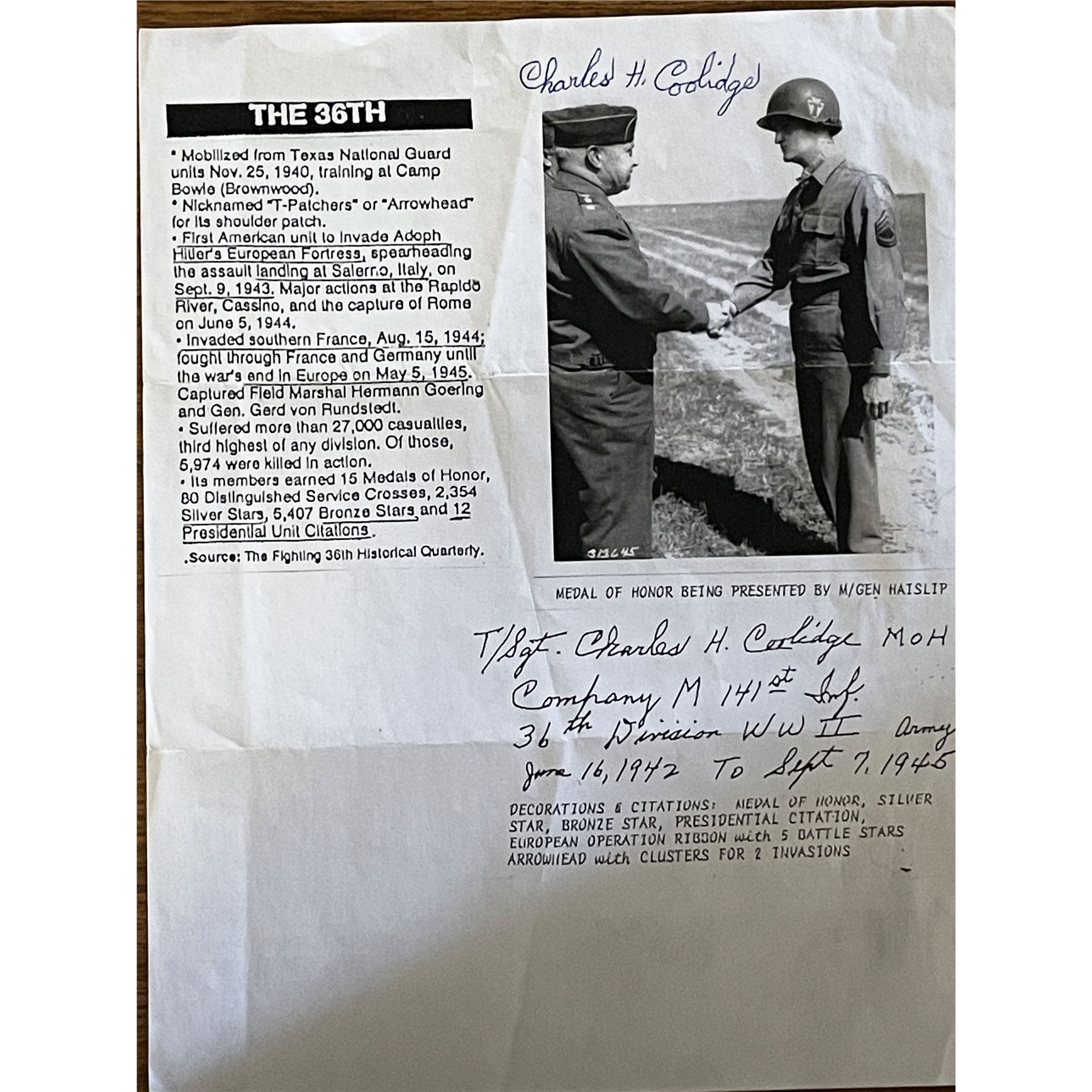 WW2 Medal of Honor Charles Coolidge signed photo. 8x10 inches