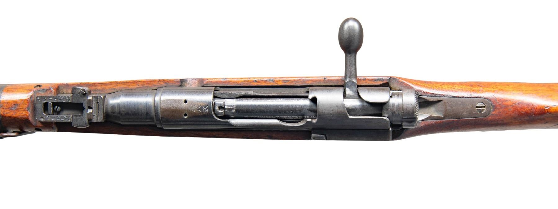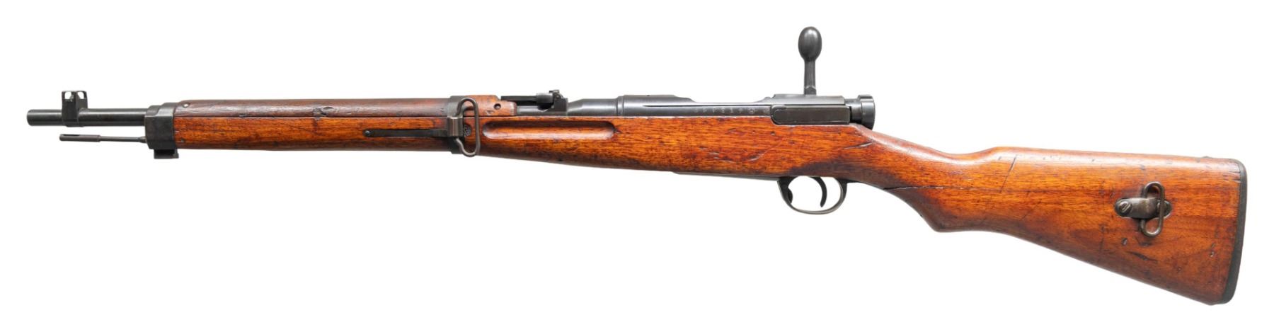 Cal. 6.5 Jap. S# 87317. Bbl. 19". Blade front sight with protective ears. Ladder rear sight graduated to 2000m. Matching numbers on receiver, bolt handle, bayonet lug, floorplate, firing pin & safety. Receiver top has ground mum & Type 38 markings. Left side of receiver has Nagoya & fourth series markings with serial number. Blued finish. Asian hardwood stock set with two piece butt & left side sling swivels. Handguard has a notably darker appearance than stock. Cleaning rod present. CONDITION: both sides of stock joint are separating at wrist, stock otherwise shows a set of initials on right side of butt, a thin crack ahead of bottom metal, scattered scratches, dings & handling marks. Metal is turning gray with strong traces of original blue & scattered oxidation. Action functions properly when hand cycled. Very good plus bright bore. (25-3837/MJC). CURIO. $300-500.