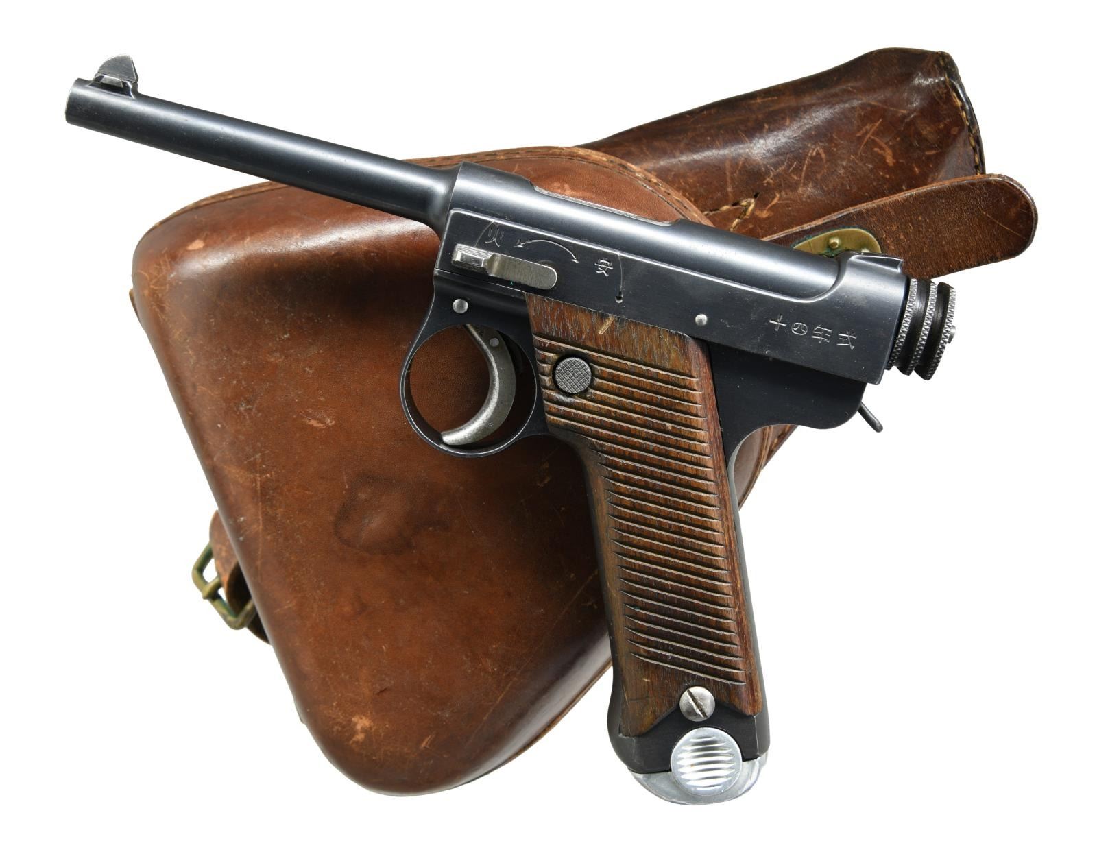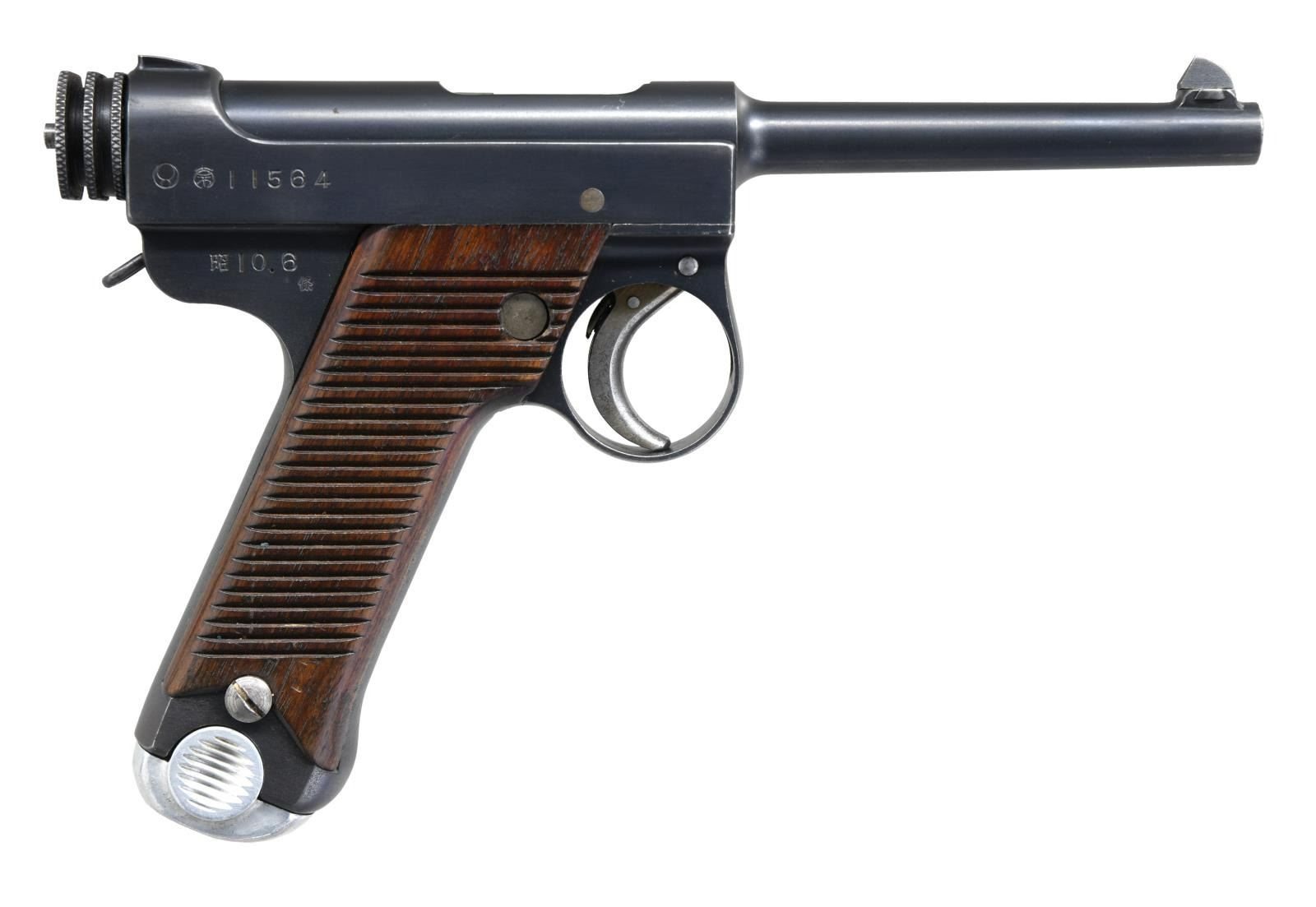 Cal. 8mm Nambu. S# 11564. Bbl. 4 3/4". Mfg. June 1935 (10.6 Showa date). Fixed rear sight. Blade front sight. Right side of slide has Nagoya & Nambu rifle factory symbols. Blue finish w/ strawed trigger, safety lever & mag release. Matching numbers on trigger, bolt & cocking piece. Both grip panels, firing pin & firing pin extension are all unnumbered. Grooved Asian hardwood grips. MAGS: 1-8 rd. numbered "018". UNATTACHED ACCESSORIES: clamshell holster w/ sling, spare unnumbered firing pin & lanyard. CONDITION: grips show scattered dings & handling wear. Straw parts show thinning & oxidation staining. Balance of metal retains 90% original blue w/ scattered light oxidation & fading. Fair bore w/ scattered pitting. (23-2479/MJC). CURIO. $700-1000.