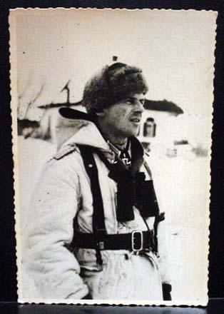 WW2 NAZI GERMAN ARCHIVES PHOTO OF KNIGHT'S CROSS SOLDIER IN WHITE SNOW SUIT - This photo was confiscated from Germany by Russia at the end of WW2. Russia only recently started releasing these photos from their war archives. Russian markings on the back.