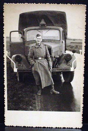 WW2 NAZI GERMAN ARCHIVES PHOTO OF SOLDIER IN FRONT OF TRUCK - This photo was confiscated from Germany by Russia at the end of WW2. Russia only recently started releasing these photos from their war archives. Russian markings on the back.