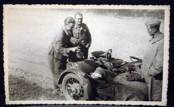 WW2 NAZI GERMAN ARCHIVES PHOTO OF SOLDIERS NEXT TO A MOTORCYCLE W/ A SIDECAR - This photo was confiscated from Germany by Russia at the end of WW2. Russia only recently started releasing these photos from their war archives. Russian markings on the back.