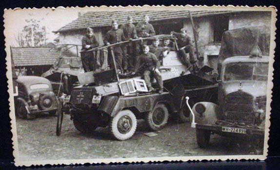 WW2 NAZI GERMAN ARCHIVES PHOTO OF SOLDIERS STANDING ON A LARGE VEHICLE - This photo was confiscated from Germany by Russia at the end of WW2. Russia only recently started releasing these photos from their war archives. Russian markings on the back.