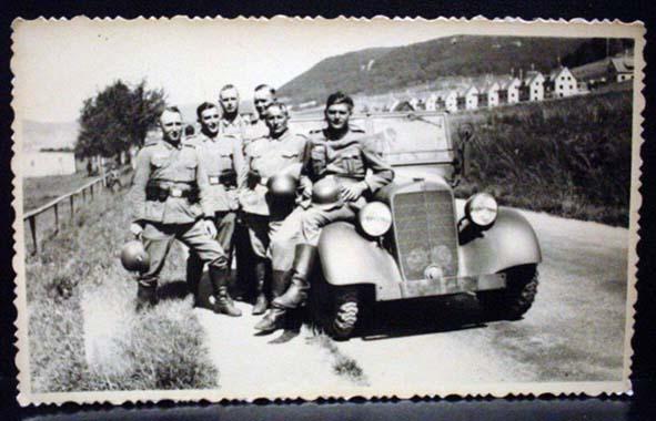 WW2 NAZI GERMAN ARCHIVES PHOTO OF SOLDIERS W/ HELMETS NEXT TO CAR - This photo was confiscated from Germany by Russia at the end of WW2. Russia only recently started releasing these photos from their war archives. Russian markings on the back.