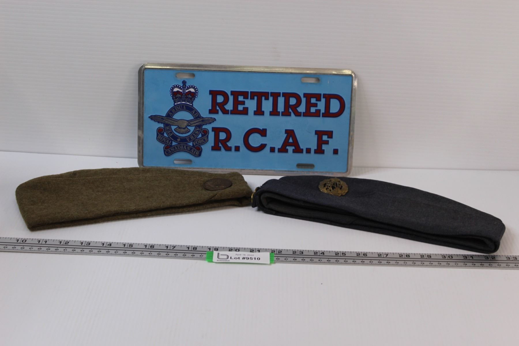 WW2 RCAF & U.S. Army Wedge Caps both with Badges & Retired RCAF License Plate