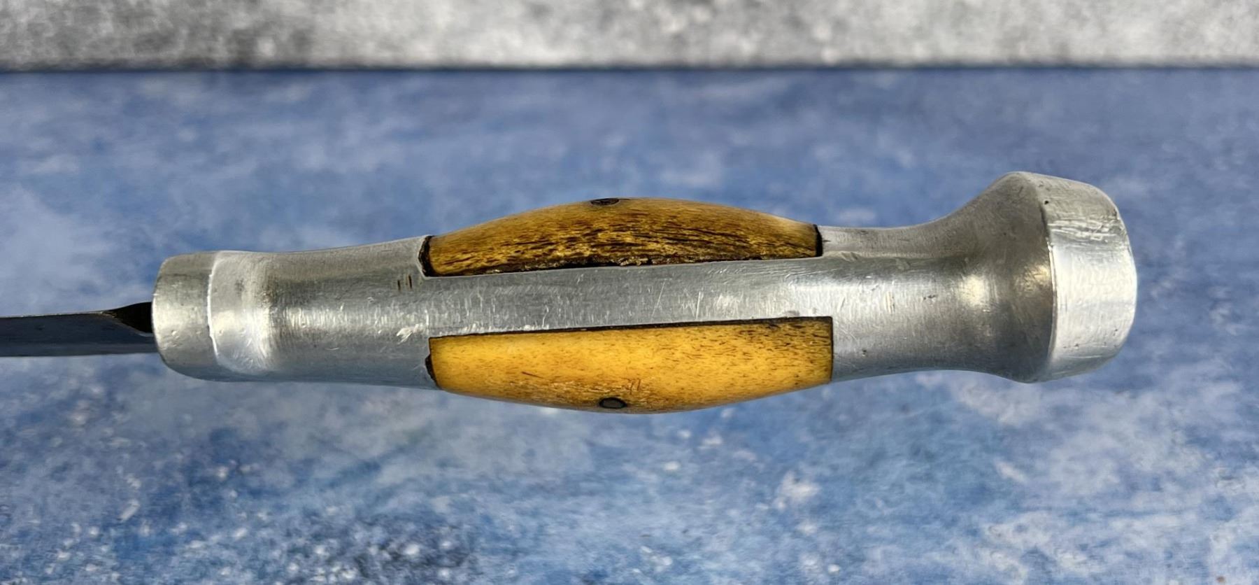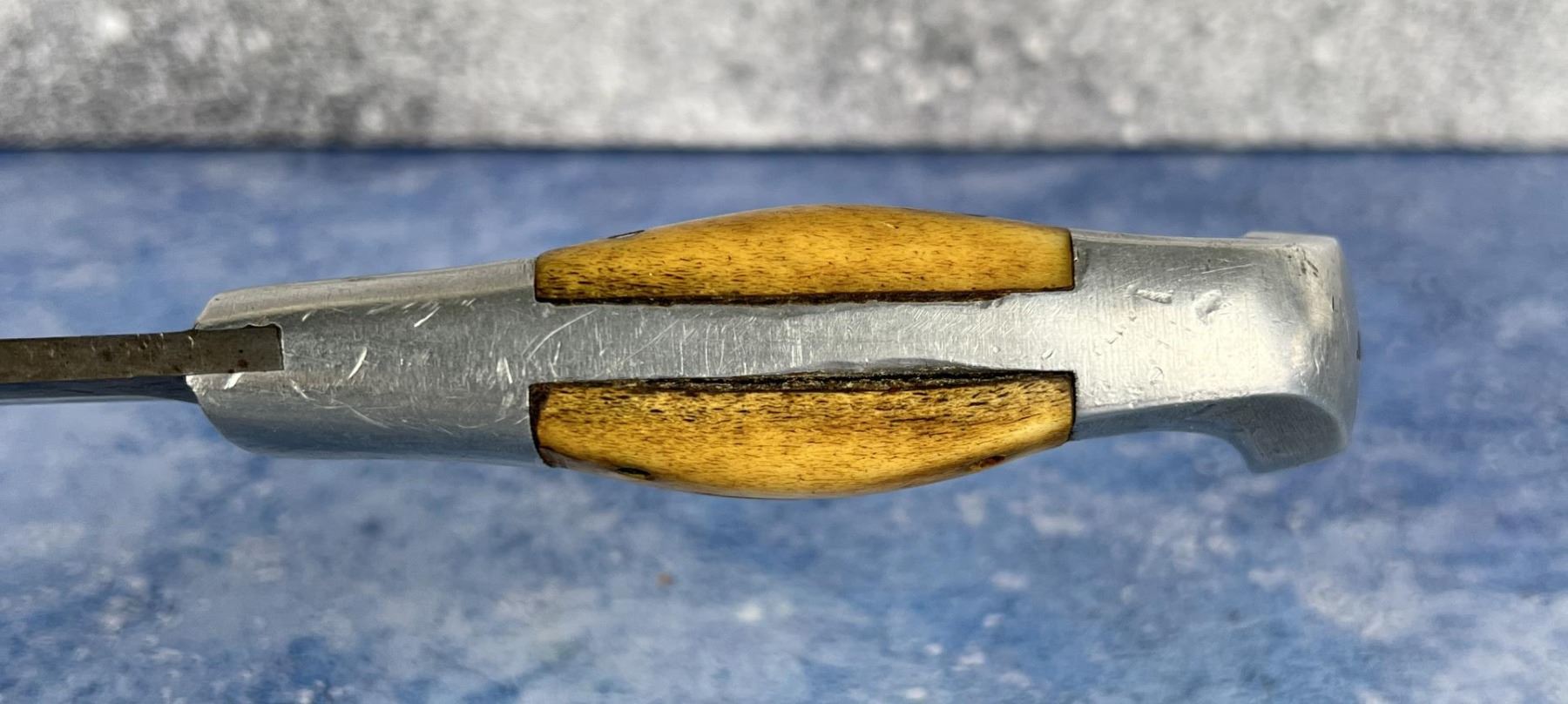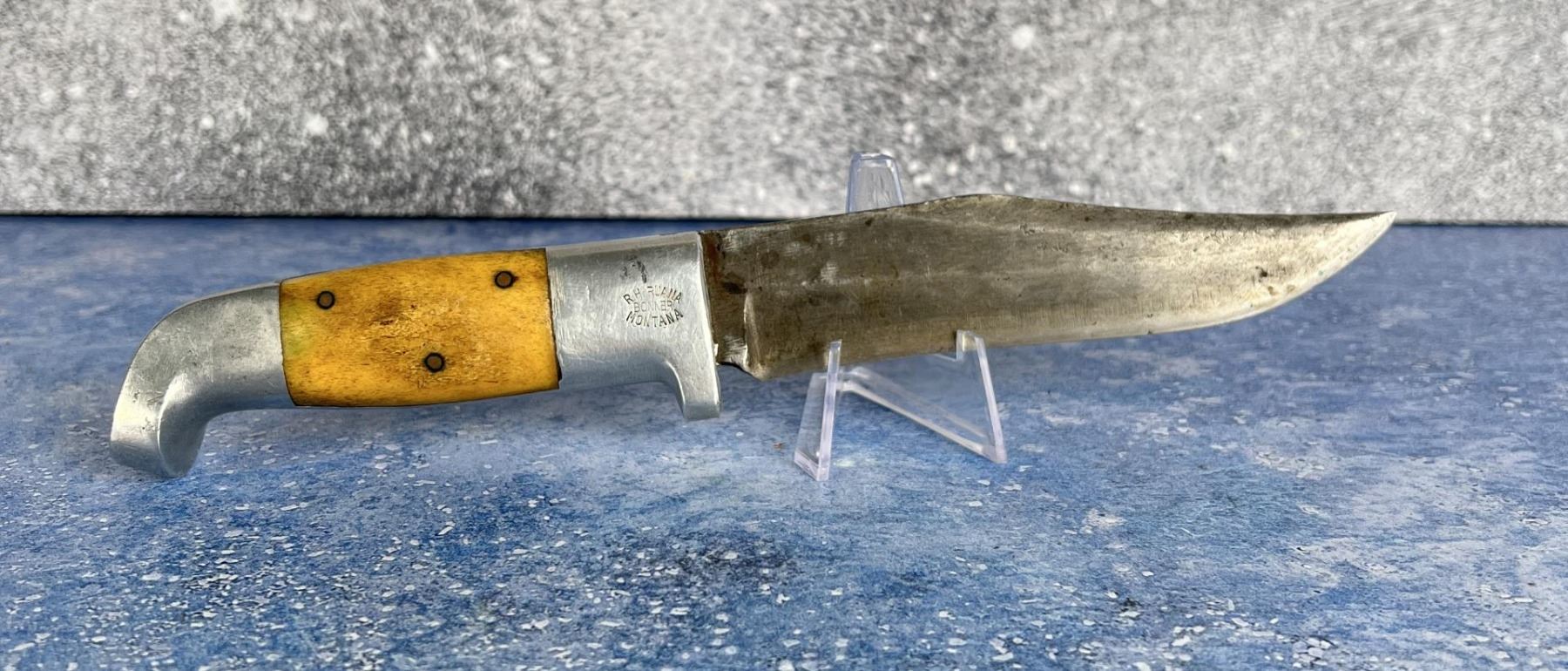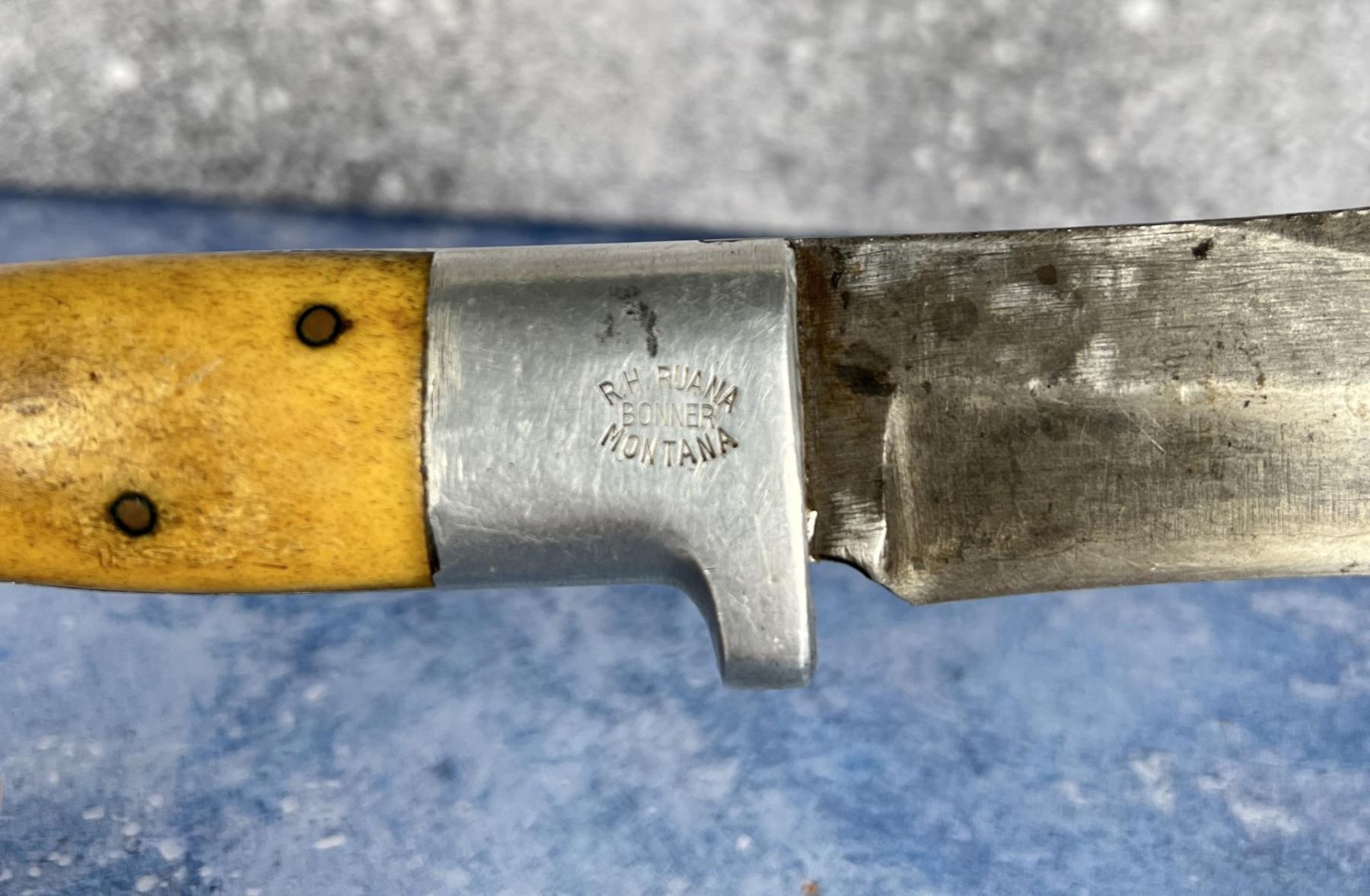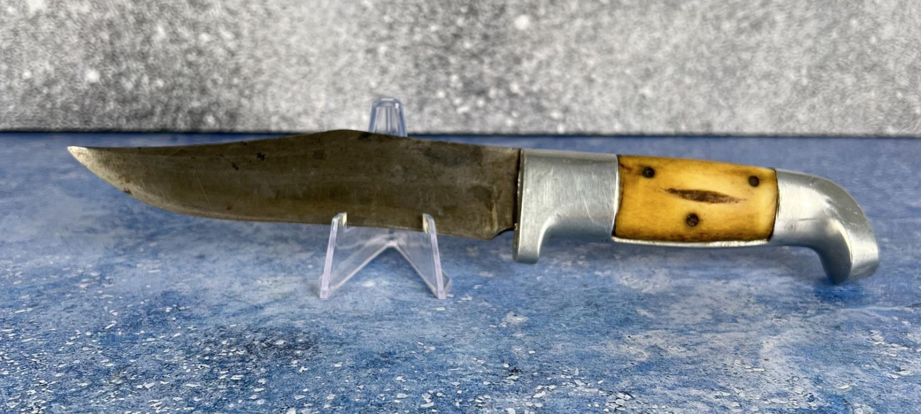 10" long. No sheath. Three Copper Pin, Square Cut, Made 1943-1944. Made by Rudy Ruana in Bonner Montana. No cracks or damage to the aluminum.