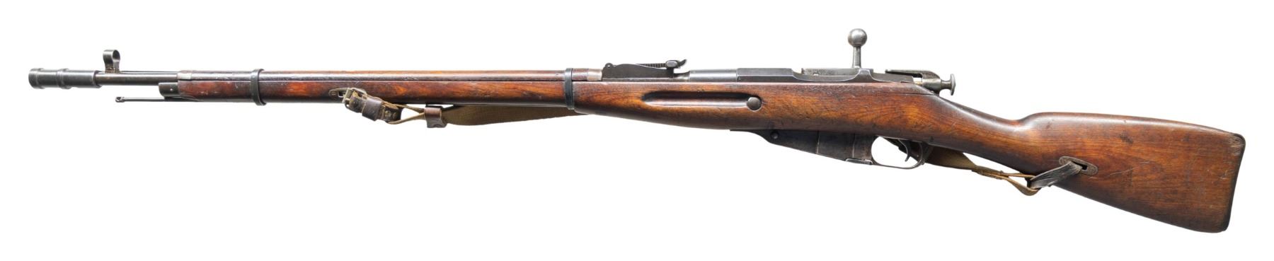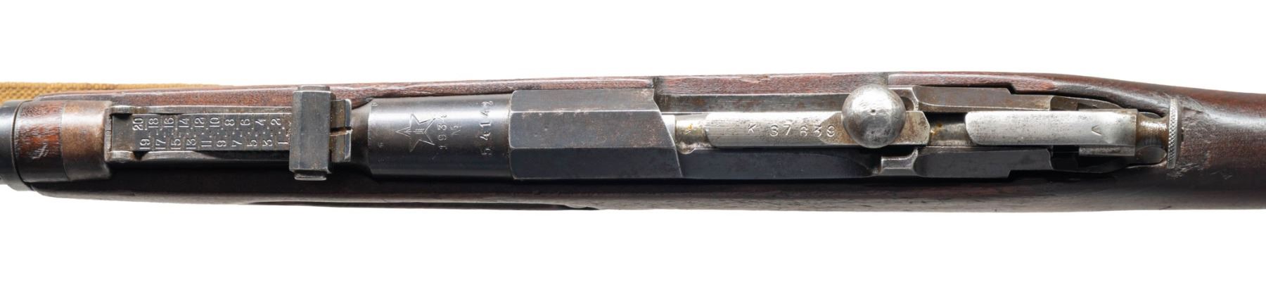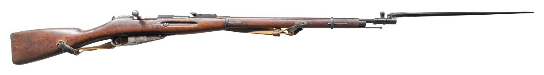 Cal. 7.62x54R. S# 54142, Bbl. 29". Post front sight with hood. Tangent rear sight graduated to 2000m. Bolt is mismatched but other visible parts are matching to bbl. shank. Bbl. shank has 1934 date & Tula star. Rifle does not appear to have had any post war rework. Some parts have Izhesvk markings. No visible import markings. A tag is attached stating this rifle was picked up in Russian during WW2 by Pasquale Bond, a Merchant Marine & Sailor. Blued finish. Hardwood stock with screw in sling slots, canvas sling & faint Russian roundel on right side of butt. Cleaning rod present. UNATTACHED ACCESSORIES: 91/30 spike bayonet. CONDITION: stock set shows a large 3" crack to left of receiver, a few small cracks, some worn finish, scattered dings, chipping & handling marks. Bolt appears cleaned long ago with scattered pitting & oxidation. Balance of metal is turning gray with scattered pitting, fading, edge wear & oxidation. Action functions properly when hand cycled. Bore is mostly bright with some scattered oxidation & pitting but strong rifling. (25-2839/MJC). CURIO. $400-600.