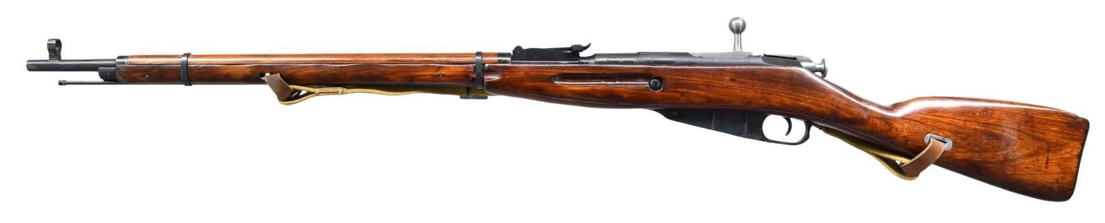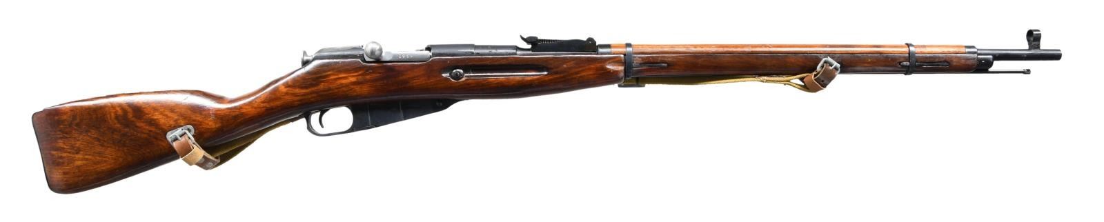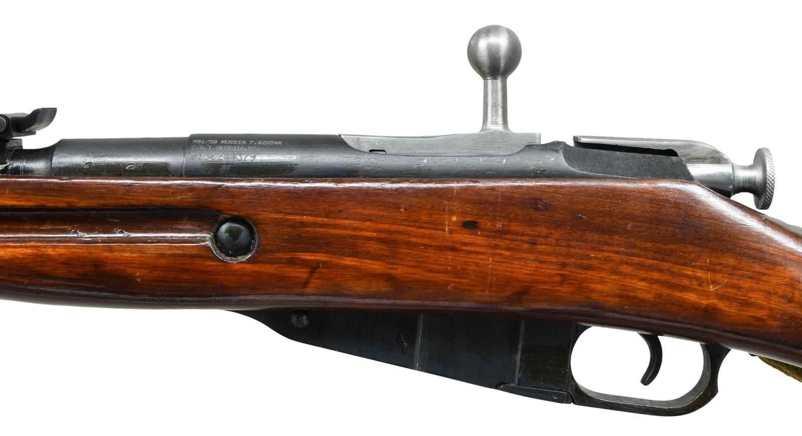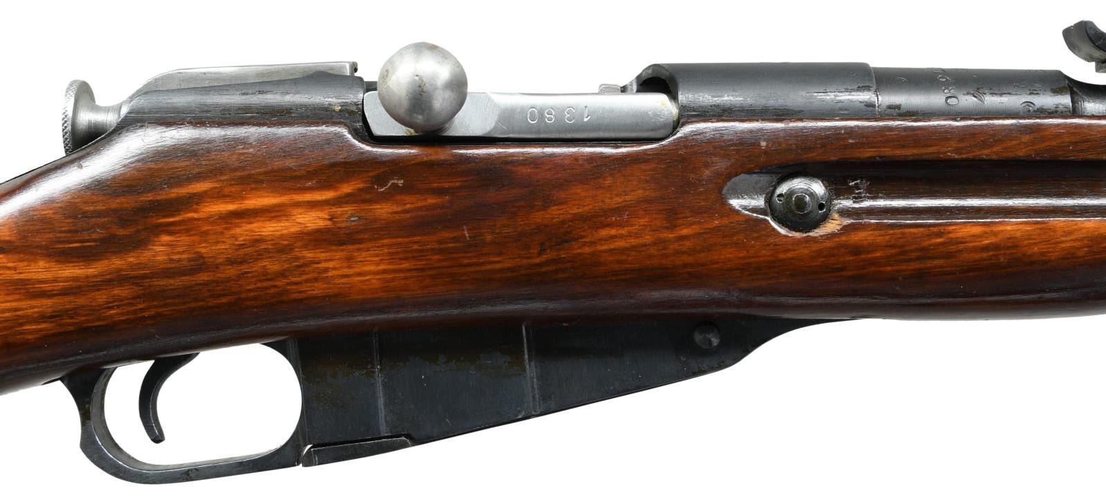 Cal. 7.62x54R. S# 9130244379. Bbl. 29". All matching numbers as arsenal refurbished. Top of bbl. has Izhevsk markings w/ 1942 date & serial. Top of receiver has diamond refurb marking. Left side of receiver has import markings & importer added serial. Tangent rear sight graduated to 2000m. Post front sight w/ hood. Hardwood stock set w/ sling slots & canvas Mosin sling. Cleaning rod present. CONDITION: stock set has arsenal added finish w/ some flaking & handling wear. Metal retains 92% arsenal rework blue w/ some edge & handling wear. Good bore w/ some frosting but strong rifling. (23-1955/MJC). CURIO. $100-300.