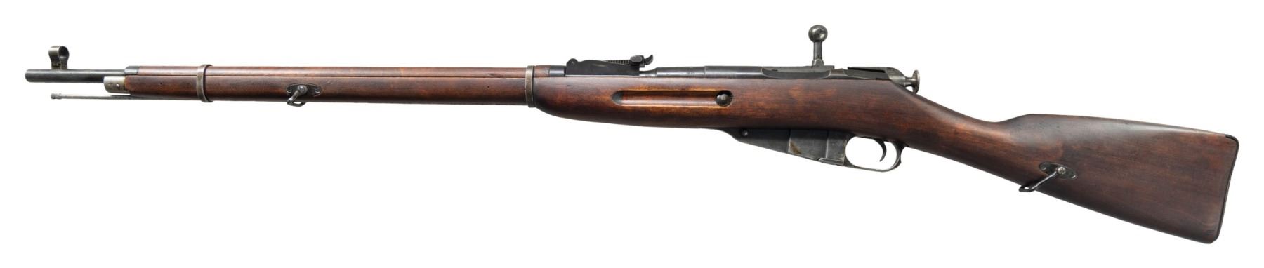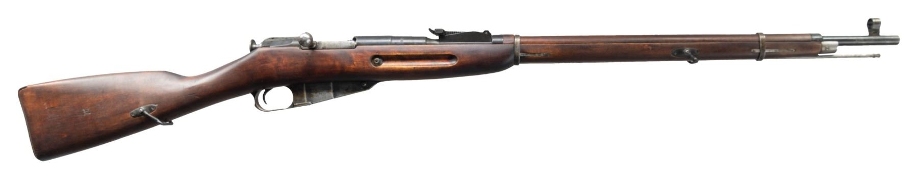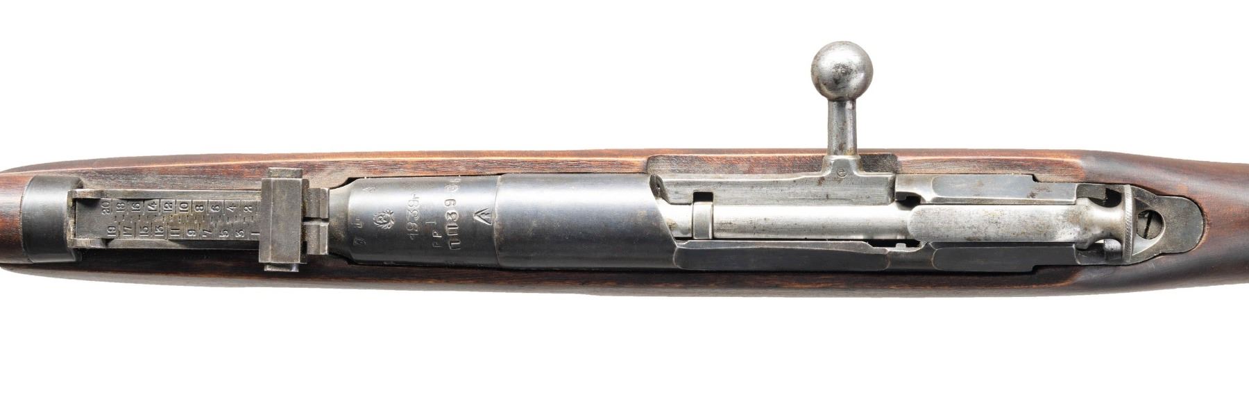 Cal. 7.62x54R. S# PP3906. Bbl. 29" with Century import marking. Post front sight with hood. Tangent rear sight graduated to 2000m. Mismatched numbers throughout. Bbl. shank has Izhevsk markings with 1939 date & importer translated serial number. Left side of receiver has two boxed Finnish "SA" army stamps. Arsenal blue finish. Finnish "Pot belly" stock with bottom mounted sling swivels & Finn cartouche on right side of butt. Cleaning rod present. CONDITION: stock set has Finn arsenal rework finish with scattered finish wear, dings & handling marks. Metal retains 40% mix of arsenal blue finishes with some pitting on mag body, scattered edge wear, dings, fading to gray & oxidation. Action functions properly when hand cycled. Muzzle has counterbored for a few inches, bore otherwise shows scattered oxidation but evident rifling. (25-3835/MJC). CURIO. $150-250.