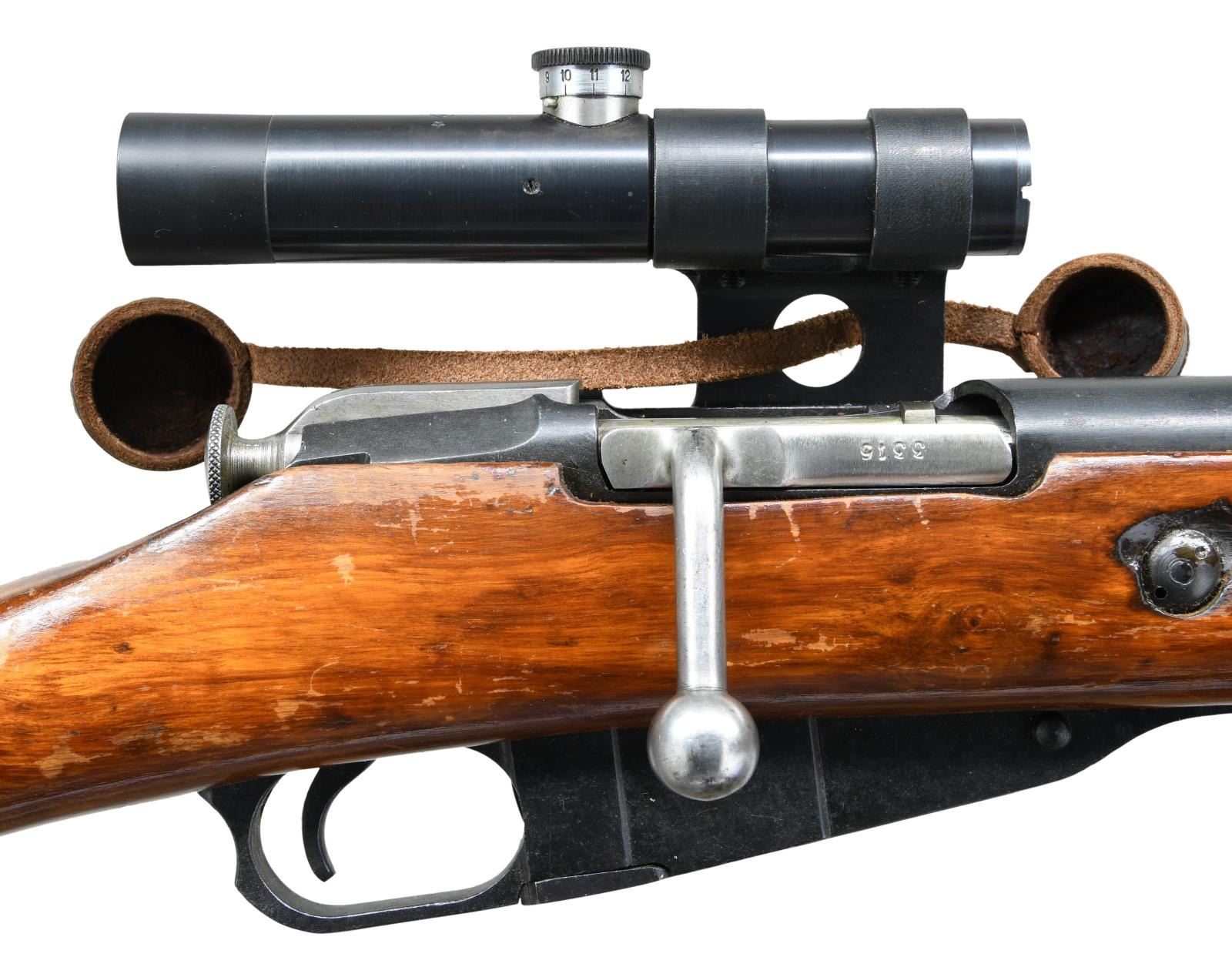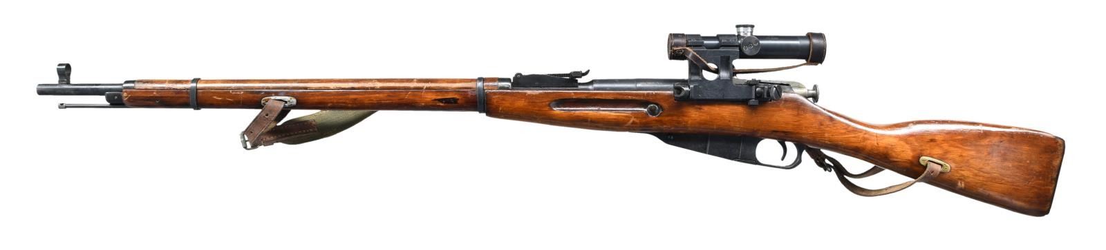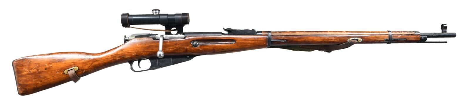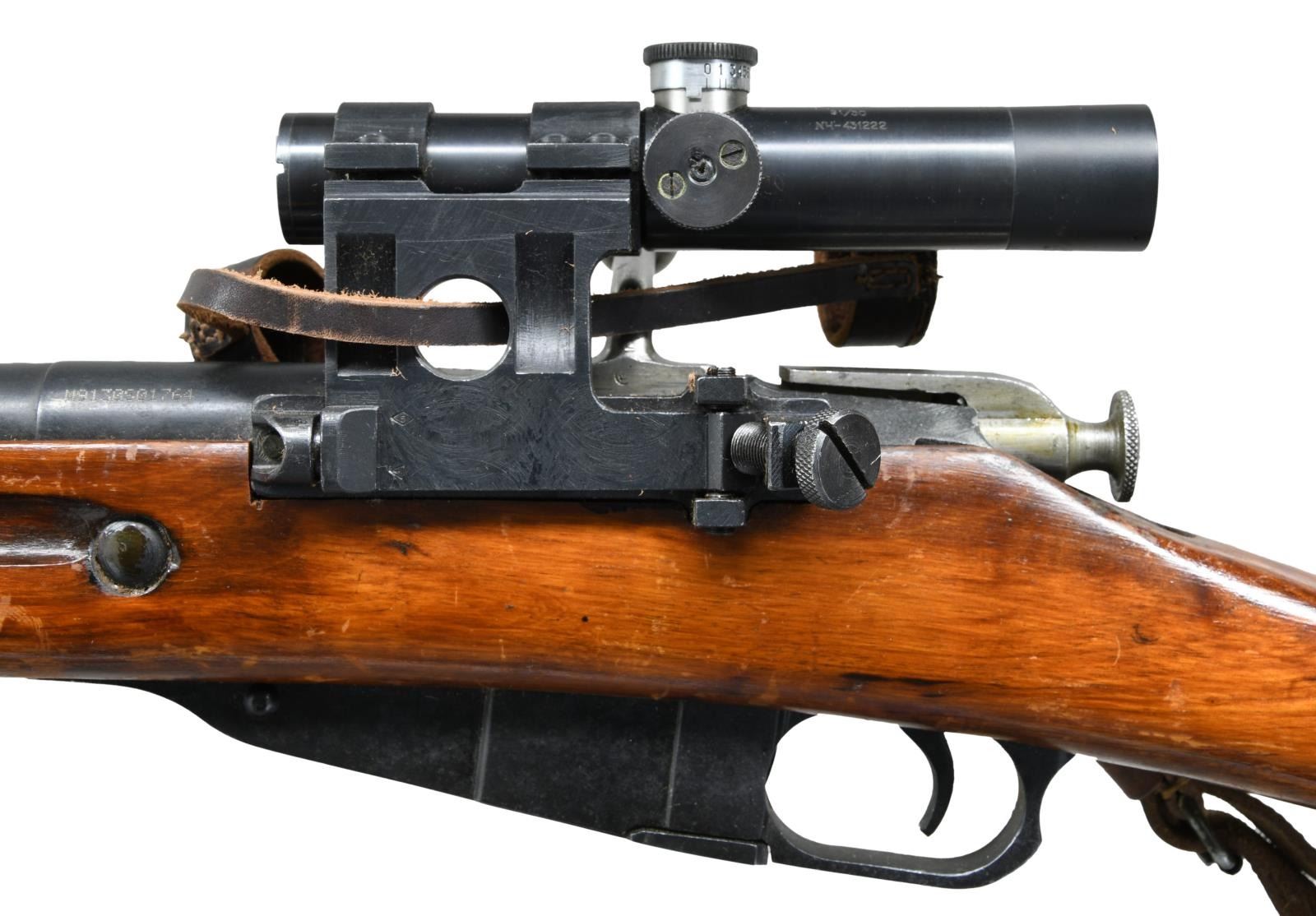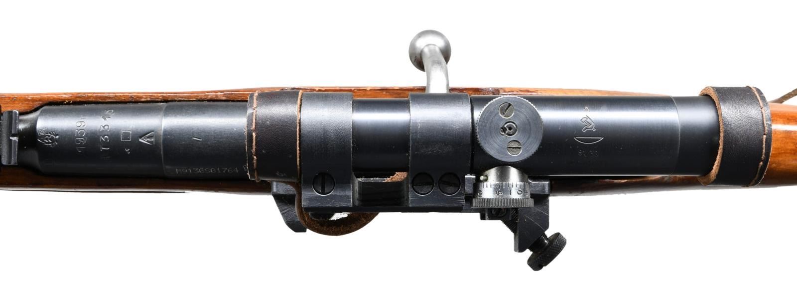 Cal. 7.62x54R. S# M9130S01764. Bbl. 29" w/ import marking. Importer assembled sniper rifle. All matching numbers as arsenal refurbished. Top of bbl. has Izhevsk markings, serial, refurb marking & 1938 date. Left side of receiver has importer added serial. Tangent rear sight graduated to 2000m. Reproduction 3.5x power PU sniper scope & mount. Scope has post reticle & optics w/ a slight green tint. Post front sight w/ hood. Hardwood stock set w/ screw in sling slots & green canvas sling. UNATTACHED ACCESSORIES: scope lens covers & sniper action cover. CONDITION: arsenal reworked stock set w/ scattered flaking shellac & handling marks. Metal retains 85% arsenal reworked blue w/ some blued over pitting on magazine body & fading on the exposed edges. Fair bore w/ scattered frosting but strong rifling. (23-1916-MJC). CURIO. $600-1000.