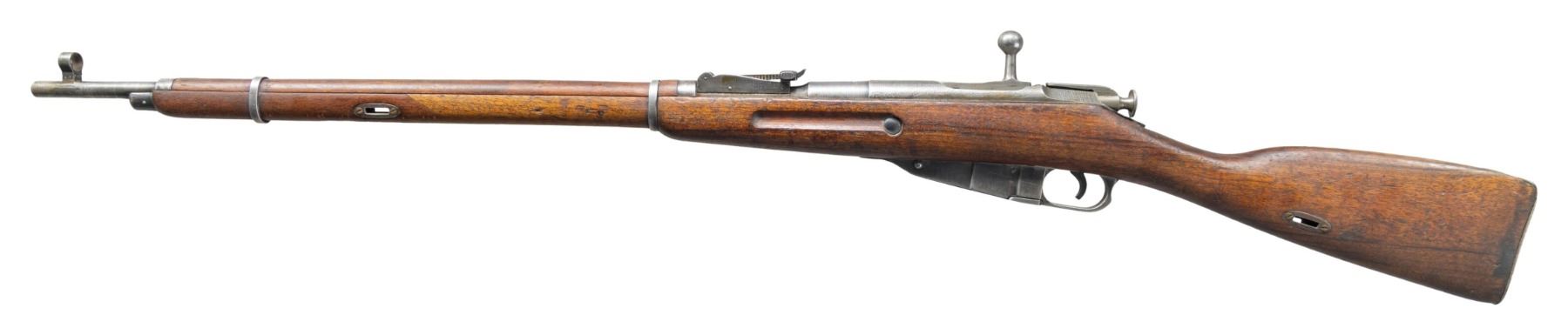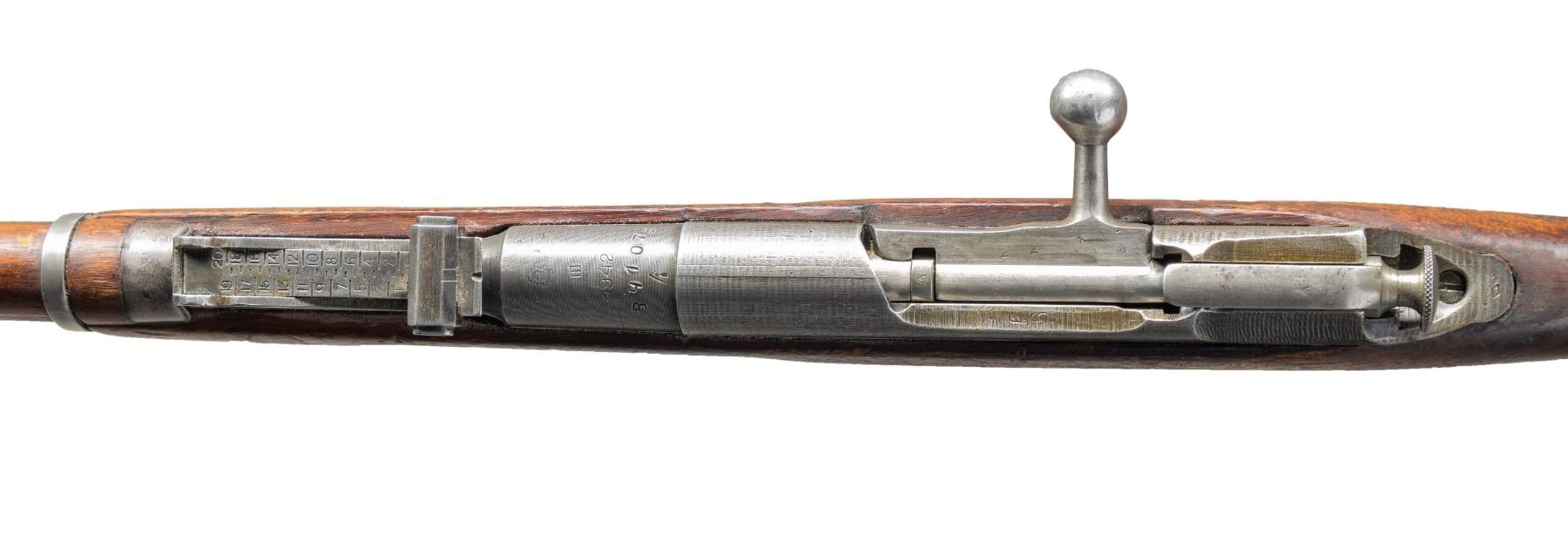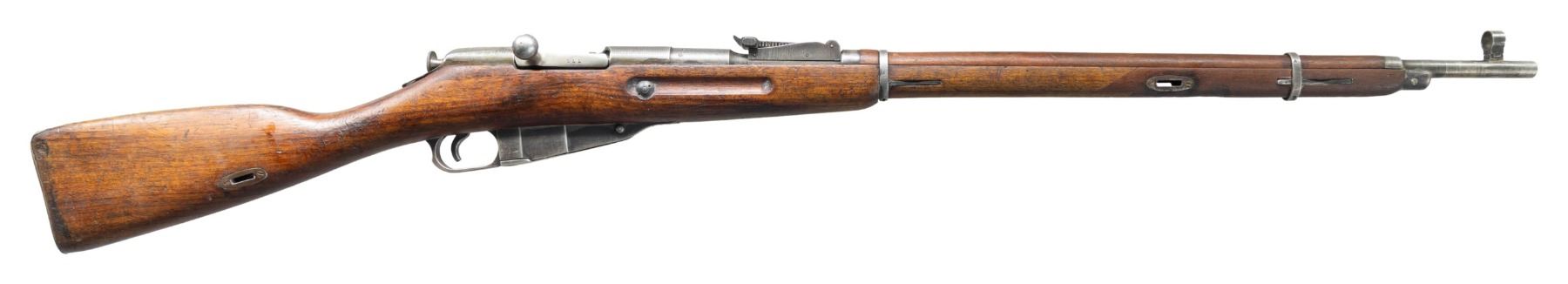 Cal. 7.62x54R. S# VT1078. Bbl. 29" with Century import marking. Post front sight with hood. Tangent rear sight graduated to 2000m. Floorplate has been arsenal renumbered to match, other parts are mismatched. Bbl. shank has Izhevsk & arsenal refurbishment markings with 1942 date. Left side of receiver has importer added serial number with translated prefix. Hardwood stock with screw-in sling slots. No cleaning rod present. CONDITION: stock set has large armorer splice repairs on front of forend, scattered dings, staining & handling marks. Upper tang is proud of wood. Balance of metal is a silvery-gray color with traces of arsenal rework blue, some pitting on mag body, handling marks & dings. Action functions properly when hand cycled. Bore shows scattered frosting & light pitting but strong rifling. (25-3800/MJC). CURIO. $100-200.