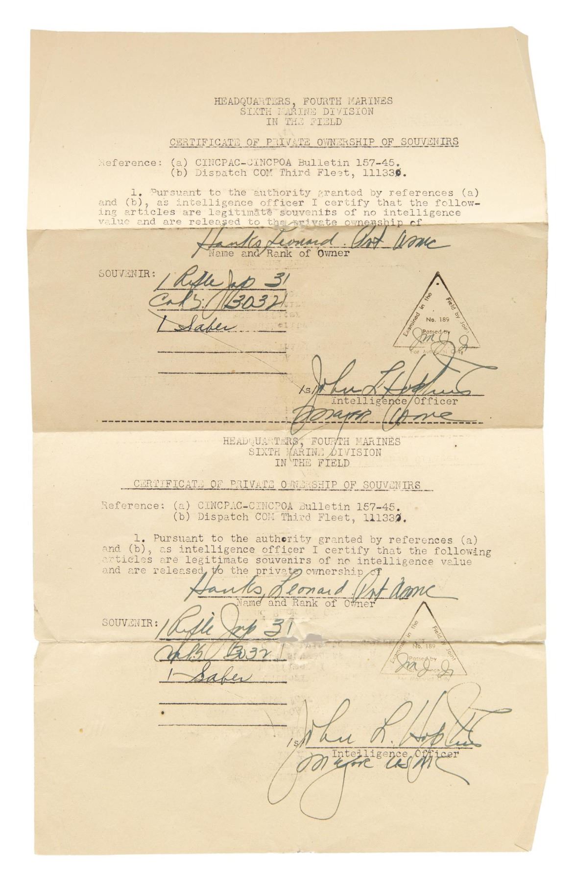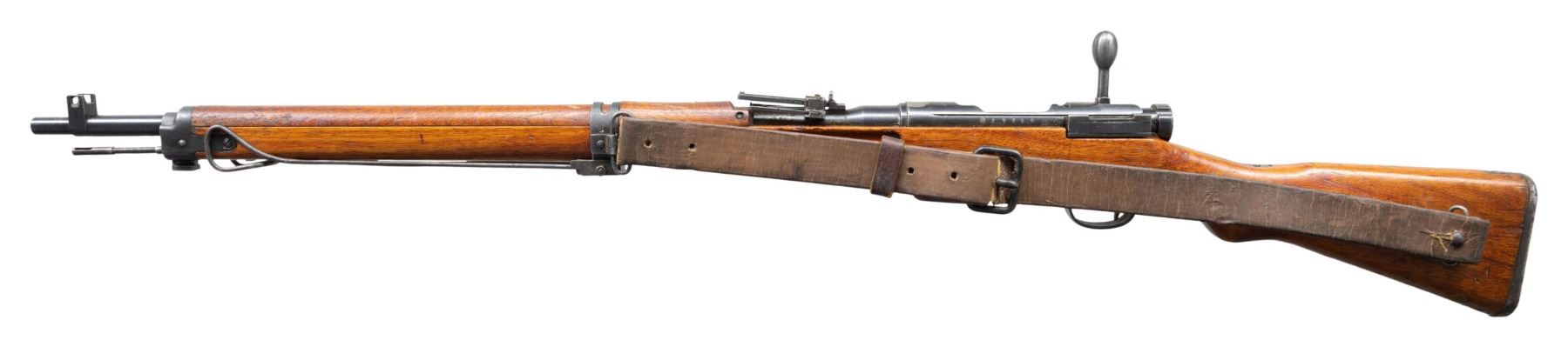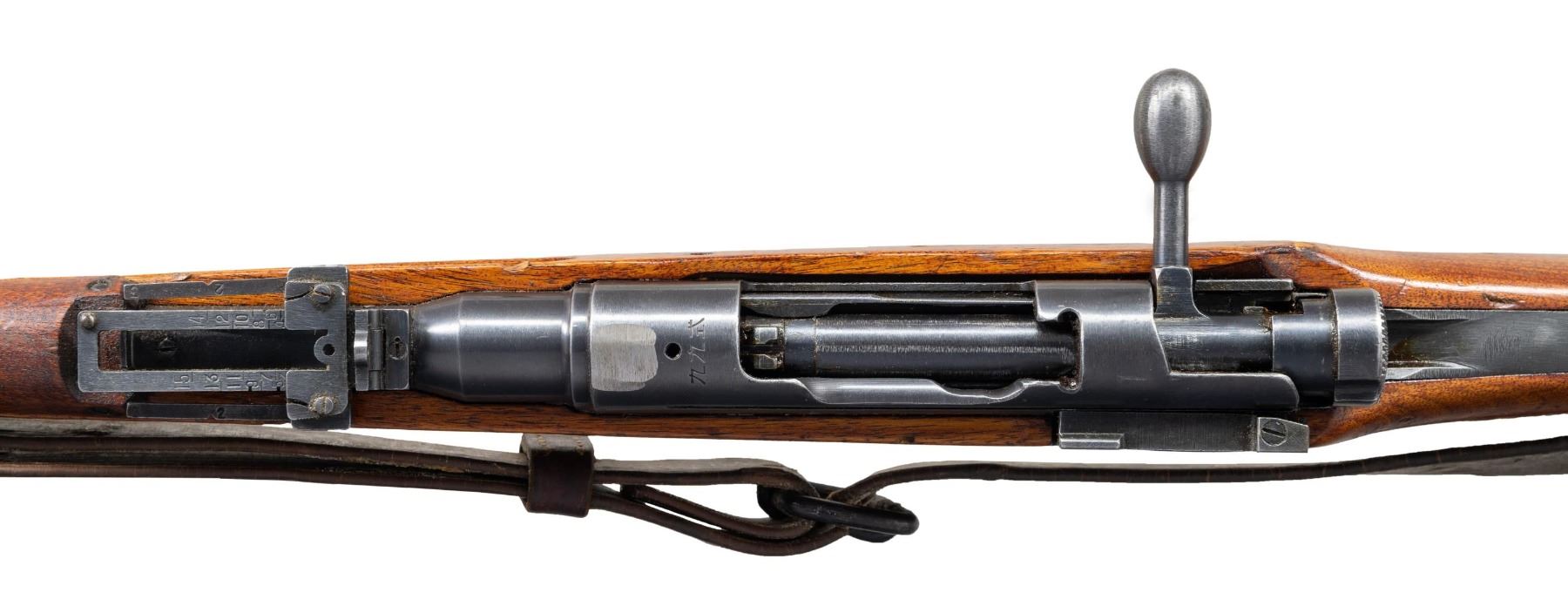 Cal. 7.7 Jap. S# 27159. Bbl. 25 7/8. Early Type 99 sights with AA wings on rear sight. Bayonet lug is unnumbered & chrome faced bolt is numbered differently than receiver possibly an assembly number. Receiver top has ground mum & Type 99 markings. Left side of receiver has 30th series & Toyo Kogyo markings with serial. Blued finish. Asian hardwood stock with left side sling swivels & original sling. Underside of stock has clear Kanji inspection stamps. Cleaning rod & monopod present. UNATTACHED ACCESSORIES: old Japanese cloth & copy of USMC Marine Corps souvenir bringback paperwork. The paper lists Leonard Hanks Private of the Sixth Marine Division as bringing back one "31 Cal Jap Rifle" back along with a saber. This rifle was consigned by Mr. Hank's family. The 6th Marine division fought at Okinawa most notably taking part in Sugar Loaf & Naha. CONDITION: stock shows a high degree of Urushi finish with a few gouges, a 5" crack on handguard, scattered dings & handling marks. Metal retains 90% original blue with scattered thinning, edge wear & light oxidation. Action functions properly when hand cycled. Bright near excellent bore. (25-4946/MJC). CURIO. $700-1000.