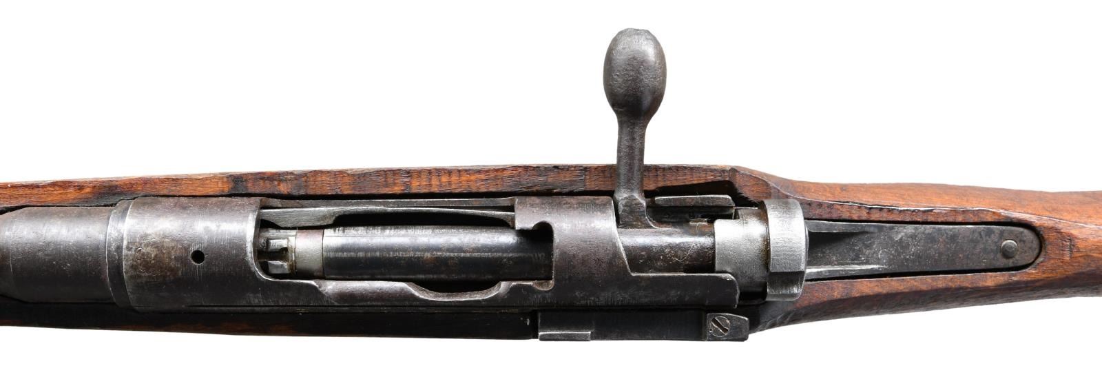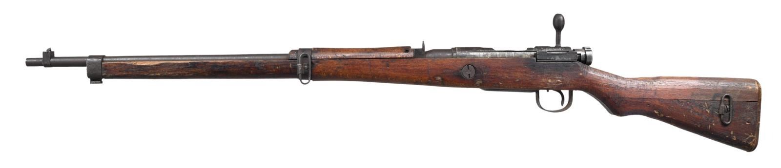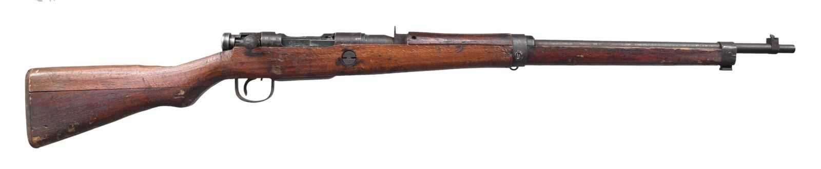 Cal. 7.7 Jap. S# 27164. Bbl. 25 1/2". Mismatched numbers on bolt parts. Top of receiver has ground mum. Left side of receiver has 27th series marking, serial & Tokyo Juki Koygo symbols. Fixed rear sight. Blade front sight w/out protective ears. Asian hardwood stock set w/ left side sling swivels. Stock has chatter at wrist & inspection stamps on bottom of butt stock. CONDITION: stock set shows notable chipping on left side of forend, scattered gouges, flaking, dings & handling marks. Metal is mostly a dull gray patina w/ scattered oxidation. Good bore w/ some light pitting. (23-1979/MJC). CURIO. $200-300.