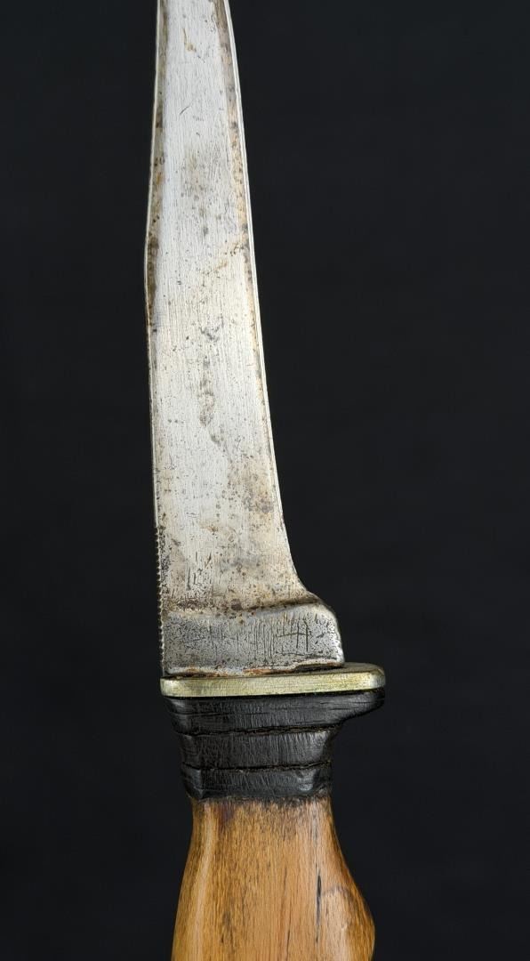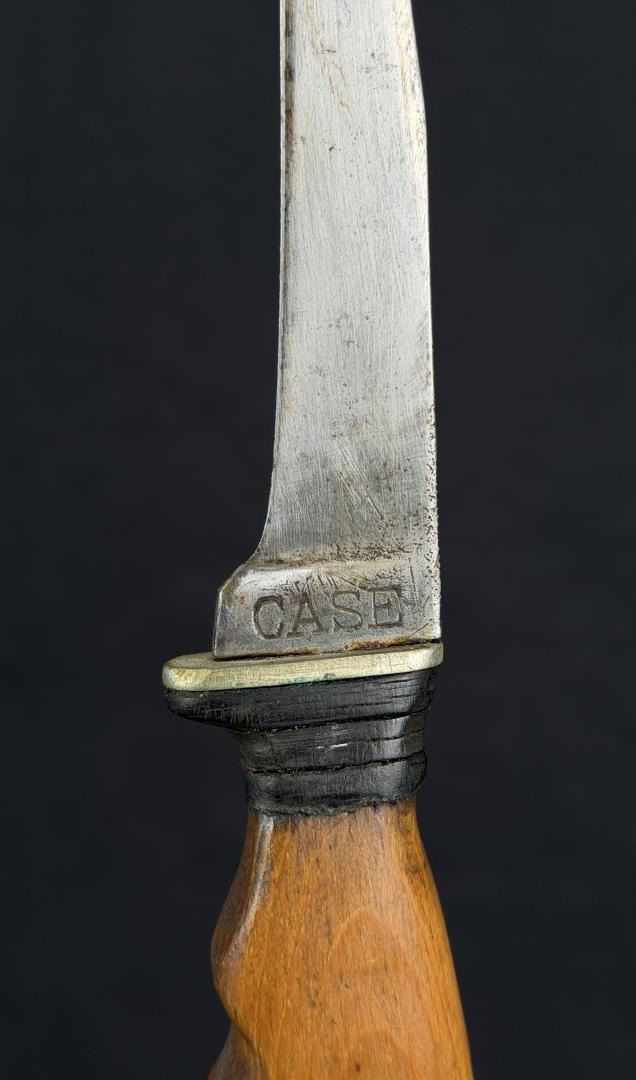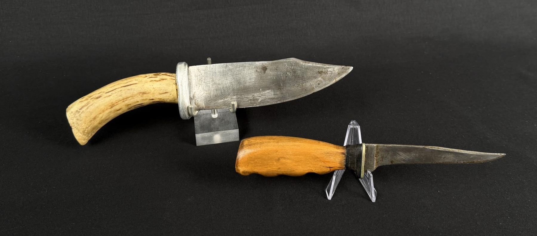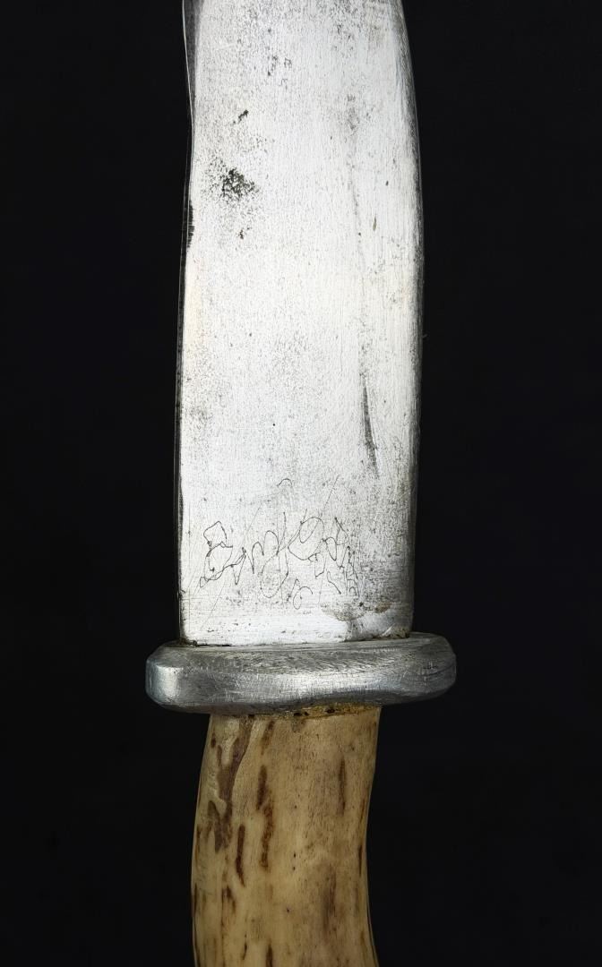 Bowie style knife with antler handle measures 10 1/2" long overall and has an illegible signature on the blade. The other piece is a case blade that has been rehandled. it measures 8 1/2" long overall.