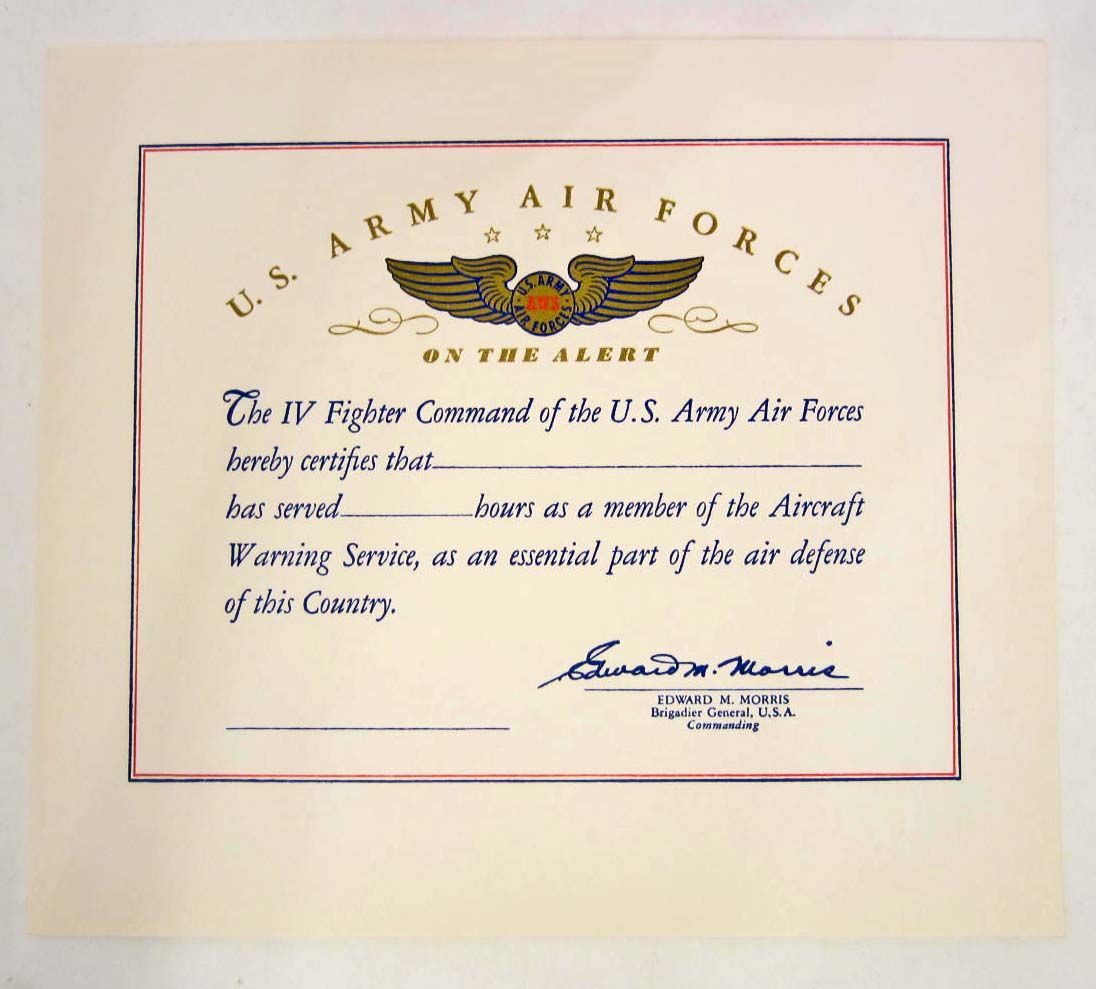 Awarded to Civilians on the West Coast that Volunteered to watch the skies for Enemy Aircraft during the war. Awarded by Brigadier General Morris for a certain number of hours achieved. Unused.