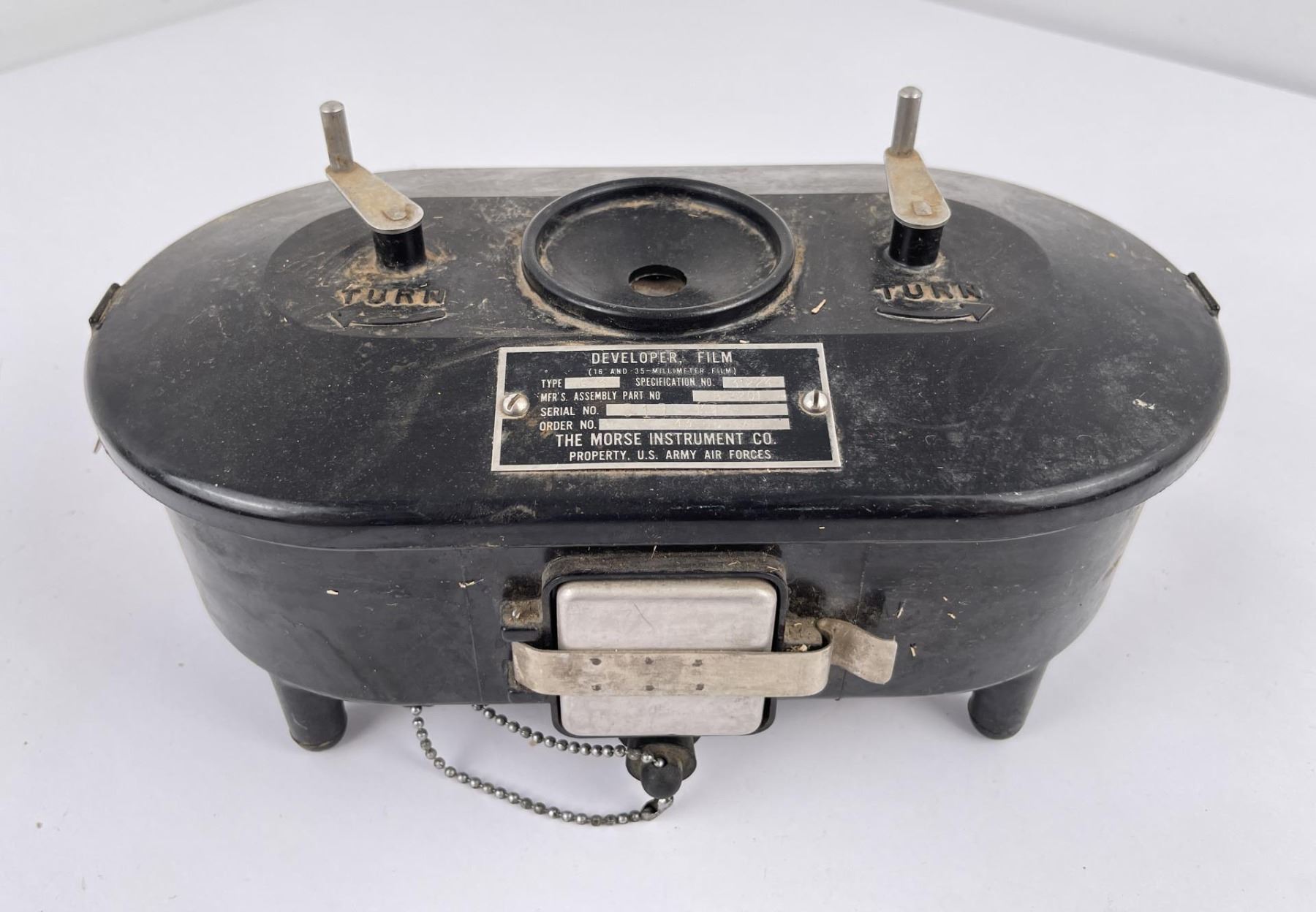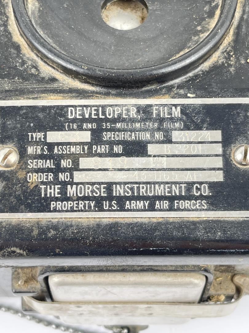 Morse (G-3) cine film developing tank made for US Army Signal Corps. Made by the Morse Instrument Co. in Hudson, Ohio. Special version made for the US Army Signal Corps. Contract #AF-17883 . Vintage film developing tank made of bakelite. Heavy duty material. This version of the Morse tank allows processing of 16 or 35mm motion picture film. It will accommodate up to 100' rolls of film. The tank has two adjustable film reels inside. Two hand winding cranks on the top of the tank for film loading, and agitation.