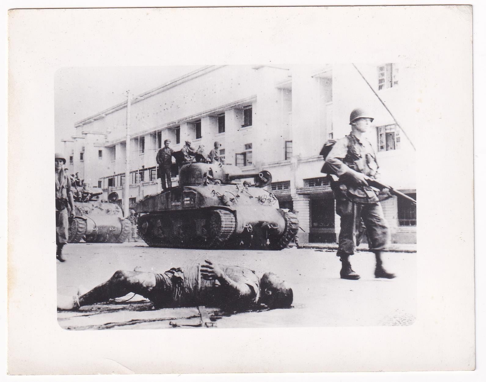 4" by 5". Shows the US Army Sherman tank infantry and dead Japanese solder.