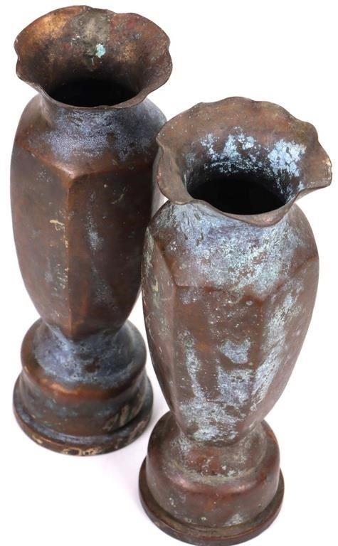 WWII trench art lot to include two vases made from 40mm gun shells. .