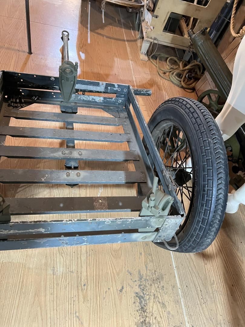 Rare early WW2 USMC Aluminum Machinegun Handcart. Has 19" spoked Wheels. Original Draw Bar Handle. 75% original Paint. Has Brackets for use with M1917A1 Browning Machinegun Tripod, and replacement footman loops which will be installed on the cart. Excellent Cond. This ultra rare early WW2 Marine Cart is not to be confused with the much more common US Army M3A4 handcart of WW2. Less than half dozen of these carts are known to be extent. and a must for the WW2 Marine or WW2 BMG collector. Hayes Otoupalik Collection