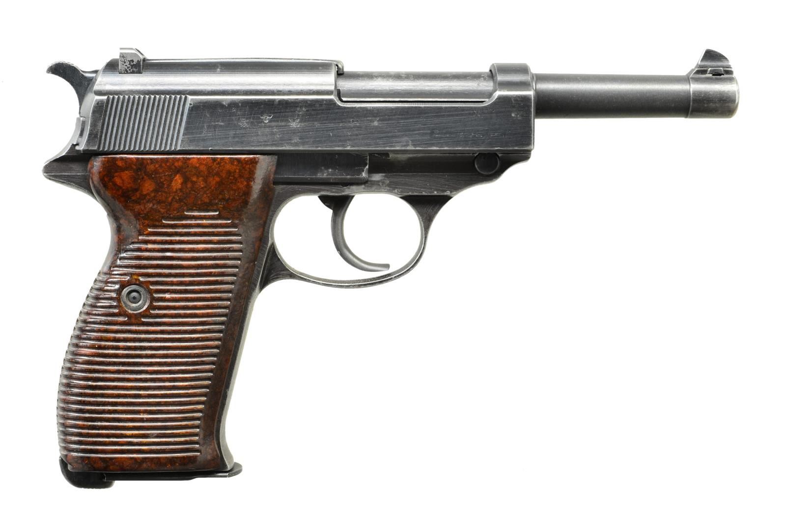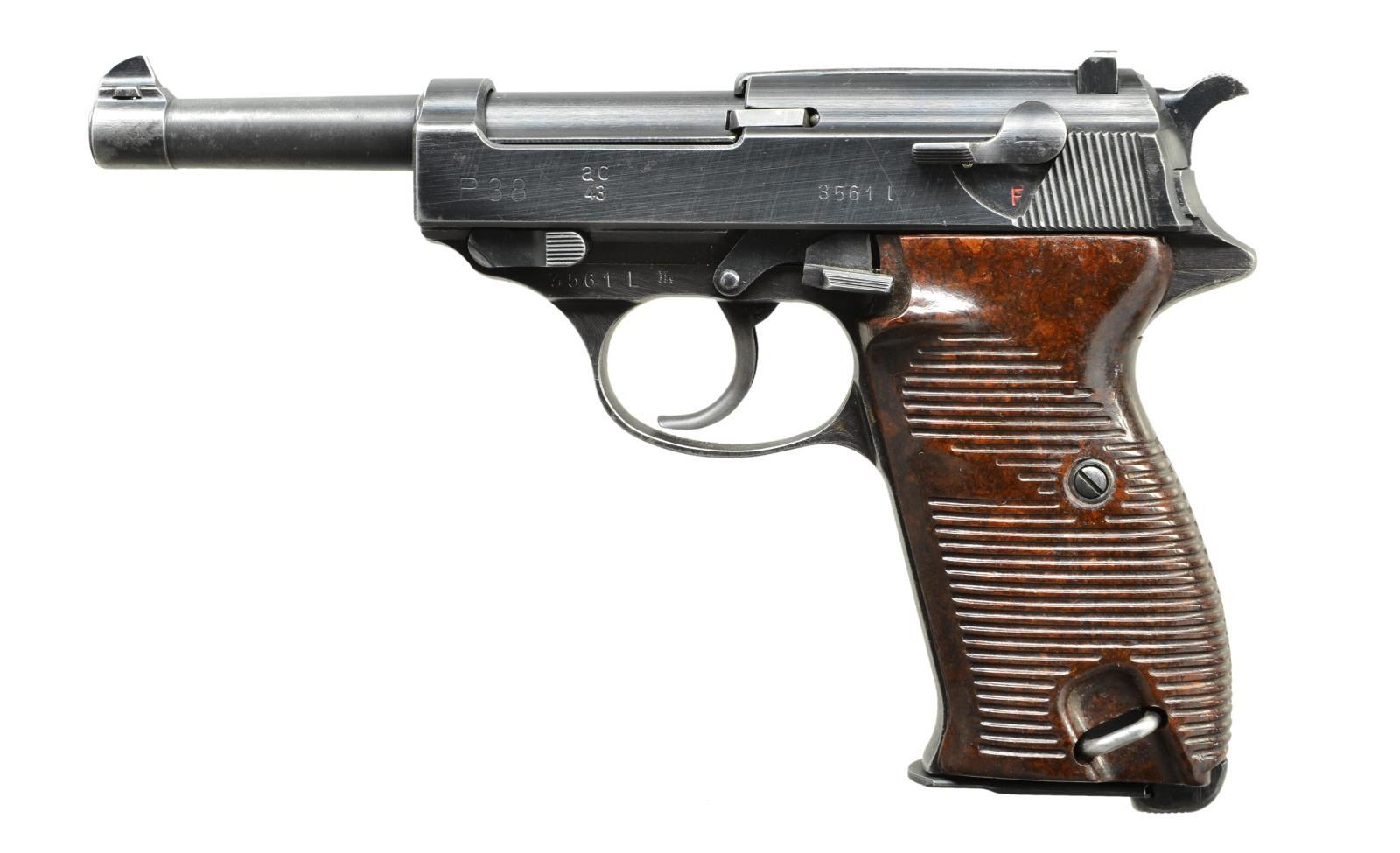 Cal. 9mm Luger. S# 3561L. Bbl. 5". 1943 dated w/ eagle 359 proofs. All matching numbers. Bakelite brown horizontally grooved grips. MAGS 1-8 rd. postwar marked w/ Walther Banner. CONDITION: grips show light handling wear. Metal retains 75% original blue w/ front strap thinning to gray, high edge wear & further thinning to gray. Worn bore w/ scattered oxidation & light pitting. (22-3155/MJC). CURIO. $400-600.