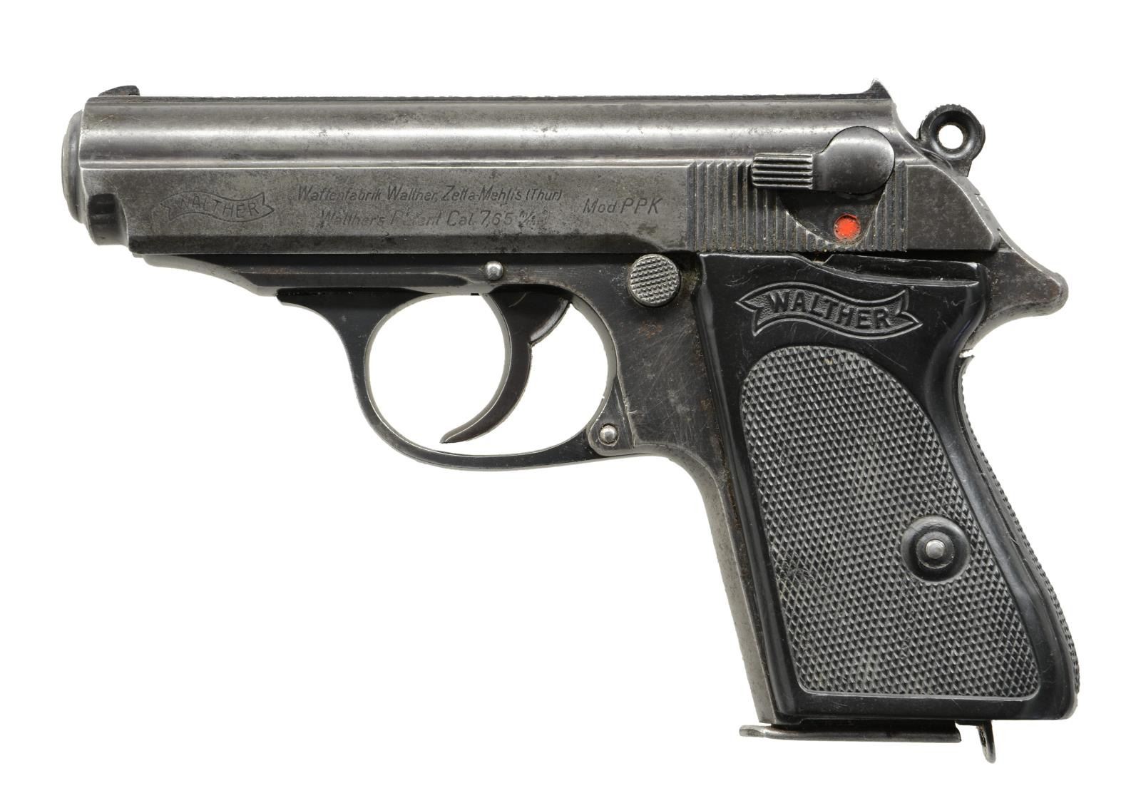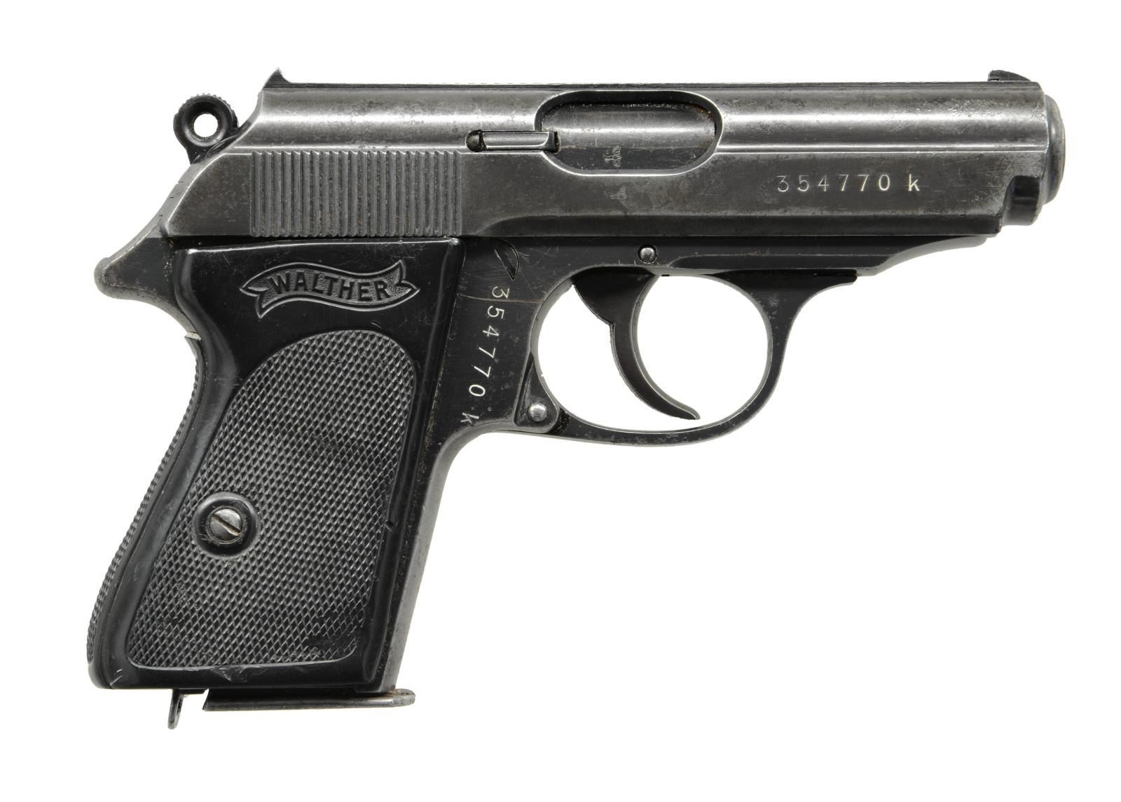 Cal. 7.65mm (32 ACP). S# 354770K. Bbl. 3 1/4". Matching numbers on slide & frame. Bbl. & slide have WW2 era "Eagle/N" proofs. Fixed sights. Black Walther banner grips. MAGS: 1-7 rd. marked w/ Walther banner on left side. CONDITION: grips show notable areas of flattened points & heavy handling wear. Metal retains 20% original blue w/ overall fading to gray, scattered oxidation & light pitting. Fair bore w/ scattered frosting & light pitting. (23-2276/MJC). CURIO. $500-700.