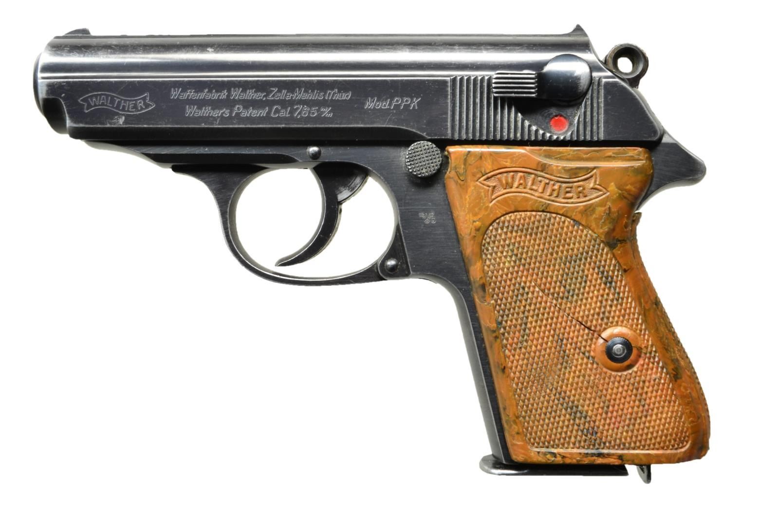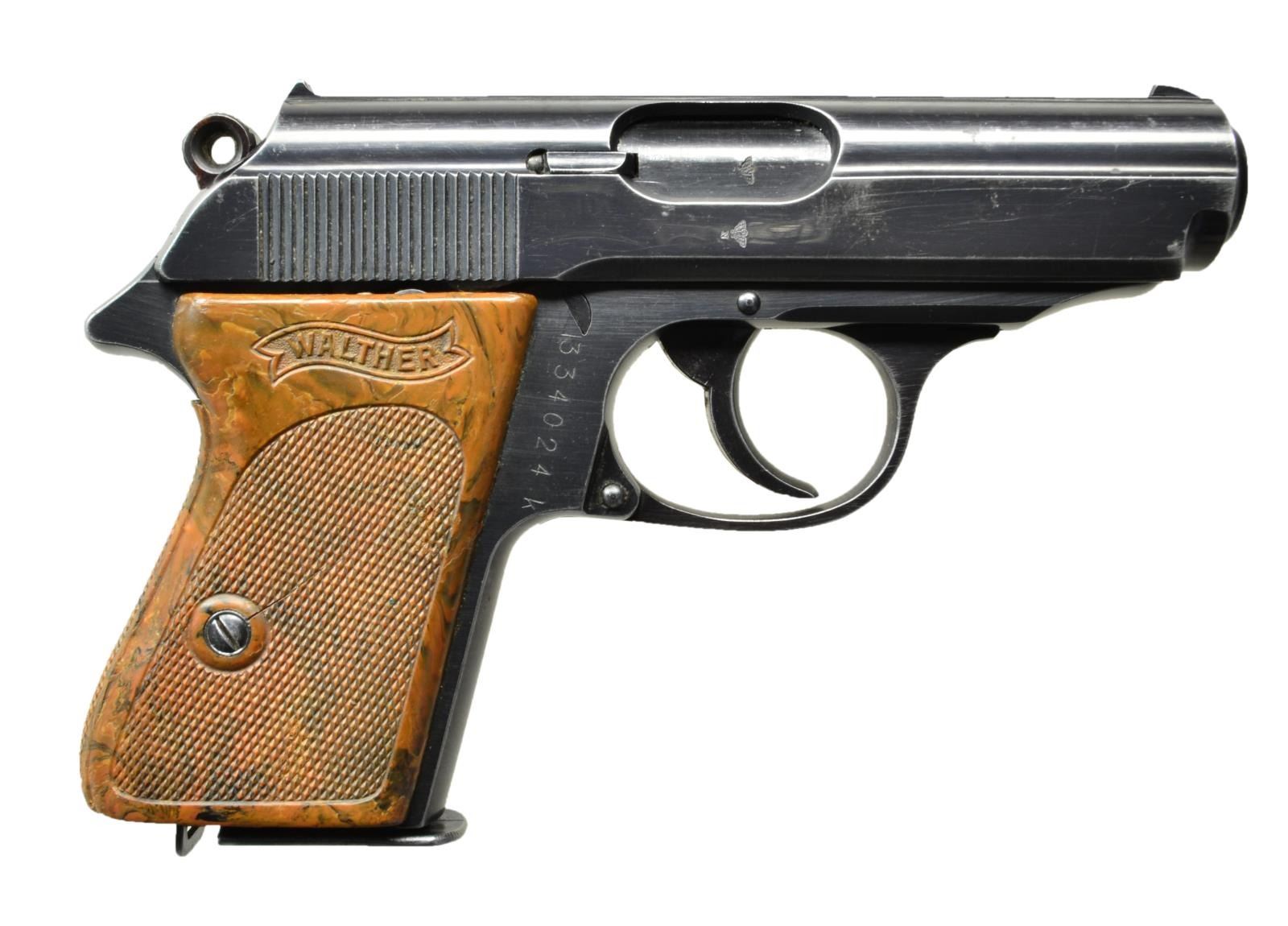 Cal. 7.65mm (32 ACP). S #334024k. Bbl. 3 1/4" w/ eagle N proof. Matching number on inside of slide. Slide has eagle N proof on left side. Slide has 60 degree safety. Left side of frame has WW2 German eagle/C police stamp. Checkered brown Walther banner grip & lanyard loop on butt. MAGS: 1- 7 rd. marked w/ Walther Banner and "PPK 7,65 m/m" on left side. UNATTACHED ACCESSORIES: brown leather holster that has spare mag pouch. Holster has black "D85" marking on inside of flap & is in fair condition w/ overall wear & flaking. CONDITION: grips have a crack on both sides above screw hole, further crack behind beaver tail , a couple spots of flaking & scattered handling wear. Metal retains 75% original blue w/ scattered high edge wear & thinning. Very good bore w/ light frosting. (22-3042/MJC). CURIO. $1000-1500.