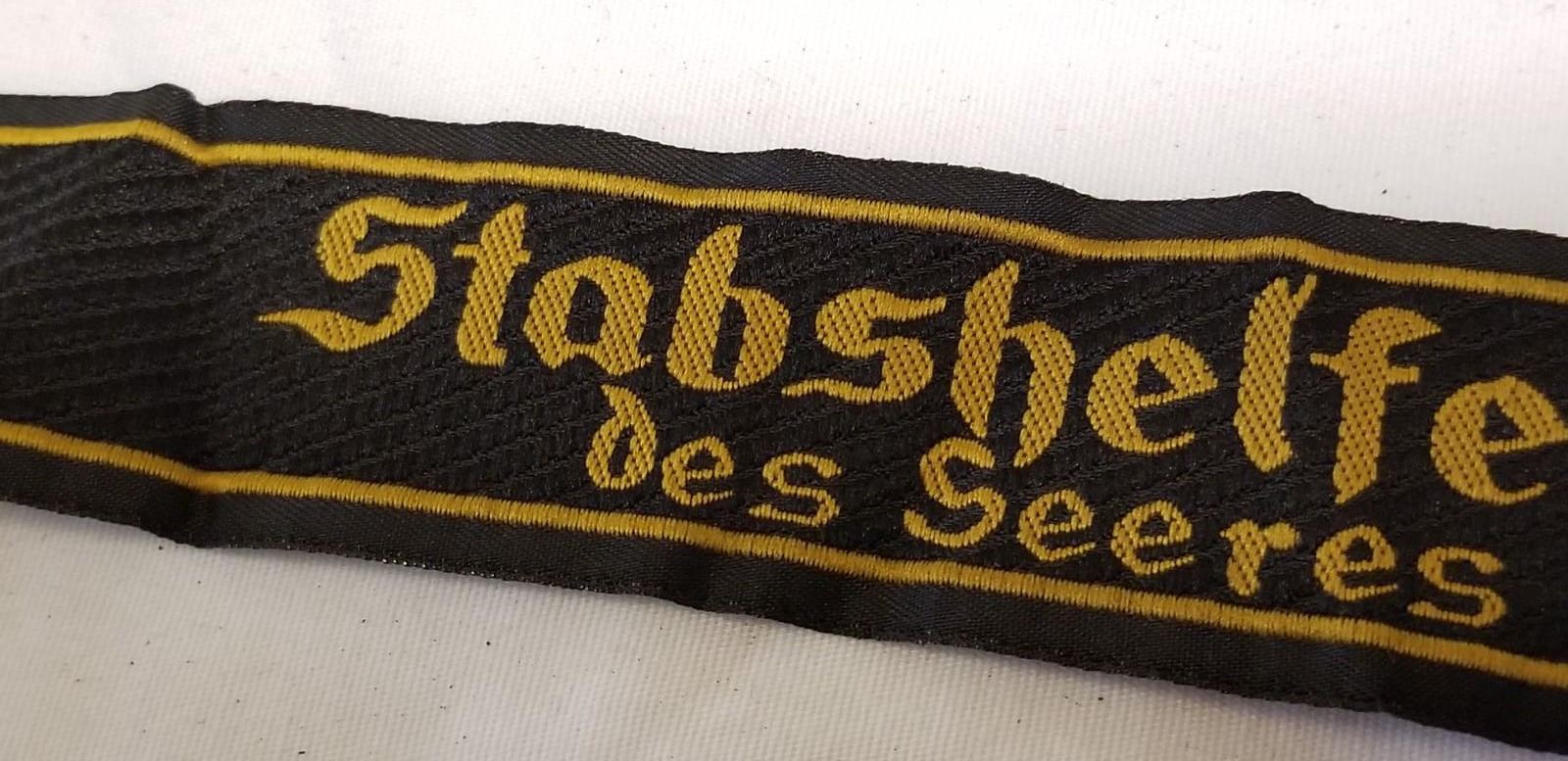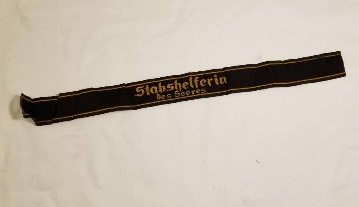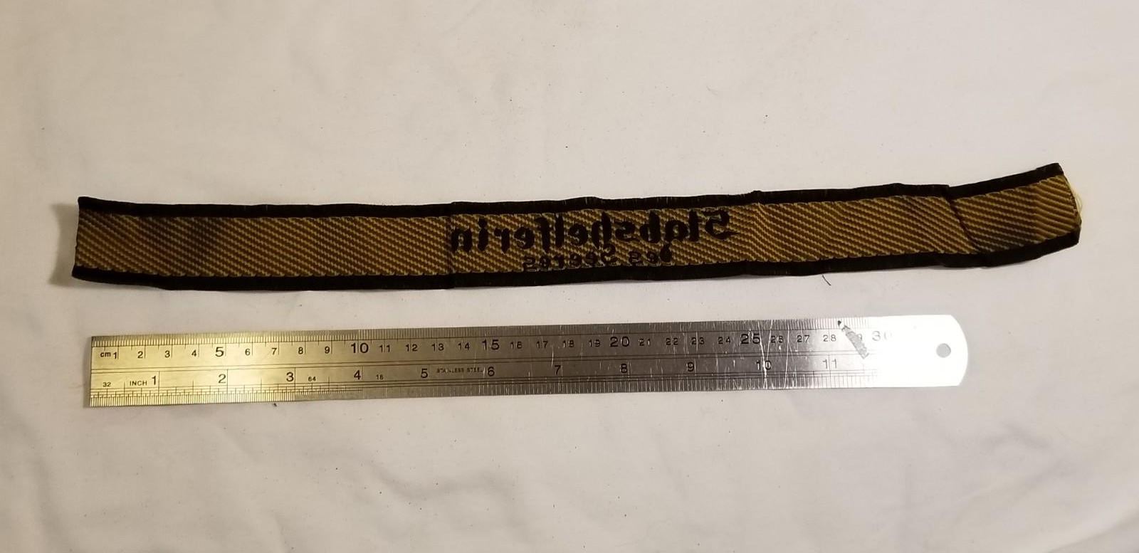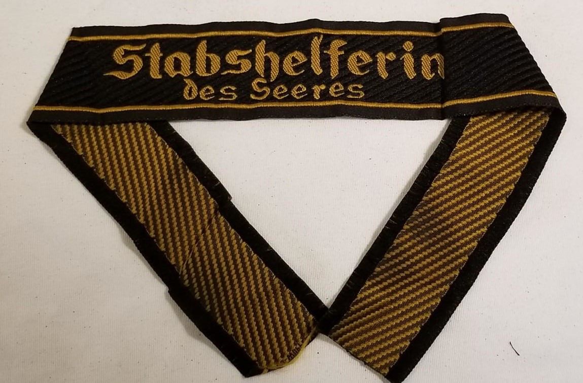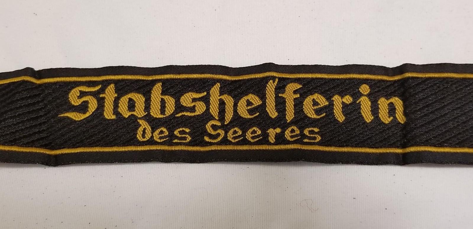 WW2 WWII Nazi German Females Third Reich Army Heer cuff title insignia Stabshelferin Des Heeres. Nice cuff title in good/used condition with no black light glow. Bevo Wuppertal marked insignia. Be sure and check out our other militaria and collectibles auctions for more Militaria, we always combine shipping!