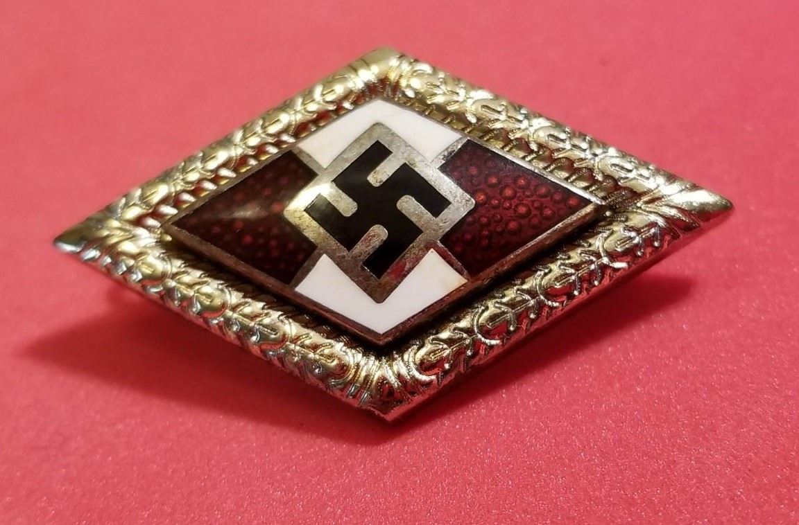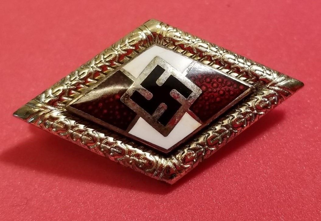 WW2 WWII Nazi German HJ Hitler Youth Third Reich golden members badge pin. Nice golden version of the Hitler Youth enamel members badge. Good condition, marked as shown. Be sure and check out our other militaria and collectibles auctions for more items, we always combine shipping!