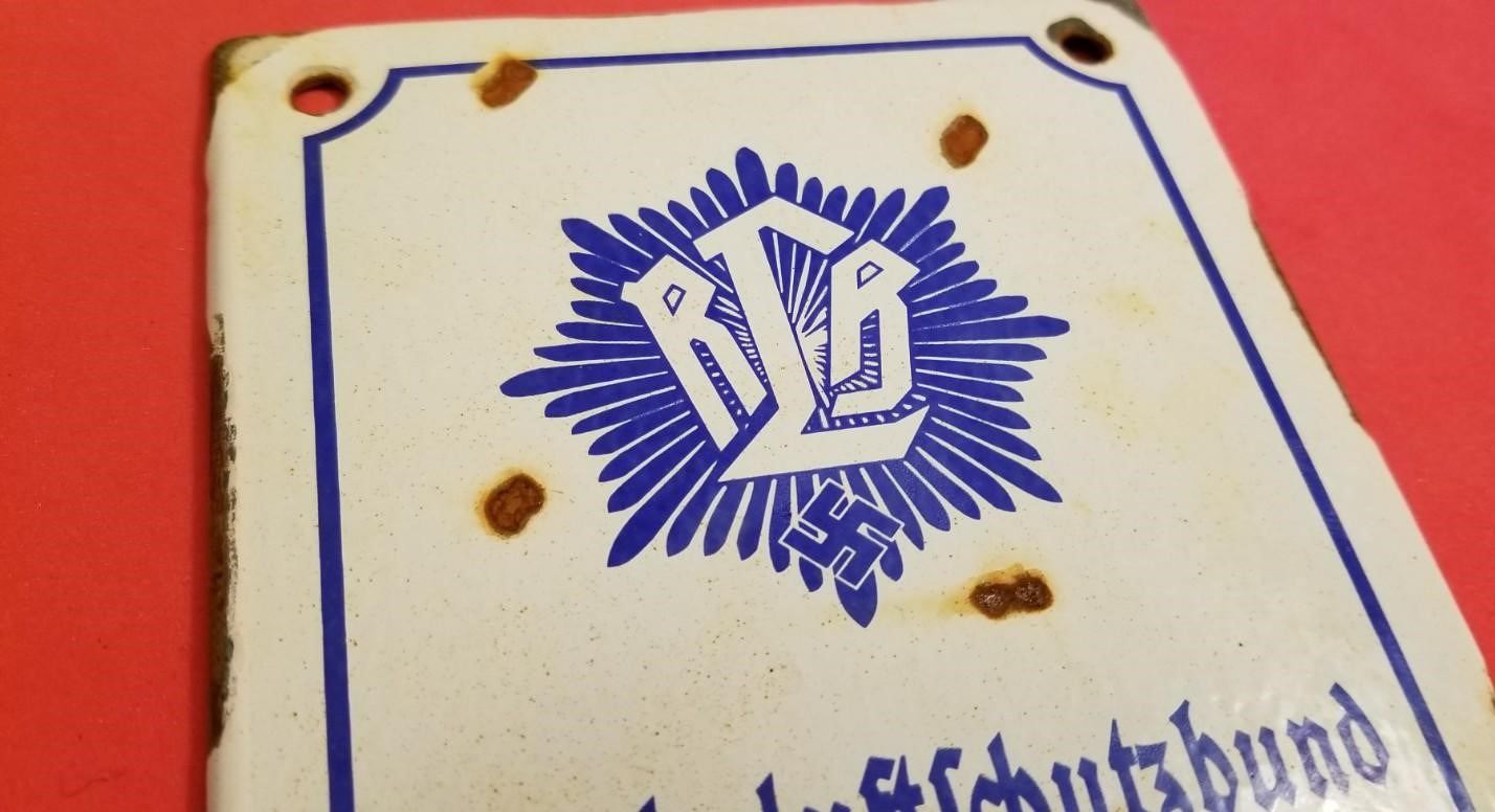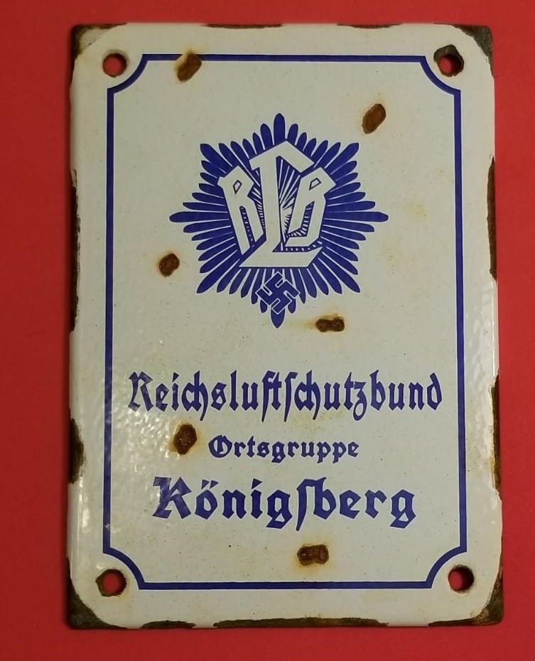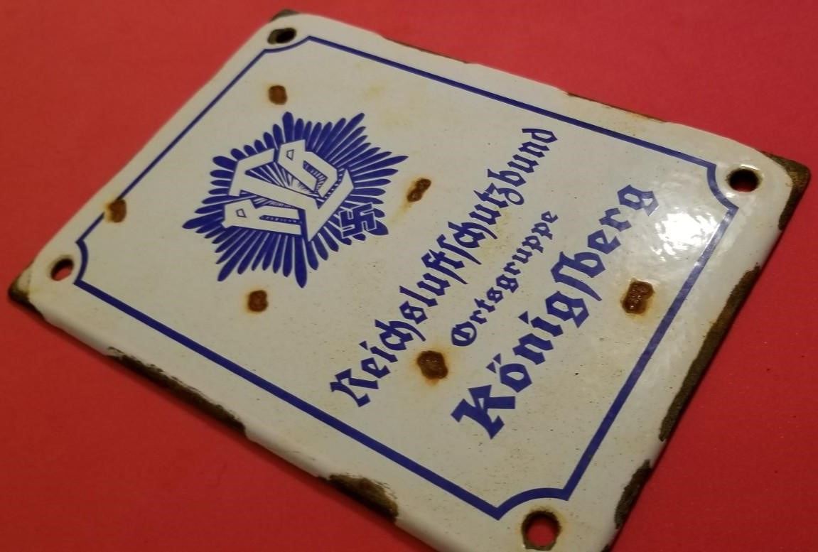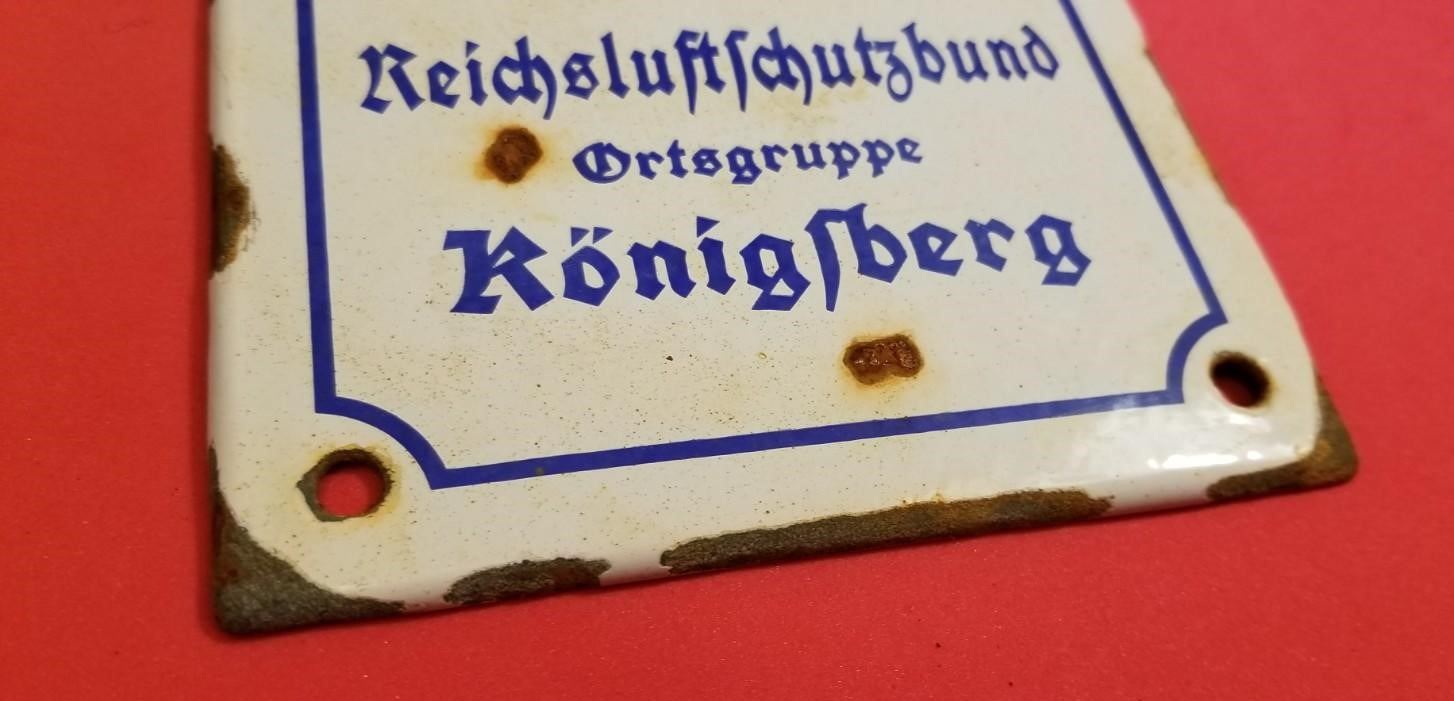 WW2 WWII Nazi German RLB Luftschutz enamel Third Reich sign Konigsberg. Nice enamel sign for the Reichsluftschutzbund ortsgeruppe Konigsberg. Nice heavy sign in good/used condition w some chips as shown. It measures 6.5x5". Be sure and check out our other militaria and collectibles auctions for more items, we always combine shipping!