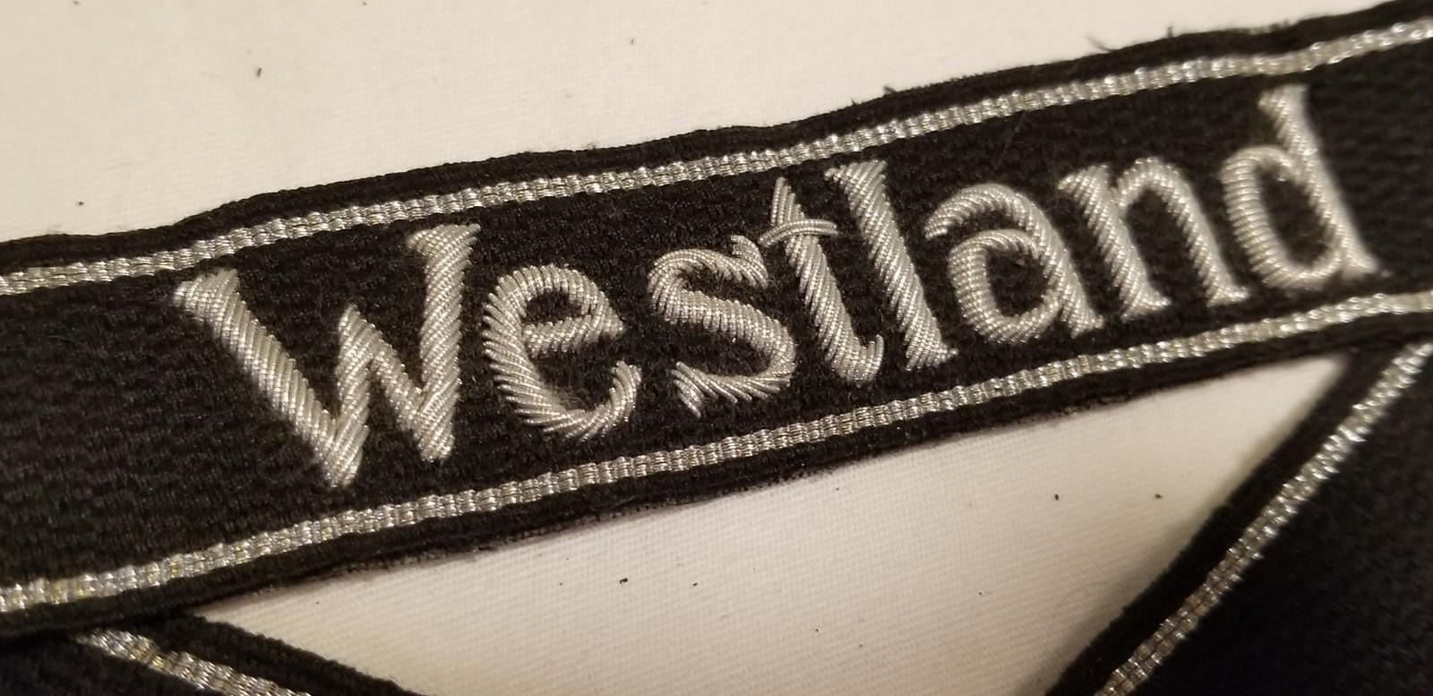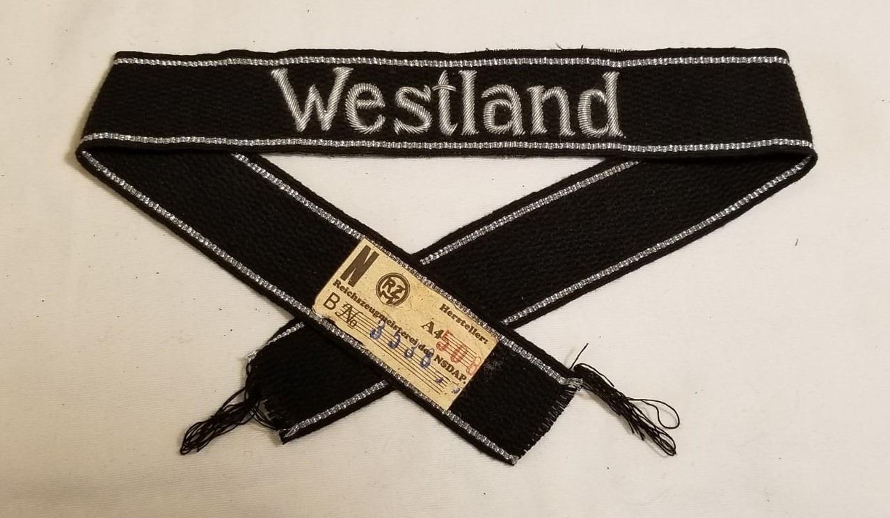 WW2 WWII Nazi German SS Third Reich Westland cuff title insignia. Nice embroidered cuff title with the silver bullion threads and RZM tag. VG condition as shown. Be sure and check out our other militaria and collectibles auctions for more military related items, we always combine shipping!