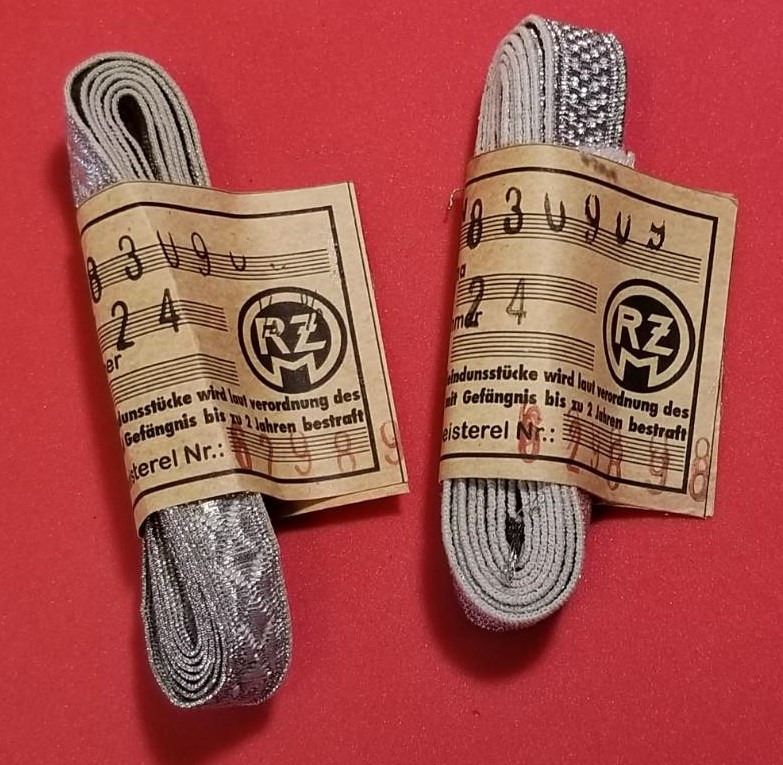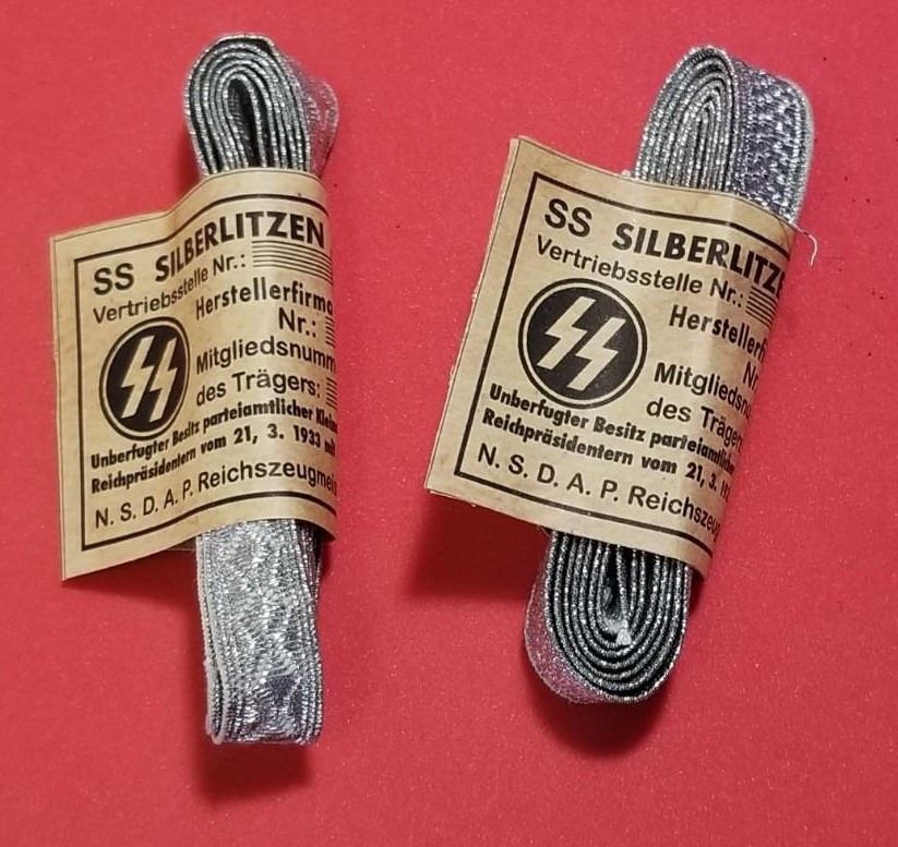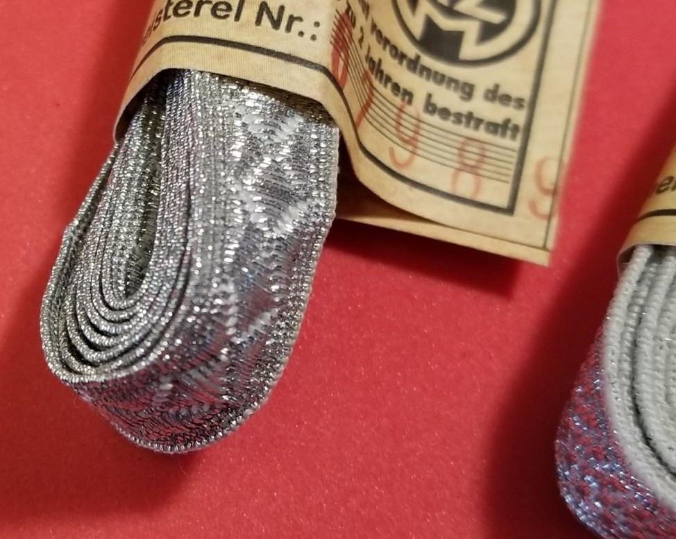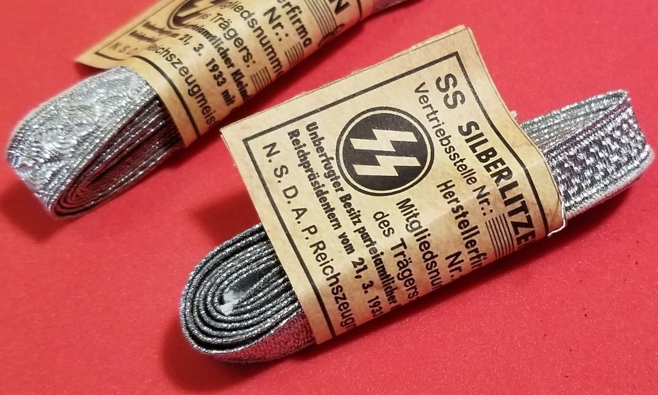 WW2 WWII Nazi German SS Tress bundles w RZM tags Third Reich Insignia. Nice lot of 2 bundles of SS silver tress or Silberlitzen. VG condition silver bullion for collar tabs, cuff titles, shoulder straps etc. Be sure and check out our other militaria and collectibles auctions for more Militaria, we always combine shipping!